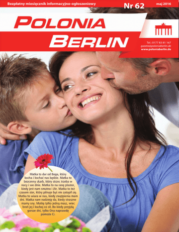 Bezpłatny miesięcznik informacyjno-ogłoszeniowy Nr 62 maj 2016 Tel.: 0177 83 81 167 [email protected] www.poloniaberlin.de Matka to dar od Boga, który kocha i kochać nas będzie. Matka to bezcenny skarb, który strzec trzeba w nocy i we dnie. Matka to na ranę plaster, kiedy jest nam smutno i źle. Matka to też czasem ster, który pilnuje byś nie zatopił się. Matka to wiara w nas, kiedy zwątpienia mam dni. Matka nam nadzieję da, kiedy straszne mamy sny. Matkę tylko jedną masz, wiec broń jej i kochaj co sił, Bo kiedy przyjdą gorsze dni, tylko Ona naprawdę pomoże Ci. Od lewej: przewodniczący Polskiej Rady Związku Krajowego w Berlinie Ferdynand Domaradzki, burmistrz dzielnicy Reinickendorf Frank Balzer, konsul generalny RP w Berlinie Marcin Jakubowski, szefowa biura burmistrza Margarete Pawelski CZŁOWIEK CZYNU W SPRAWIE FESTYNU 22 maja, przed Ratuszem Reinickendorf, już tradycyjnie po raz szósty, odbędzie się Festyn Dzień Polonii. Rozmawiam z Ferdynandem Domaradzkim, przewodniczącym Polskiej Rady Związku Krajowego w Berlinie, inicjatorem i głównym animatorem tego przedsięwzięcia. Pan Ferdynand znany ze swojej społecznej działalności na rzecz berlińskiej Polonii jest również posiadaczem sporego gospodarstwa rolnego w Lübars, gdzie odbyło się już wiele spotkań i imprez polonijnych, jak znane wielu Topienie Marzanny czy Latawce. Przd kilkoma dniami pan burmistrz dzielnicy Reinickendorf Frank Balzer, zaprosił organizatorów oraz konsula generalnego RP w Berlinie pana Marcina Jakubowskiego na robocze spotkanie dotyczące festynu. Omawiano bieżące problemy organizacyjne. Pan burmistrz deklarował istotną pomoc i gotowość do współpracy. G.G.: Co zamierzaliście osiągnąć, czemu miała służyć ta idea? F.D.: Przede wszystkim pokazaniu Polaków i naszego miejsca w Berlinie. Pokazaniu, że żyjemy tu, pracujemy. Prezentujemy nasz dorobek, nasze stowarzyszenia. Dlatego formuła spotkania jest otwarta. Zapraszamy zatem wszystkich do zaprezentowania swojej działalności stowarzyszeniowej, indywidualnej, zespołowej w tym dniu, wobec rodaków, ale także dla strony niemieckiej. region Polski. W tym roku jest to mazowiecka gmina Węgrów, czy są jakieś efekty tej prezentacji? F.D.: Od trzech lat zapraszamy partnerów z Polski. Zapraszamy te gminy lub te regiony, które uważamy za atrakcyjne, aby pokazały swoją kulturę, kuchnię, agroturystykę, jednym słowem ofertę turystyczną. Efekty tej prezentacji na pewno są. Wiele osób skorzystało, zaciekawiło się tymi miejscami. Na pewno zadziałał tu osobisty kontakt. G.G.: Każdego roku prezentujecie inny G.G.: W jaki sposób udało się namó- G.G.: Dlaczego nam, berlińskim Polakom, warto uczestniczyć czynni e lub biernie w tej imprezie, dlaczego warto przyjechać nawet z drugiego końca miasta? F.D.: Przede wszystkim jest okazja, by się spotkać, prywatnie, ale też dla wielu organizacji i stowarzyszeń, które otrzymują za darmo miejsce, gdzie mogą zaprezentować swą obecność w Berlinie, nawiązać lub odświeżyć kontakty. Ważne jest, aby pokazać nasz potencjał intelektualny, organizacyjny, ale przede wszystkim, że lubimy się spotykać pod polską flagą biało-czerwoną, że czujemy się w tym mieście normalnymi obywatelami. Mamy swoje korzenie, swoją kulturę i chcemy od czasu do czasu ją pokazać, a jest co, bo program artystyczny i oferta kulinarna są bardzo interesujące. Graża Grużewska: Kiedy i skąd pojawiła się idea Festynu Polonii? Ferdynand Domaradzki: Idea dnia Polonii powstała w gremium działaczy zarządu Polskiej Rady i ówczesnego konsula generalnego Mariusza Skórko, który szybko to podchwycił i bardzo poważnie się w to włączył. Dzień Polonii był od początku sprzęgnięty z datą 2 maja, świętem Polaków zamieszkałych poza granicami Polski i świętem Flagi Polskiej. Tekst, Foto: Graża Grużewska Ferdynand Domaradzki 2 wić do współpracy stronę niemiecką? F.D.: To była długa droga. Poprzednicy pana burmistrza Balcera traktowali nas, moim zdaniem, nie tak, jak byśmy sobie życzyli. Pojęcie zorganizowanej Polonii było im obce. W końcu zadziałały kontakty osobiste, ale też strona niemiecka w pewnym momencie doszła do wniosku, że jednak w Berlinie żyje duża grupa Polaków, potencjalnych wyborców i warto by było ich zauważyć i zacząć jakąś współpracę. W tej chwili rzeczywiście pomoc ratusza jest ogromna. Warto podkreślić wielkie zaangażowanie pana Balcera i całego jego aparatu w organizację festynu. www.poloniaberlin.de www.poloniaberlin.de SINGIELKA 125 – 128 Najbliższy tydzień serialowych bohaterów „Singielki” będzie obfitował w wiele niespodzianek. Ciekawe zaskoczenie spotka zarówno Olgierda, który spotka się z żoną, jak i załogę redakcji na wieść pewnej informacji dotyczącej Elki. Co jeszcze podkręci atmosferę? Zapraszamy do IITVN od poniedziałku do czwartku 2 – 5 maja o godz. 20.35 (CET – Berlin, Paryż) w ITVN. ciążowego. Niefortunnym zbiegiem okoliczności Dorota zauważa badanie w rękach dziennikarki, dlatego Tomasz wypytuje redaktor, kto jest ojcem dziecka Singielki. Wieść o jej stanie kompletnie wytrąciła go z równowagi. Z kolei niczego nieświadoma panna Kowalik jedzie na reportaż z Konradem, na którym ma udawać jego żonę! Dodatkowo w wyniku nieporozumienia Andrzej nie domyśla się, że temat ojcostwa może dotyczyć właśnie jego. Księgowy odczytuje aluzje partnerki Sława postanawia utrzeć nosa mężowi, zaprasza go do domu, w którym właśnie jest Marcin. Olgierd nie kryje zdziwienia na widok nowego adoratora byłej partnerki, ale postanawia nie dać tego po sobie poznać. Plan jednak nie przynosi zamierzonego rezultatu, ponieważ dochodzi do starcia między mężczyznami. Natomiast Monika podejrzewa, że zaszła w ciążę i prosi Elkę o wsparcie podczas robienia testu SEKRETY LEKARZY – NOWY SEZON W nowym sezonie programu „Sekrety lekarzy” wi