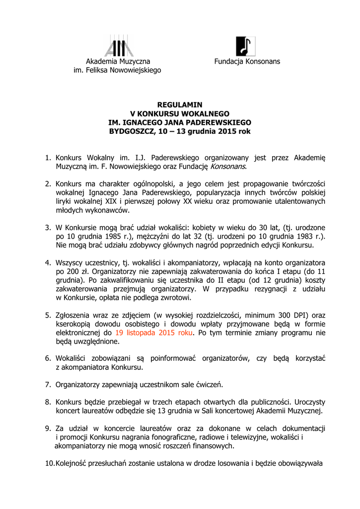 Akademia Muzyczna im. Feliksa Nowowiejskiego Fundacja Konsonans REGULAMIN V KONKURSU WOKALNEGO IM. IGNACEGO JANA PADEREWSKIEGO BYDGOSZCZ, 10 – 13 grudnia 2015 rok 1. Konkurs Wokalny im. I.J. Paderewskiego organizowany jest przez Akademię Muzyczną im. F. Nowowiejskiego oraz Fundację Konsonans. 2. Konkurs ma charakter ogólnopolski, a jego celem jest propagowanie twórczości wokalnej Ignacego Jana Paderewskiego, popularyzacja innych twórców polskiej liryki wokalnej XIX i pierwszej połowy XX wieku oraz promowanie utalentowanych młodych wykonawców. 3. W Konkursie mogą brać udział wokaliści: kobiety w wieku do 30 lat, (tj. urodzone po 10 grudnia 1985 r.), mężczyźni do lat 32 (tj. urodzeni po 10 grudnia 1983 r.). Nie mogą brać udziału zdobywcy głównych nagród poprzednich edycji Konkursu. 4. Wszyscy uczestnicy, tj. wokaliści i akompaniatorzy, wpłacają na konto organizatora po 200 zł. Organizatorzy nie zapewniają zakwaterowania do końca I etapu (do 11 grudnia). Po zakwalifikowaniu się uczestnika do II etapu (od 12 grudnia) koszty zakwaterowania przejmują organizatorzy. W przypadku rezygnacji z udziału w Konkursie, opłata nie podlega zwrotowi. 5. Zgłoszenia wraz ze zdjęciem (w wysokiej rozdzielczości, minimum 300 DPI) oraz kserokopią dowodu osobistego i dowodu wpłaty przyjmowane będą w formie elektronicznej do 19 listopada 2015 roku. Po tym terminie zmiany programu nie będą uwzględnione. 6. Wokaliści zobowiązani są poinformować organizatorów, czy będą korzystać z akompaniatora Konkursu. 7. Organizatorzy zapewniają uczestnikom sale ćwiczeń. 8. Konkurs będzie przebiegał w trzech etapach otwartych dla publiczności. Uroczysty koncert laureatów odbędzie się 13 grudnia w Sali koncertowej Akademii Muzycznej. 9. Za udział w koncercie laureatów oraz za dokonane w celach dokumentacji i promocji Konkursu nagrania fonograficzne, radiowe i telewizyjne, wokaliści i akompaniatorzy nie mogą wnosić roszczeń finansowych. 10. Kolejność przesłuchań zostanie ustalona w drodze losowania i będzie obowiązywała do końca Konkursu. Losowanie odbędzie się w dniu 10 grudnia 2015 w siedzibie Akademii Muzycznej. 11. Do II etapu Konkursu zostanie dopuszczonych nie więcej niż 10 wokalistów, do III - 5. 12. Przesłuchania konkursowe ocenia Jury, powołane przez władze Akademii. Jury pracuje w oparciu o odrębny regulamin. Obrady jury są tajne, a decyzje ostateczne. 13. Program Konkursu: Etap I a) dowolna pieśń kompozytora polskiego epoki I.J. Paderewskiego (lata 1860-1941); b) dowolna pieśń I.J. Paderewskiego. Etap II a) dwa utwory I.J. Paderewskiego ze zbioru 12 pieśni do poezji Catulle Mendèsa op. 22; b) dwie zróżnicowane stylistycznie pieśni Karola Szymanowskiego (jedna z opusów napisanych do 1910 roku, druga z opusów napisanych po 1911). Etap III a) pieśń I.J. Paderewskiego ze zbioru 6 pieśni do słów A. Mickiewicza op. 18; b) pieśń I.J. Paderewskiego ze zbioru 4 pieśni do słów A. Asnyka op. 7 c) trzy dowolnie wybrane utwory z dorobku wokalnego kompozytorów polskich epoki I.J. Paderewskiego (wykaz nazwisk kompozytorów wg załączonego aneksu). Uwagi do pkt. 13: a) w związku z przypadającą w 2015 roku 100. rocznicą urodzin Franciszka Maklakiewicza Jury Konkursu zaleca wykonanie jednej z jego pieśni; b) dopuszcza się możliwość transpozycji (z wyjątkiem "Pieśni Księżniczki z baśni" oraz "Słopiewni" Karola Szymanowskiego); c) kolejność wykonywania utworów w poszczególnych etapach jest dowolna. 14. W Konkursie zostaną przyznane laureatom następujące nagrody i wyróżnienia: I nagroda II nagroda III nagroda 7 000 zł 5 000 zł 3 000 zł I wyróżnienie II wyróżnienie 1 500 zł 1 000 zł Nagroda im. J. Lefelda dla najlepszego pianisty-akompaniatora - 2 000 zł Nagroda Specjalna za wykonanie pieśni I.J. Paderewskiego - 500 zł Nagroda Specjalna za wykonanie pieśni F. Maklakiewicza - 500 zł (wszystkie nagrody - brutto) oraz nagrody pozaregulaminowe w formie koncertów m. in. Nagroda Specjalna Towarzystwa im. Witolda Lutosławskiego za wykonanie pieśni W. Lutosławskiego dla laureata jednego z trzech pierwszych miejsc – półrecital podczas festiwalu ŁAŃCUCH XVII (informacje dotyczące warunków ubiegania się o nagrodę w aneksie) 15. Jury ma prawo zdecydować o innym podziale nagród. Aneks do regulaminu a) Przykładowy wykaz kompozytorów, których pieśni wchodzą do programu V Konkursu Wokalnego: Grażyna Bacewicz Tadeusz Baird Grzegorz Fitelberg Ignacy Friedman Witold Friemann Jerzy Gablenz Jan Gall Ludwik Grossman Zdzisław Jachimecki Henryk Jarecki Tadeusz Jarecki (syn) Tadeusz Joteyko Kazimierz Jurdziński Mieczysław Karłowicz Tadeusz Kassern Stanisław Kazuro Stefan Kisielewski Józef Koffler Jerzy Lefeld Stanisław Lipski Witold Lutosławski Feliks Roderyk Łabuński Franciszek Maklakiewicz Jan Maklakiewicz Witold Maliszewski Czesław Marek Piotr Maszyński Henryk Melcer-Szczawiński Emil Młynarski Feliks Nowowiejski Henryk Opieński Henryk Pachulski Ignacy Jan Paderewski Eugeniusz Pankiewicz Piotr Perkowski Marceli Popławski Stefan Bolesław Poradowski Gustaw Roguski Ludomir Różycki Antoni Wincenty Rutkowski Feliks Rybicki Piotr Rytel Kazimierz Sikorski Adam Sołtys Mieczysław Sołtys Roman Statkowski Antoni Stolpe Bolesław Szabelski Tadeusz Szeligowski Apolinary Szeluto Felicjan Szopski Karol Szymanowski Michał Świerzyński Aleksander Tansman Zbigniew Turski Bolesław Wallek-Walewski Stanisław Wiechowicz Aleksander Wielhorski Eugeniusz Morawski Karol Mroszczyk Stanisław Niewiadomski Zygmunt Noskowski Józef Wieniawski Bolesław Woytowicz Aleksander Zarzycki Władysław Żeleński b) Wykaz utworów W. Lutosławskiego (do wyboru) dla uczestników ubiegających się o nagrodę Towarzystwa im. Witolda Lutosławskiego: - Cykl Chantefleurs et Chantefables – sopran z fortepianem w opr. Eugeniusza Knapika, wydane przez PWM, (co najmniej 3 pieśni) - Tryptyk śląski na sopran i forte