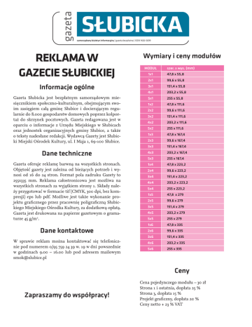 samorządowy biuletyn informacyjny | gazeta bezpłatna | ISSN 1426-5699 REKLAMA W GAZECIE SŁUBICKIEJ Informacje ogólne Gazeta Słubicka jest bezpłatnym samorządowym miesięcznikiem społeczno-kulturalnym, obejmującym swoim zasięgiem całą gminę Słubice i docierającym regularnie do 8.000 gospodarstw domowych poprzez kolportaż do skrzynek pocztowych. Gazeta redagowana jest w oparciu o informacje z Urzędu Miejskiego w Słubicach oraz jednostek organizacyjnych gminy Słubice, a także o teksty nadesłane redakcji. Wydawcą Gazety jest Słubicki Miejski Ośrodek Kultury, ul. I Maja 1, 69-100 Słubice. Dane techniczne Gazeta oferuje reklamę barwną na wszystkich stronach. Objętość gazety jest zależna od bieżących potrzeb i wynosi od 16 do 24 stron. Format pola zadruku Gazety to 255x335 mm. Reklama całostronicowa jest możliwa na wszystkich stronach za wyjątkiem strony 1. Składy należy przygotować w formacie tif (CMYK, 300 dpi, bez kompresji) eps lub pdf. Możliwe jest także wykonanie projektu graficznego przez pracownię poligraficzną Słubickiego Miejskiego Ośrodka Kultury, za dodatkową opłatą. Gazeta jest drukowana na papierze gazetowym o gramaturze 45 g/m2. Dane kontaktowe W sprawie reklam można kontaktować się telefonicznie pod numerem 0/95 759 24 39 w. 19 w dni powszednie w godzinach 9.00 – 16.00 lub pod adresem mailowym [email protected] Wymiary i ceny modułów MODUŁ szer. x wys. (mm) 1x1 47,8 x 55,8 2x1 99,6 x 55,8 3x1 151,4 x 55,8 4x1 203,2 x 55,8 5x1 255 x 55,8 1x2 47,8 x 111,6 2x2 99,6 x 111,6 3x2 151,4 x 111,6 4x2 203,2 x 111,6 5x2 255 x 111,6 1x3 47,8 x 167,4 2x3 99,6 x 167,4 3x3 151,4 x 167,4 4x3 203,2 x 167,4 5x3 255 x 167,4 1x4 47,8 x 223,2 2x4 99,6 x 223,2 3x4 151,4 x 223,2 4x4 203,2 x 223,2 5x4 255 x 223,2 1x5 47,8 x 279 2x5 99,6 x 279 3x5 151,4 x 279 4x5 203,2 x 279 5x5 255 x 279 1x6 47,8 x 335 2x6 99,6 x 335 3x6 151,4 x 335 4x6 203,2 x 335 5x6 255 x 335 Ceny Zapraszamy do współpracy! Cena pojedynczego modułu – 30 zł Strona 1 i ostatnia, dopłata 25 % Strona 3, dopłata 15 % Projekt graficzny, dopłata 20 % Ceny netto + 23 % VAT PRZYKŁADOWE MOŻLIWOŚCI ROZKŁADU MODUŁÓW 2 gazeta SŁUBICKA 3/2011 13 KWIETNIA gazeta SŁUBICKA 3/2011 PRZYKŁADOWE MOŻLIWOŚCI ROZKŁADU MODUŁÓW 13 KWIETNIA moduł 1x1 moduł 3x1 moduł 3x4 moduł 1x4 moduł 2x1 moduł 2x2 moduł 3x2 moduł 5x1 3