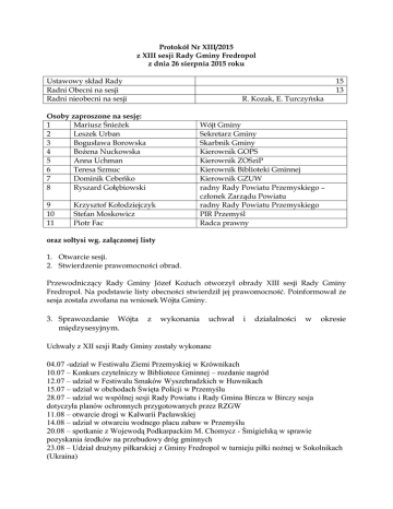 Protokół Nr XIII/2015 z XIII sesji Rady Gminy Fredropol z dnia 26