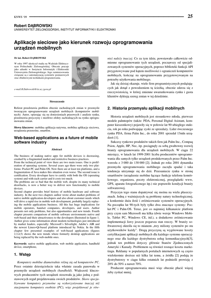 KNWS ‘09 25 Robert DĄBROWSKI UNIWERSYTET ZIELONOGÓRSKI, INSTYTUT INFORMATYKI I ELEKTRONIKI Aplikacje sieciowe jako kierunek rozwoju oprogramowania urządzeń mobilnych Dr inŜ. Robert DĄBROWSKI W roku 1997 ukończył studia na Wydziale Elektrycznym Politechniki Zielonogórskiej. Obecnie pracuje jako adiunkt w Instytucie Informatyki i Elektroniki Uniwersytetu Zielonogórskiego. Jego zainteresowania związane są z automatyzacją systemów pomiarowych oraz obiektowymi technikami programowania. e-mail:[email protected] nieŜ naleŜy inaczej. Co za tym idzie, powstawało całkowicie odmienne oprogramowanie tych urządzeń, począwszy od specjalizowanych systemów operacyjnych, poprzez biblioteki funkcji API przygotowywane pod kątem moŜliwości i ograniczeń komputerów mobilnych, kończąc na oprogramowaniu przygotowywanym na potrzeby uŜytkowania mobilnego. Jak się dzisiaj okazuje, wiele firm programistycznych podąŜających jak dotąd z powodzeniem tą ścieŜką, obecnie zderza się z rzeczywistością, w której zmienne uwarunkowania rynku i gusta klientów dyktują szereg zmian w tej dziedzinie. Streszczenie Referat przedstawia problem obecnie zachodzących zmian w przemyśle tworzącym oprogramowanie urządzeń mobilnych (komputerów mobilnych). Autor, opierając się na doniesieniach prasowych i analizie rynku, przedstawia przyczyny i moŜliwe efekty zachodzących na rynku oprogramowania zmian. Słowa kluczowe: mobilna aplikacja natywna, mobilna aplikacja sieciowa, urządzenia przenośne, smartfon. Web-based applications as a future of mobile software industry Abstract The business of making native apps for mobile devices is decreasing, crushed by a fragmented market and restrictive business practices. From the technical point of view there are two main issues. One is proliferation of operating systems. Several years ago there were only two platforms: Pocket PC and Palm OS. Now there are at least ten platforms, and a fragmentation of Java makes this situation even worse. The second issue is certification. Every developer have to certify with both the OS (operating system) and with each carrier and it costs too much. The problems are so bad that the mobile web, despite its many technical drawbacks, is now a better way to deliver new functionality to mobile devices. Second chapter provides brief history of mobile hardware and software industry. In the next two chapters author wrote about market problems of native mobile application developers and also about customer needs which will drive a rapid rise in mobile web development, probably largely replacing the mobile applications business. All this has huge implications for mobile operators, handset companies, developers, and users. Author presents not only problems, but also opportunities and new trends. Fourth chapter presents comparison of mobile software environments native and web-based and their attractiveness to the developers illustrated in figure 1. Author gives some information about modern technologies just introduced by market leaders, especially: Microsoft’s Silverlight, Adobe’s AIR and the newest Linux+Qt-based platform introduced by Nokia. In the fifth chapter few presented examples of web-based applications (figures 2,3,4,5) shows the new trends where formerly desktop applications are being replaced by the web-mobile ones. Keywords: native mobile application, web mobile application, handheld device, smartphone, 1. Wstęp Komputery mobilne diametralnie róŜną się od komputerów PC. Przez ostatnie dziesięciolecie taka właśnie zasada panowała w przemyśle urządzeń mobilnych (handheld). Większość kluczowych producentów tych urządzeń stosowała ją jako jedną z podstawowych reguł projektowania swoich produktów. Skoro specjalizowane komputery przenośne są wykorzystywane inaczej niŜ stacjonarne komputery osobiste (PC), więc projektować je rów- 2. Historia przemysłu aplikacji mobilnych Historia urządzeń mobilnych jest stosunkowo młoda, pierwsze modele palmtopów (takŜe: PDA, Personal Digital Asistant, komputer kieszonkowy) pojawiły się w połowie lat 90 ubiegłego stulecia, rok po roku podwajając zyski ze sprzedaŜy. Lider ówczesnego rynku PDA, firma Palm Inc., do roku 2001 sprzedał 13mln urządzeń [1]. Sukcesy rynkowe produktów takich firm jak Palm Inc., Compaq Psion, Apple, HP, Nec, itp. pociągnęły za sobą gwałtowny rozwój branŜy oprogramowania dla urządzeń mobilnych. W ciągu 22 miesięcy, w latach lat 1999-2001 liczba producentów oprogramowania dla samych tylko urządzeń produkowanych przez Palm Inc. wzrosła z 3 000 do 130 000 [2]. Jednak po roku 2001 dynamika przemysłu oprogramowania mobilnego zaczęła spadać i taka tendencja utrzymuje się do dziś. Przesuniecie rynku w stronę smartfonów (urządzenie mobilne łączące funkcje telefonu komórkowego, organizera, poczty elektronicznej, przeglądarki www, GPS, aparatu fotograficznego itp.) nie poprawiło kondycji branŜy softwareowej. Przyczyn tego stanu dopatrywać się moŜna na wielu płaszczyznach. Jedną z waŜniejszych są problemy natury technologicznej, a konkretnie duŜa ilość i zróŜnicowanie systemów operacyjnych. Na początku lat 90-tych były tylko dwa znaczące systemy: Pocket PC i Palm OS. Teraz, jest co najmniej kilkanaście platform przy czym sam Microsoft ma kilka (dwie wersje Windows Mobile, Tablet PC, Windows CE, itd.), a dodatkowe zróŜnicowanie implementacji Jawy jeszcze pogarsza stan rzeczy. W branŜy softwareowej określa się to mianem „trzy miliony systemów po stu uŜytkowników kaŜdy”. Drugą przyczyną są wygórowane koszty certyfikacjami aplikacji mobilnych dla kaŜdego systemu operacyjnego oraz dla kaŜdego dystrybutora usług komunikacyjnych[3], jednak ten problem dotyczy głównie Stanów Zjednoczonych Ameryki i Kanady. Problemem są równieŜ rosnące koszta marketingu. Reklamy w popularnych portalach internetowych są często wielokrotnie droŜsze niŜ kilka lat temu,