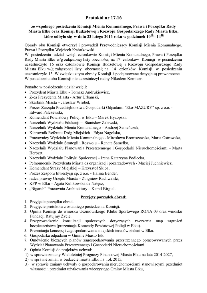 Protokół nr 17.16 ze wspólnego posiedzenia Komisji Mienia Komunalnego, Prawa i Porządku Rady Miasta Ełku oraz Komisji Budżetowej i Rozwoju Gospodarczego Rady Miasta Ełku, które odbyło się w dniu 22 lutego 2016 roku w godzinach 1000– 1410 Obrady obu Komisji otworzył i prowadził Przewodniczący Komisji Mienia Komunalnego, Prawa i Porządku Wojciech Kwiatkowski. W posiedzeniu udział wzięli członkowie Komisji Mienia Komunalnego, Prawa i Porządku Rady Miasta Ełku w/g załączonej listy obecności; na 17 członków Komisji w posiedzeniu uczestniczyło 16 oraz członkowie Komisji Budżetowej i Rozwoju Gospodarczego Rady Miasta Ełku w/g załączonej listy obecności; na 14 członków Komisji w posiedzeniu uczestniczyło 13. W związku z tym obrady Komisji i podejmowane decyzje są prawomocne. W posiedzeniu obu Komisji nie uczestniczył radny Nikodem Kemicer. Ponadto w posiedzeniu udział wzięli: Prezydent Miasta Ełku - Tomasz Andrukiewicz, Z-ca Prezydenta Miasta - Artur Urbański, Skarbnik Miasta – Jarosław Wróbel, Prezes Zarządu Przedsiębiorstwa Gospodarki Odpadami "Eko-MAZURY" sp. z o.o. Edward Palczewski, Komendant Powiatowy Policji w Ełku – Marek Hyzopski, Naczelnik Wydziału Edukacji – Stanisław Zalewski, Naczelnik Wydziału Mienia Komunalnego – Andrzej Semeńczuk, Kierownik Referatu Dróg Miejskich - Edyta Nagolska, Pracownicy Wydziału Mienia Komunalnego - Mirosława Broniszewska, Maria Ostrowska, Naczelnik Wydziału Strategii i Rozwoju – Renata Samełko, Naczelnik Wydziału Planowania Przestrzennego i Gospodarki Nieruchomościami – Marta Herbszt, Naczelnik Wydziału Polityki Społecznej – Irena Katarzyna Podlecka, Pełnomocnik Prezydenta Miasta ds organizacji pozarządowych - Maciej Juchniewicz, Komendant Straży Miejskiej – Krzysztof Skiba, Prezes Zespołu Inwestycji sp. z o.o. - Halina Bender, radca prawny Urzędu Miasta – Zbigniew Rachwalski, KPP w Ełku – Agata Kulikowska de Nałęcz, „Bigarch” Pracownia Architektury – Kamil Birgiel. Przyjęty porządek obrad: 1. Przyjęcie porządku obrad. 2. Przyjęcie protokołu z ostatniego posiedzenia Komisji. 3. Opinia Komisji do wniosku Uczniowskiego Klubu Sportowego RONA 03 oraz wniosku Fundacji Ratujmy Życie. 4. Przeprowadzenie konsultacji społecznych dotyczących tworzenia map zagrożeń bezpieczeństwa (prezentacja Komendy Powiatowej Policji w Ełku). 5. Prezentacja koncepcji zagospodarowania miejskich terenów zieleni w Ełku. 6. Gospodarka odpadami w Gminie Miasto Ełk. 7. Omówienie bieżących planów zagospodarowania przestrzennego opracowywanych przez Wydział Planowania Przestrzennego i Gospodarki Nieruchomościami. 8. Opinia Komisji do projektów uchwał: 1) w sprawie zmiany Wieloletniej Prognozy Finansowej Miasta Ełku na lata 2014-2027, 2) w sprawie zmian w budżecie miasta Ełku na rok 2015, 3) w sprawie zmiany uchwały o gospodarowaniu nieruchomościami stanowiącymi przedmiot własności i przedmiot użytkowania wieczystego Gminy Miasta Ełku, 4) w sprawie zmiany uchwały o wyrażeniu zgody na udzielenie przez Prezydenta Miasta Ełku bonifikaty od opłaty za przekształcenie prawa użytkowania wieczystego w prawo własności, 5) zmieniająca uchwałę w sprawie udostępnienia przystanków komunikacyjnych, 6) w sprawie opłaty targowej, 7) upoważnienia Prezydenta Miasta Ełku do złożenia wniosku o dofinansowanie oraz przyjęcia do realizacji projektu pod nazwą „poprawa jakości środowiska miejskiego poprzez zwiększenie powierzchni terenów zieleni w mieście Ełk”. 9. Sprawozdanie z wysokości średnich wynagrodzeń nauczycieli na poszczególnych stopniach awansu zawodowego w szkołach i placówkach prowadzonych przez Gminę Miasto Ełk. 10. Sprawozdanie z działalności Środowiskowego Domu Samopomocy „Pod Kasztanami” w Ełku. 11. Sprawy różne i wolne wnioski. Do punktu 1 Przewodniczący Komisji Mienia Komunalnego, Prawa i Porządku Wojciech Kwiatkowski zapoznał zebranych z propozycją porządku obrad obu Komisji. Członkowie obu Komisji nie wnieśli uwag i jednomyślnie, poprzez aklamację przyjęli proponowany porządek obrad jw. Do punktu 2 Przewodniczący Komisji Mienia Komunalnego, Prawa i Porządku Wojciech Kwiatkowski zwrócił się o zgłaszanie uwag do protokółu z poprzedniego posiedzenia Komisji, zarówno Komisji Mienia Komunalnego, Prawa i Porządku jak i Komisji Budżetowej i Rozwoju Gospodarczego Członkowie Komisji Mienia Komunalnego, Prawa i Porządku nie zgłosili uwag i jednomyślnie – poprzez aklamację przyjęli protokół Nr 15.16 z dnia 22 stycznia 2016 roku z ostatniego posiedzenia Komisji. Członkowie Komisji Budżetowej i Rozwoju Gospodarczego nie zgłosili uwag i jednomyślnie – poprzez aklamację przyjęli protokół Nr 16.16 z dnia 25 stycznia 2016 roku z ostatniego posiedzenia Komisji. Do punktu 3 Pełnomocnik Prezydenta Miasta ds organizacji pozarządowych Maciej Juchniewicz omówił wniosek Uczniowskiego Klubu Sportowego RONA 03, złożonego na realizację zadania publicznego miasta Ełku z zakresu budowy, rozbudowy lub remontu dróg, kanalizacji, sieci wodociągowej, budynków oraz obiektów architektury stanowiących własność jednostek samorządu terytorialnego oraz w zakresie działalności w sferze kultury fizycznej i turystyki pt.: „Nowa Sportowa”, w ramach inicjatywy lokalnej. Celem inicjatywy jest wykonanie płoty wokół działki, na której znajdował się stadion piłkarski. Co zapewni bezpieczeństwo i porządek na tym terenie. Wywiązała się dyskusja. Przedstawiciel Klubu RONA 03 Bartłomiej Koniecko powiedział, że klub użytkuje teren należący do miasta od 8-10 lat. Jest to na razie takie „dzikie” miejsce. Chcielibyśmy zagospodarować teren wokół działki, na której znajdował się stadion piłkarski i wykonać ogrodzenie w celu zapewnienia bezpieczeństwa i porządku na tym terenie. Obecnie jest to prawie 2 ha wyrównane miejsce trawiaste, na którym można przeprowadzać treningi pił