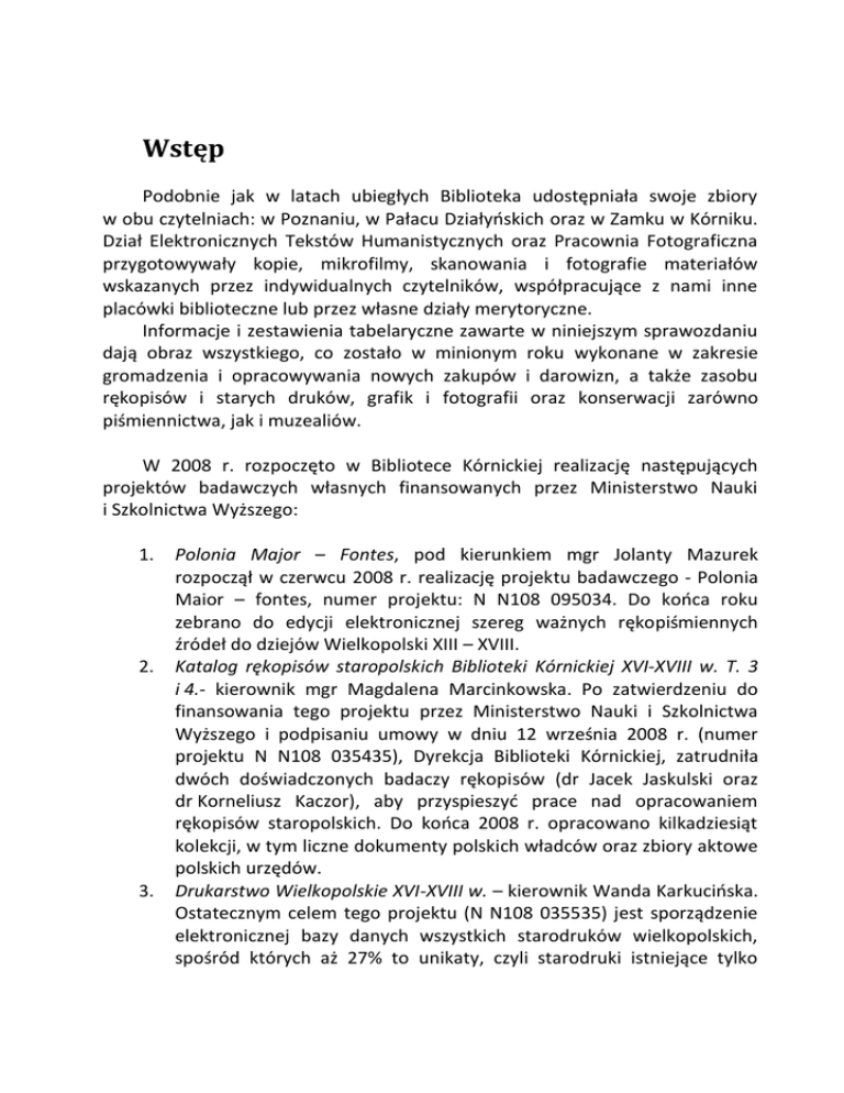 Wstęp Podobnie jak w latach ubiegłych Biblioteka udostępniała swoje zbiory w obu czytelniach: w Poznaniu, w Pałacu Działyoskich oraz w Zamku w Kórniku. Dział Elektronicznych Tekstów Humanistycznych oraz Pracownia Fotograficzna przygotowywały kopie, mikrofilmy, skanowania i fotografie materiałów wskazanych przez indywidualnych czytelników, współpracujące z nami inne placówki biblioteczne lub przez własne działy merytoryczne. Informacje i zestawienia tabelaryczne zawarte w niniejszym sprawozdaniu dają obraz wszystkiego, co zostało w minionym roku wykonane w zakresie gromadzenia i opracowywania nowych zakupów i darowizn, a także zasobu rękopisów i starych druków, grafik i fotografii oraz konserwacji zarówno piśmiennictwa, jak i muzealiów. W 2008 r. rozpoczęto w Bibliotece Kórnickiej realizację następujących projektów badawczych własnych finansowanych przez Ministerstwo Nauki i Szkolnictwa Wyższego: 1. 2. 3. Polonia Major – Fontes, pod kierunkiem mgr Jolanty Mazurek rozpoczął w czerwcu 2008 r. realizację projektu badawczego - Polonia Maior – fontes, numer projektu: N N108 095034. Do kooca roku zebrano do edycji elektronicznej szereg ważnych rękopiśmiennych źródeł do dziejów Wielkopolski XIII – XVIII. Katalog rękopisów staropolskich Biblioteki Kórnickiej XVI-XVIII w. T. 3 i 4.- kierownik mgr Magdalena Marcinkowska. Po zatwierdzeniu do finansowania tego projektu przez Ministerstwo Nauki i Szkolnictwa Wyższego i podpisaniu umowy w dniu 12 września 2008 r. (numer projektu N N108 035435), Dyrekcja Biblioteki Kórnickiej, zatrudniła dwóch doświadczonych badaczy rękopisów (dr Jacek Jaskulski oraz dr Korneliusz Kaczor), aby przyspieszyd prace nad opracowaniem rękopisów staropolskich. Do kooca 2008 r. opracowano kilkadziesiąt kolekcji, w tym liczne dokumenty polskich władców oraz zbiory aktowe polskich urzędów. Drukarstwo Wielkopolskie XVI-XVIII w. – kierownik Wanda Karkucioska. Ostatecznym celem tego projektu (N N108 035535) jest sporządzenie elektronicznej bazy danych wszystkich starodruków wielkopolskich, spośród których aż 27% to unikaty, czyli starodruki istniejące tylko 4. 5. w jednym egzemplarzu. Do kooca 2008 r. znaczną częśd materiałów zebranych w wyniku kwerendy przekształcono w rekordy przyszłej bazy danych. Dziennik barona Tassila von Heydebranda z podróży dookoła świata – kierownik Maria Łuczak; (N N108 252335). CACAO – Cross-language Acces to Catalogues and on-line libraries. Projekt z grudnia 2007 roku, współfinansowany przez Unię Europejską, mający na celu zapewnienie wielojęzycznego dostępu do katalogów on-line bibliotek oraz do zamieszczanych przez nie treści cyfrowych. W 2008 r. Biblioteka Kórnicka podjęła starania o uzyskanie nowych grantów naukowych i włączyła się wraz z innymi bibliotekami i jednostkami naukowymi w prace, których celem było wygenerowanie programu strategicznego, którego realizacja obejmowałaby digitalizację m. in. najcenniejszych zbiorów bibliotecznych w Polsce. Z prac inwestycyjnych należy przede wszystkim wymienid wykonane w koocu grudnia 2008 r. prace renowacyjne ściany bocznej Pałacu Działyoskich od strony ulicy Franciszkaoskiej. Prace te były sfinansowane przez Konserwatora Miejskiego, Panią mgr Marię Strzałko. Ze skromnych funduszy Biblioteki Kórnickiej dokonano wymiany od strony ulicy. Franciszkaoskiej starych rynien na nowe miedziane. Nie udało się niestety pozyskad środków na remont mostu zamkowego, zamkniętego we wrześniu 2008 r. przez Powiatowy Urząd Nadzoru Budowlanego. Obiecane pieniądze z rezerwy budżetu paostwa (1 milion złotych) nigdy nie dotarły do Biblioteki Kórnickiej. W grudniu 2008 r. BKPAN złożyła wniosek o sfinansowanie tego remontu do kilku instytucji, w tym też do Starostwa Powiatowego w Poznaniu. W 2008 r. udało się sporządzid wszelką dokumentację konieczną do przeprowadzenia renowacji tegoż mostu. Nie było to łatwe ze względu na brak odpowiednich funduszy. W ramach prac przygotowawczych do planowanej rewitalizacji przedsiębiorstwa PGNiG i Enea doprowadziły do zamku Kórnickiego nowe łącza gazowe i elektryczne, usuwając tym samym zagrożenie katastrofą w wypadku zawalenia się mostu. Rok 2008 był niezwykle trudny pod względem finansowym ze względu na chroniczny brak funduszy, otrzymywanych z budżetu paostwa. Z tej trudnej sytuacji Biblioteka Kórnicka PAN starała się wyjśd poprzez uzyskanie dodatkowych funduszy z projektów naukowych, z dotacji Fundacji „Zakłady Kórnickie” i z ciągłego poszukiwania oszczędności. Dzięki pozyskaniu grantów udało się zakupid nową infrastrukturę informatyczną (komputery, drukarki, 2 serwery), wsparcie „Zakładów Kórnickich” pozwoliło na dodatkowe zakupy książek oraz na sfinansowanie wykonania dokumentacji remontowych; reforma telefonii oraz bardzo dobre działanie Komisji Zakupów przyczyniło się do obniżenia niektórych kosztów. Najważniejszym sukcesem było wprowadzenie do pakietu ustaw dotyczących nauki przepisów przewidujących finansowanie Biblioteki Kórnickiej PAN w przyszłości przez MNiSW w ramach dwóch strumieni finansowania, przy jednoczesnym pozostawieniu Biblioteki w ramach struktur PAN-u. Nowe zasady finansowania – jeżeli nie zajdą jakieś nieprzewidziane okoliczności – będą obowiązywad od 2010 r. I. Sprawy organizacyjne 1. Statut Biblioteki Aktualnym i nadal obowiązującym pozostaje statut nadany Bibliotece Kórnickiej w drodze decyzji nr 76 Prezesa Polskiej Akademii Nauk z dnia 29 grudnia 2006 r. To dokument kluczowy w kwestii zasad codziennego funkcjonowania tak ważnej i zasłużonej dla kultury narodowej placówki, jaką bez wątpienia jest Biblioteka Kórnicka. Mimo upływu czasu nie doczekaliśmy się jednak oczekiwanego od wielu lat załącznika do decyzji Prezesa PAN oddającej nam w zarząd, bądź inną formę użytkowania te zabytkowe nieruchomości w Kórniku i Poznaniu, k