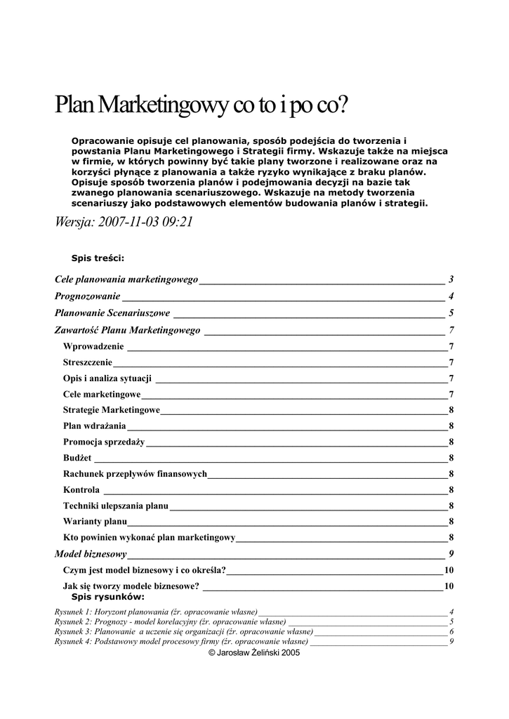 Plan Marketingowy co to i po co? Opracowanie opisuje cel planowania, sposób podejścia do tworzenia i powstania Planu Marketingowego i Strategii firmy. Wskazuje także na miejsca w firmie, w których powinny być takie plany tworzone i realizowane oraz na korzyści płynące z planowania a także ryzyko wynikające z braku planów. Opisuje sposób tworzenia planów i podejmowania decyzji na bazie tak zwanego planowania scenariuszowego. Wskazuje na metody tworzenia scenariuszy jako podstawowych elementów budowania planów i strategii. Wersja: 2007-11-03 09:21 Spis treści: Cele planowania marketingowego ________________________________________________ 3 Prognozowanie _______________________________________________________________ 4 Planowanie Scenariuszowe _____________________________________________________ 5 Zawartość Planu Marketingowego _______________________________________________ 7 Wprowadzenie ____________________________________________________________________ 7 Streszczenie _______________________________________________________________________ 7 Opis i analiza sytuacji ______________________________________________________________ 7 Cele marketingowe _________________________________________________________________ 7 Strategie Marketingowe _____________________________________________________________ 8 Plan wdrażania ____________________________________________________________________ 8 Promocja sprzedaży ________________________________________________________________ 8 Budżet ___________________________________________________________________________ 8 Rachunek przepływów finansowych___________________________________________________ 8 Kontrola _________________________________________________________________________ 8 Techniki ulepszania planu ___________________________________________________________ 8 Warianty planu____________________________________________________________________ 8 Kto powinien wykonać plan marketingowy _____________________________________________ 8 Model biznesowy ______________________________________________________________ 9 Czym jest model biznesowy i co określa? ______________________________________________ 10 Jak się tworzy modele biznesowe? ___________________________________________________ 10 Spis rysunków: Rysunek 1: Horyzont planowania (źr. opracowanie własne) ____________________________________________ 4 Rysunek 2: Prognozy - model korelacyjny (źr. opracowanie własne) _____________________________________ 5 Rysunek 3: Planowanie a uczenie się organizacji (źr. opracowanie własne) _______________________________ 6 Rysunek 4: Podstawowy model procesowy firmy (źr. opracowanie własne) ________________________________ 9 © Jarosław Żeliński 2005 Jarosław Żeliński - Plan Marketingowy co to i po co? Rysunek 5: Model biznesowy (opr. własne autora) __________________________________________________ 11 Rysunek 6: Łańcuch wartości (opr. własne autora) __________________________________________________ 11 2/12 Jarosław Żeliński - Plan Marketingowy co to i po co? C Ceellee ppllaannoow waanniiaa m maarrkkeettiinnggoow weeggoo O planach marketingowych krążą różne mity: od twierdzeń, że jest do niczego nie potrzebny do opinii, że musi to być zacna gruba książka. Moim zdaniem jedno i drugie to duży błąd. Gdyż: lepszy zły plan od braku planu, nikt nie będzie czytał, a tym bardziej uczciwie realizował, grubych i nudnych dokumentów, Robienie planów ma jeszcze dodatkową ogromną zaletę: zmusza do zastanowienia się nad całością biznesu firmy. Często jest tak, że niektóre obszary działalności firmy, szczególnie elementy jej oferty, traktujemy „na oko” i nie „ruszamy” tego bo wygląda nieźle. Bez dokładnej analizy nie możemy jednak np. podejmować decyzji o tym czy np. utrzymywać dany produkt w ofercie. Po drugie w wielu przypadkach firmy idą na łatwiznę i posługują się jedynie budżetem. Tworzenie budżetów (zarówno części kosztowych jak i przychodowych) w wielu firmach odbywa się za pomocą tak zwanego „przedłużania trendu”. Planowanie w ten sposób np. przychodów jest w miarę bezpieczne w przypadku ustabilizowanego rynku, ewentualnie na rynkach dóbr powszechnego użytku gdzie wartość rynku zmienia się mniej lub bardziej ale proporcjonalnie do PKB, średnich przychodów itp. Ta metoda jednak nie daje się bezpiecznie stosować tam, gdzie rynek zleży od szybko zmieniających się technologii i w środowisku gdzie trendy zmieniają się okresie krótszym niż okres planowania. Używanie tej metody do prognoz wykraczających poza jeden rok w ogóle jest moim zdaniem nieporozumieniem. Dlatego wykonanie Planu Marketingowego z prawdziwego zdarzenia daje nam po pierwsze mocne uzasadnienie dla budżetu a po drugie solidny plan pracy na najbliższy rok. Daje także podstawy do tworzenia scenariuszy na lata następne. Milcząco zakładam, że Plan Marketingowy robi się na rok, okresy dłuższe opisuje się raczej za pomocą Strategii a nie Planu. Są także opinie, że Plan Marketingowy może obejmować okres np. trzech lat. Ja jednak uważam, że obecne tempo zmian na rynku wymagałoby tworzenia trzyletnich planów ale o wielu scenariuszach jeżeli miały by one być przydatne. W efekcie proces planowania staje znacznie droższy a jego skuteczność nie wiele większa zakładając, że dobry plan ma wbudowane mechanizmy do jego modyfikacji. Dlatego uważam, że obecnie optymalnym okresem, który obejmuje Plan Marketingowy to rok obrachunkowy. Okres dłuższy powinien być opisany Strategią. 3/12 Jarosław Żeliński - Plan Marketingowy co to i po co? Horyzont planowania - granica planu, scenariusza, prognozy Prognozy (nadzieje) Scenariusze Planowanie wielkość/liczba liczba elementów niepewnych liczba elementów z góry określonych czas Rysunek 1: Horyzont planowania (źr. opracowanie własne) Strategia czyli plan długoterminowy powinny być raczej opisem c