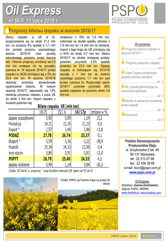 Oil Express nr 58-II, 11 lipca 2016 r. Prognozy bilansu rzepaku w sezonie 2016/17 Zbiory rzepaku w UE w br. prognozowane są na około 21,2 mln ton, co oznacza 5% spadek o 1,1 mln ton poniżej poziomu poprzedniego sezonu 2015/16 oraz poniżej rekordowego poziomu przed dwoma laty. Obecne prognozy produkcji są 0,5 mln ton mniejsze niż na początku czerwca br. W sezonie 2016/17 podaż rzepaku w UE28 zmniejszy się o 5% do 25,4 mln ton. W sezonie 2015/16 redukcja produkcji spowodowała ograniczenie importu. W nowym sezonie 2016/17 zapowiada się 12% redukcja przywozu rzepaku z poza UE do około 3 mln ton. Import rzepaku z Australii powinien się zwiększyć o 18% do 1,9 mln ton, natomiast na skutek spadku zbiorów z 1,9 mln ton do 1,4 mln ton na Ukrainie, import z tego kraju do UE zmniejszy się o 40% do około 0,7 mln ton. Sezon 2016/17 na skutek mniejszej podaży powinien przynieść 3,4% spadek przerobu do 23,5 mln ton. Zapasy rzepaku w kończącym się 2015/16 wzrosły z 1 mln ton do średnio wysokiego poziomu 1,1 mln ton pod koniec czerwca br. Rozpoczęty sezon 2016/17 powinien przynieść 26% spadek zapasów do poziomu około 0,8 mln ton. W numerze: Prognozy bilansu rzepaku w sezonie 2016/17 …………..………….…….........str.1 Prognozy eksportu rzepaku ………..………….…................str.2 Copa Cogeca prognozuje spadek zbiorów oleistych ………..……………...............str. 2 KE przedłużyła licencję na stosowanie glifosatu …………… ……..…………....str. 3 Szkody w uprawach wywołane przez pogodę …………………………………str. 3 Notowania ………..……...………….…….str.4 Polskie Stowarzyszenie Producentów Oleju ul. Grzybowska 2 lok. 49 00-131 Warszawa tel.: 22 313 07 88 fax.: 22 436 39 66 e-mail: [email protected] www.pspo.com.pl Źródło: PSPO za Fammu Fapa na podst.Oil World Oil Express: Redakcja: Joanna Żuchniewicz Zdjęcia: PSPO, MRiRW, www.freefoto.pl, www.pixabay.com, PSPO Lipiec 2016 Strona 1 Oil Express nr 58-II, 11 lipca 2016 r. Prognozy eksportu rzepaku W następnym bieżącym sezonie 2016/17 globalny eksport rzepaku przewidywany jest na 13,5 mln ton (-6,5%), co oznacza najniższy poziom o 4 lat, głównie na skutek spadku podaży w Kanadzie, Ukrainie oraz Unii Europejskiej. Należy dodać, że ten poziom wywozu ma szansę na realizację pod warunkiem materializacji wzrostu (z 3 mln ton do 3,6 mln ton) jeszcze odległych czasowo zbiorów rzepaku w Australii wiosną 2017 roku. Niedobory surowca na rynkach międzynarodowych w nowym sezonie 2016/17 mogą być szczególnie dotkliwe dla Chin oraz UE ze względu na spadek produkcji u nich. Źródło: PSPO za Fammu Fapa Copa Cogeca prognozuje spadek zbiorów oleistych Nowe prognozy Copa i Cogeca dla UE-28 wskazują na spadek produkcji pszenicy miękkiej i roślin oleistych w tym roku, głównie ze względu na niekorzystne warunki meteorologiczne i coraz częstsze ataki szkodników i chorób. Publikacja tych danych nastąpiła po posiedzeniu grup roboczych „Zboża” i „Rośliny oleiste” Copa i Cogeca. Przewodniczący grupy roboczej „Zboża”, powiedział, że z najnowszych prognoz wynika, że produkcja pszenicy miękkiej spadła w tym roku o 3,5 proc., a plony są niższe. Jest to spowodowane głównie trudnymi warunkami pogodowymi wahającymi się od suszy do ulew w Europie Środkowej. Całkowita produkcja zbóż w UE-28 wzrosła nieznacznie, o 1,3 proc. w stosunku do zeszłego roku, jednak sytuacja pszenicy miękkiej i jęczmienia najprawdopodobniej się pogorszy i ostateczne wyniki zbiorów pewnie będą niższe. Prognozy obejmujące kukurydzę są również bardzo niepewne, gdyż sezon rozpoczął się późno, a nasłonecznienie było niskie. Wiele krajów doświadcza również poważnych problemów związanych z obecnością szkodników i chorób. Walka z nimi jest coraz trudniejsza ze względu na nabywanie odporności na środki ochrony roślin. Brakuje skutecznych środków ochrony roślin i zestawu narzędzi, które pozwoliłyby rolnikom na zarządzanie ryzykiem w gospodarstwie. Przewodniczący grupy roboczej „Rośliny oleiste” Copa i Cogeca podkreślił, że tegoroczna produkcja roślin oleistych w UE-28 spadła o 1,7 proc. w stosunku do roku 2015. Spadek o 5,1 proc. został odnotowany w przypadku rzepaku, częściowo ze względu na niekorzystne warunki meteorologiczne i coraz częściej występujące choroby i szkodniki. Zmniejszenie powierzchni upraw jest także konsekwencją unijnej polityki w zakresie pestycydów i wycofywania środków ochrony roślin. Debata na temat miejsca biopaliw w przyszłym pakiecie energetycznoklimatycznym jest źródłem braku pewności rolników, którym ciężko jest zdecydować, jakie uprawy chcieliby zebrać w 2017 r. Niemniej jednak, produkcja roślin białkowych w UE wzrosła o 5,7 proc. w stosunku do 2015 r., częściowo dzięki nowej WPR. Jest to dobra wiadomość dla unijnej branży hodowlanej. Źródło: PSPO za Farmer.pl PSPO Lipiec 2016 Strona 2 Oil Express nr 58-II, 11 lipca 2016 r. KE przedłużyła licencję na stosowanie glifosatu Komisja Europejska przedłużyła licencję na stosowanie glifosatu – substancji czynnej, która znajduje się w wielu herbicydach. W krajach unijnych glifosat będzie można używać przynajmniej do końca 2017 roku. O jego dalszych losach zdecyduje opinia Europejskiej Agencji Chemikaliów (ECHA). - Pomimo wysiłków podejmowanych przez Komisję Europejską państwa członkowskie nie były gotowe, by wziąć odpowiedzialność za decyzję w sprawie wydłużenia okresu autoryzacji glifosatu. W związku z tym Komisja postanowiła przedłużyć licencję na określony czas - do końca 2017 r. Pod koniec 2017 roku spodziewana jest dodatkowa opinia na temat właściwości tej substancji czynnej z Europejskiej Agencji Chemikaliów - wyjaśnił rzecznik KE ds. zdrowia i bezpieczeństwa żywności Enrico Brivio. I dodał, że opinia ECHA zostanie wzięta pod uwag