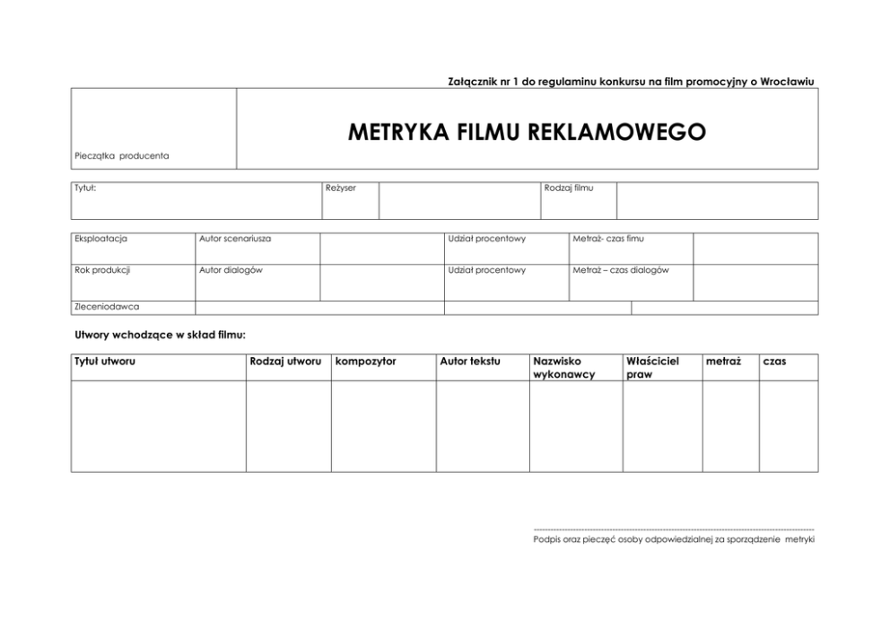 Załącznik nr 1 do regulaminu konkursu na film promocyjny o Wrocławiu METRYKA FILMU REKLAMOWEGO Pieczątka producenta Tytuł: Reżyser Rodzaj filmu Eksploatacja Autor scenariusza Udział procentowy Metraż- czas fimu Rok produkcji Autor dialogów Udział procentowy Metraż – czas dialogów Zleceniodawca Utwory wchodzące w skład filmu: Tytuł utworu Rodzaj utworu kompozytor Autor tekstu Nazwisko wykonawcy Właściciel praw metraż czas ---------------------------------------------------------------------------------------------------Podpis oraz pieczęć osoby odpowiedzialnej za sporządzenie metryki