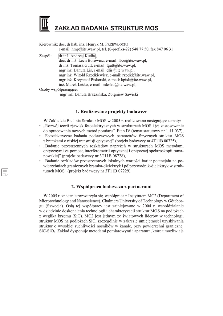 ZAK£AD BADANIA STRUKTUR MOS Kierownik: doc. dr hab. in¿. Henryk M. PRZEW£OCKI e-mail: [email protected], tel. (0-prefiks-22) 548 77 50, fax 847 06 31 Zespó³: dr in¿. Andrzej Kud³a , doc. dr in¿. Lech Borowicz, e-mail: [email protected], dr in¿. Tomasz Gutt, e-mail: [email protected], mgr in¿. Danuta Lis, e-mail: [email protected], mgr in¿. Witold Rzodkiewicz, e-mail: [email protected], mgr in¿. Krzysztof Piskorski, e-mail: [email protected], in¿. Marek Leœko, e-mail: [email protected], Osoby wspó³pracuj¹ce: mgr in¿. Danuta Brzeziñska, Zbigniew Sawicki 1. Realizowane projekty badawcze W Zak³adzie Badania Struktur MOS w 2005 r. realizowano nastêpuj¹ce tematy: • „Rozwój teorii zjawisk fotoelektrycznych w strukturach MOS i jej zastosowanie do opracowania nowych metod pomiaru”. Etap IV (temat statutowy nr 1.11.037), • „Fotoelektryczne badania podstawowych parametrów fizycznych struktur MOS z bramkami o niskiej transmisji optycznej” (projekt badawczy nr 4T11B 00725), • „Badanie przestrzennych rozk³adów naprê¿eñ w strukturach MOS metodami optycznymi za pomoc¹ interferometrii optycznej i optycznej spektroskopii ramanowskiej” (projekt badawczy nr 3T11B 08728), • „Badanie rozk³adów przestrzennych lokalnych wartoœci barier potencja³u na powierzchniach granicznych bramka-dielektryk i pó³przewodnik-dielektryk w strukturach MOS” (projekt badawczy nr 3T11B 07229). 2. Wspó³praca badawcza z partnerami W 2005 r. znacznie rozszerzy³a siê wspó³praca z Instytutem MC2 (Department of Microtechnology and Nanoscience), Chalmers University of Technology w Göteborgu (Szwecja). Osi¹ tej wspó³pracy jest zainicjowane w 2004 r. wspó³dzia³anie w dziedzinie doskonalenia technologii i charakteryzacji struktur MOS na pod³o¿ach z wêglika krzemu (SiC). MC2 jest jednym ze œwiatowych liderów w technologii struktur MOS na pod³o¿ach SiC, szczególnie w zakresie umiejêtnoœci uzyskiwania struktur o wysokiej ruchliwoœci noœników w kanale, przy powierzchni granicznej SiC-SiO2. Zak³ad dysponuje metodami pomiarowymi i aparatur¹, które umo¿liwiaj¹ 2 Zak³ad Badania Struktur MOS znacznie g³êbsze zrozumienie ró¿nych w³aœciwoœci struktur MOS na pod³o¿ach SiC, a tak¿e badanie wp³ywu technologii wytworzenia na parametry struktur. St¹d naturalna sk³onnoœæ obu stron do zacieœnienia wspó³pracy. Dotychczas otrzymano z MC2 trzy partie struktur do badañ. Wyniki tych badañ zosta³y przekazane w postaci raportów niepublikowanych oraz omówione w trakcie wielogodzinnych dyskusji z profesorami O. Engströmem, S. Bengtssonem i E. Sveijnbjornssonem. MC2 jest bardzo zainteresowany nie tylko klasycznymi metodami pomiarowymi stosowanymi w Zak³adzie, lecz tak¿e wykorzystaniem opracowanych przez nas metod fotoelektrycznych i metod spektroskopii konduktancyjnej. Metody te zosta³y znacznie rozwiniête w 2005 r. do badania w³aœciwoœci pu³apek na powierzchni granicznej SiC-SiO2. Oprócz problematyki struktur na pod³o¿ach SiC z MC2 wi¹¿e nas silnie fakt, ¿e prof. O. Engström jest koordynatorem proponowanego projektu pt. „Quantum Dot Double Injection Devices – Q2DID”. Wniosek o finansowanie prac w ramach tego projektu zosta³ zg³oszony w 2005 r. do Komisji Europejskiej. W jego realizacji maj¹ wzi¹æ udzia³ MC2, ITE i inne europejskie oœrodki badawcze. W celu dalszego pog³êbienia i rozszerzenia wspó³pracy miêdzy MC2 a ITE doc. H. M. Przew³ocki zosta³ zaproszony do Chalmers University, gdzie jako IEEE Distinguished Lecturer wyg³osi³ wyk³ad pt. „New Approach to the Internal Photoemission and New MOS Structure Measurement Methods” oraz wyk³ad wprowadzaj¹cy pt. “Silicon – Overcoming the Limitations” do obrony pracy doktorskiej Mikaela Johanssona, przeprowadzi³ publiczn¹ dyskusjê z doktorantem, a tak¿e przedyskutowa³ kierunki dalszej wspó³pracy w dziedzinie struktur na pod³o¿ach SiC. Du¿e znaczenie dla dalszych prac Zak³adu bêdzie mia³o nawi¹zanie wspó³pracy z Tokyo Institute of Technology (TIT). Prof. H. Iwai z³o¿y³ wizyty w ITE i okaza³ zainteresowanie opracowanymi fotoelektrycznymi metodami pomiaru. Doc. H. M. Przew³ocki zosta³ zaproszony do TIT w celu przedstawienia mo¿liwoœci pomiarowych Zak³adu oraz w celu przedyskutowania mo¿liwoœci wspó³pracy TIT-ITE. W trakcie wizyty w Tokio wyg³osi³ jako IEEE Distinguished Lecturer wyk³ad zaproszony pt. “New Generation of the Photoelectric Measurement Methods of the MOS Structure Parameters”, a w Musashi Institute of Technology wyg³osi³ wyk³ad zaproszony pt. „Measurement Methods Based on the New Approach to the Internal Photoemission in the MOS System”. W trakcie tej wizyty doc. Przew³ocki przeprowadzi³ równie¿ szereg dyskusji z prof. H. Iwai i jego wspó³pracownikami na temat mo¿liwoœci wspó³pracy w dziedzinie charakteryzacji struktur MOS z warstwami dielektrycznymi La2O3. Warto zaznaczyæ, ¿e La2O3 jest obecnie uwa¿any za najbardziej perspektywiczny materia³ dielektryczny tzw. klasy „high-k dielectrics”, czyli grupy dielektryków, które zast¹pi¹ SiO2 w nowych generacjach uk³adów scalonych VLSI. Tokyo Institute of Technology jest jednym ze œwiatowych liderów w dziedzinie opracowania technologii struktur z warstw¹ La2O3 jako dielektrykiem bramkowym. Zak³ad Badania Struktur MOS 3 W wyniku dokonanych w Tokio ustaleñ Zak³ad otrzyma³ du¿¹ seriê struktur próbnych MOS z warstw¹ dielektryczn¹ La2O3, przygotowanych do badañ zgodnie z naszymi za³o¿eniami. Bardzo obiecuj¹ce wyniki tych badañ s¹ analizowane. W zwi¹zku z przewidywanym uruchomieniem w Instytucie Technologii Materia³ów Elektronicznych (ITME) produkcji p³ytek pod³o¿owych SiC wykonano badania elipsometryczne kilku struktur na pod³o¿ach SiC dostarczonych przez dr. Grasza, który prowadzi w ITME prace przygotowawcze do uruchomienia produkcji i który przekazane wyniki uzna³ za ciekawe i przydatne w jego pracy. W 2005 r. kontynuowan