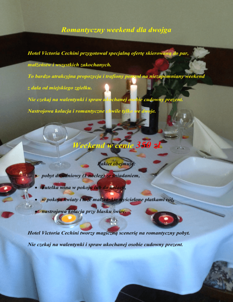Romantyczny weekend dla dwojga Hotel Victoria Cechini przygotował specjalną ofertę skierowaną do par, małżeństw i wszystkich zakochanych. To bardzo atrakcyjna propozycja i trafiony pomysł na niezapomniany weekend z dala od miejskiego zgiełku. Nie czekaj na walentynki i spraw ukochanej osobie cudowny prezent. Nastrojowa kolacja i romantyczne chwile tylko we dwoje. Weekend w cenie 350 zł Pakiet obejmuje: pobyt dwudniowy (1 nocleg) ze śniadaniem, butelka wina w pokoju lub do kolacji, w pokoju kwiaty i łoże małżeńskie wyścielone płatkami róż, nastrojowa kolacja przy blasku świec. Hotel Victoria Cechini tworzy magiczną scenerię na romantyczny pobyt. Nie czekaj na walentynki i spraw ukochanej osobie cudowny prezent.