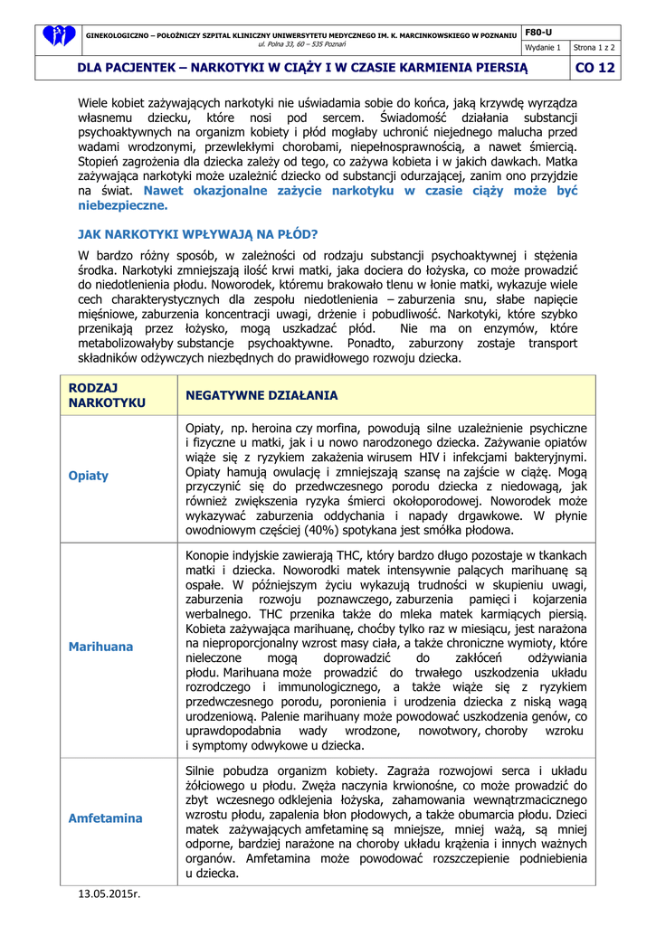 GINEKOLOGICZNO – POŁOŻNICZY SZPITAL KLINICZNY UNIWERSYTETU MEDYCZNEGO IM. K. MARCINKOWSKIEGO W POZNANIU ul. Polna 33, 60 – 535 Poznań F80-U Wydanie 1 DLA PACJENTEK – NARKOTYKI W CIĄŻY I W CZASIE KARMIENIA PIERSIĄ Strona 1 z 2 CO 12 Wiele kobiet zażywających narkotyki nie uświadamia sobie do końca, jaką krzywdę wyrządza własnemu dziecku, które nosi pod sercem. Świadomość działania substancji psychoaktywnych na organizm kobiety i płód mogłaby uchronić niejednego malucha przed wadami wrodzonymi, przewlekłymi chorobami, niepełnosprawnością, a nawet śmiercią. Stopień zagrożenia dla dziecka zależy od tego, co zażywa kobieta i w jakich dawkach. Matka zażywająca narkotyki może uzależnić dziecko od substancji odurzającej, zanim ono przyjdzie na świat. Nawet okazjonalne zażycie narkotyku w czasie ciąży może być niebezpieczne. JAK NARKOTYKI WPŁYWAJĄ NA PŁÓD? W bardzo różny sposób, w zależności od rodzaju substancji psychoaktywnej i stężenia środka. Narkotyki zmniejszają ilość krwi matki, jaka dociera do łożyska, co może prowadzić do niedotlenienia płodu. Noworodek, któremu brakowało tlenu w łonie matki, wykazuje wiele cech charakterystycznych dla zespołu niedotlenienia – zaburzenia snu, słabe napięcie mięśniowe, zaburzenia koncentracji uwagi, drżenie i pobudliwość. Narkotyki, które szybko przenikają przez łożysko, mogą uszkadzać płód. Nie ma on enzymów, które metabolizowałyby substancje psychoaktywne. Ponadto, zaburzony zostaje transport składników odżywczych niezbędnych do prawidłowego rozwoju dziecka. RODZAJ NARKOTYKU NEGATYWNE DZIAŁANIA Opiaty Opiaty, np. heroina czy morfina, powodują silne uzależnienie psychiczne i fizyczne u matki, jak i u nowo narodzonego dziecka. Zażywanie opiatów wiąże się z ryzykiem zakażenia wirusem HIV i infekcjami bakteryjnymi. Opiaty hamują owulację i zmniejszają szansę na zajście w ciążę. Mogą przyczynić się do przedwczesnego porodu dziecka z niedowagą, jak również zwiększenia ryzyka śmierci okołoporodowej. Noworodek może wykazywać zaburzenia oddychania i napady drgawkowe. W płynie owodniowym częściej (40%) spotykana jest smółka płodowa. Marihuana Konopie indyjskie zawierają THC, który bardzo długo pozostaje w tkankach matki i dziecka. Noworodki matek intensywnie palących marihuanę są ospałe. W późniejszym życiu wykazują trudności w skupieniu uwagi, zaburzenia rozwoju poznawczego, zaburzenia pamięci i kojarzenia werbalnego. THC przenika także do mleka matek karmiących piersią. Kobieta zażywająca marihuanę, choćby tylko raz w miesiącu, jest narażona na nieproporcjonalny wzrost masy ciała, a także chroniczne wymioty, które nieleczone mogą doprowadzić do zakłóceń odżywiania płodu. Marihuana może prowadzić do trwałego uszkodzenia układu rozrodczego i immunologicznego, a także wiąże się z ryzykiem przedwczesnego porodu, poronienia i urodzenia dziecka z niską wagą urodzeniową. Palenie marihuany może powodować uszkodzenia genów, co uprawdopodabnia wady wrodzone, nowotwory, choroby wzroku i symptomy odwykowe u dziecka. Amfetamina Silnie pobudza organizm kobiety. Zagraża rozwojowi serca i układu żółciowego u płodu. Zwęża naczynia krwionośne, co może prowadzić do zbyt wczesnego odklejenia łożyska, zahamowania wewnątrzmacicznego wzrostu płodu, zapalenia błon płodowych, a także obumarcia płodu. Dzieci matek zażywających amfetaminę są mniejsze, mniej ważą, są mniej odporne, bardziej narażone na choroby układu krążenia i innych ważnych organów. Amfetamina może powodować rozszczepienie podniebienia u dziecka. 13.05.2015r. GINEKOLOGICZNO – POŁOŻNICZY SZPITAL KLINICZNY UNIWERSYTETU MEDYCZNEGO IM. K. MARCINKOWSKIEGO W POZNANIU ul. Polna 33, 60 – 535 Poznań F80-U Wydanie 1 DLA PACJENTEK – NARKOTYKI W CIĄŻY I W CZASIE KARMIENIA PIERSIĄ Strona 2 z 2 CO 12 RODZAJ NARKOTYKU NEGATYWNE DZIAŁANIA Kokaina Kokaina ekstremalnie zwęża naczynia krwionośne macicy i łożyska, przez co hamuje rozwój dziecka i upośledza dostarczanie tlenu i substancji odżywczych do krwiobiegu płodu. Zażywanie kokainy w zaawansowanej ciąży może powodować wzrost ciśnienia krwi i atak serca u matki, przedwczesny poród oraz urodzenie martwego dziecka. Kobiecie zażywającej kokainę grozi nie tylko zawał serca, ale też nadciśnienie i napady drgawkowe. U dziecka natomiast można zaobserwować drażliwość, biegunki, płaczliwość, niedobór masy ciała, zaburzenia rozwoju motorycznego i wady wrodzone – serca, nerek, twarzy itp. Kokaina przyjmowana w pierwszych 12 tygodniach ciąży grozi samoistnym poronieniem. Noworodki częściej umierają z powodu SIDS – zespołu nagłego zgonu niemowląt. Benzodiazepiny Benzodiazepiny to leki przeciwlękowe i nasenne, które mogą powodować tzw. zespół ospałego niemowlęcia. Dziecko, którego mama w czasie ciąży brała leki z grupy benzodiazepin, jest zwykle senne, ma obniżone napięcie mięśniowe, słabsze odruchy, wolniej adaptuje się do nowych warunków. Należy pamiętać, że każde, choćby jednorazowe, wzięcie narkotyku w czasie ciąży powinno zostać zgłoszone ginekologowi, który prowadzi ciążę kobiety. Szczególnie niebezpieczne jest działanie narkotyków w pierwszym trymestrze ciąży, gdyż wówczas kształtują się wszystkie narządy wewnętrzne płodu, które mogą zostać uszkodzone. Narkotyki w ciąży to ogromne niebezpieczeństwo! Decydując się na dziecko, najlepiej nie zażywać żadnych substancji psychoaktywnych – alkoholu, nikotyny czy narkotyków. Badań na temat wpływu narkotyków na rozwój płodu jest bardzo niewiele, ale te dotychczas dostępne nie pozostawiają złudzeń – środki odurzające mogą prowadzić do nieodwracalnych uszkodzeń płodu, a matki uzależnione od narkotyków zwykle mają więcej komplikacji w czasie ciąży i porodu. Naczelna Pielęgniarka Opracowano na podstawie: 