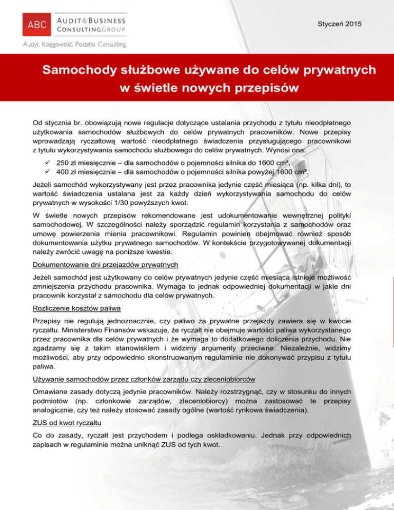 Styczeń 2015 Samochody służbowe używane do celów prywatnych w świetle nowych przepisów Od stycznia br. obowiązują nowe regulacje dotyczące ustalania przychodu z tytułu nieodpłatnego użytkowania samochodów służbowych do celów prywatnych pracowników. Nowe przepisy wprowadzają ryczałtową wartość nieodpłatnego świadczenia przysługującego pracownikowi z tytułu wykorzystywania samochodu służbowego do celów prywatnych. Wynosi ona: 250 zł miesięcznie – dla samochodów o pojemności silnika do 1600 cm³, 400 zł miesięcznie – dla samochodów o pojemności silnika powyżej 1600 cm³. Jeżeli samochód wykorzystywany jest przez pracownika jedynie część miesiąca (np. kilka dni), to wartość świadczenia ustalana jest za każdy dzień wykorzystywania samochodu do celów prywatnych w wysokości 1/30 powyższych kwot. W świetle nowych przepisów rekomendowane jest udokumentowanie wewnętrznej polityki samochodowej. W szczególności należy sporządzić regulamin korzystania z samochodów oraz umowę powierzenia mienia pracownikowi. Regulamin powinien obejmować również sposób dokumentowania użytku prywatnego samochodów. W kontekście przygotowywanej dokumentacji należy zwrócić uwagę na poniższe kwestie. Dokumentowanie dni przejazdów prywatnych Jeżeli samochód jest użytkowany do celów prywatnych jedynie część miesiąca istnieje możliwość zmniejszenia przychodu pracownika. Wymaga to jednak odpowiedniej dokumentacji w jakie dni pracownik korzystał z samochodu dla celów prywatnych. Rozliczenie kosztów paliwa Przepisy nie regulują jednoznacznie, czy paliwo za prywatne przejazdy zawiera się w kwocie ryczałtu. Ministerstwo Finansów wskazuje, że ryczałt nie obejmuje wartości paliwa wykorzystanego przez pracownika dla celów prywatnych i że wymaga to dodatkowego doliczenia przychodu. Nie zgadzamy się z takim stanowiskiem i widzimy argumenty przeciwne. Niezależnie, widzimy możliwości, aby przy odpowiednio skonstruowanym regulaminie nie dokonywać przypisu z tytułu paliwa. Używanie samochodów przez członków zarządu czy zleceniobiorców Omawiane zasady dotyczą jedynie pracowników. Należy rozstrzygnąć, czy w stosunku do innych podmiotów (np. członkowie zarządów, zleceniobiorcy) można zastosować te przepisy analogicznie, czy też należy stosować zasady ogólne (wartość rynkowa świadczenia). ZUS od kwot ryczałtu Co do zasady, ryczałt jest przychodem i podlega oskładkowaniu. Jednak przy odpowiednich zapisach w regulaminie można uniknąć ZUS od tych kwot. Skutki w CIT Sama kwota ryczałtu nie stanowi kosztu podatkowego. Ewentualne składki ZUS obciążające pracodawcę powinny stanowić koszt podatkowy. Naszym zdaniem, pełne koszty eksploatacji samochodów powinny stanowić koszty podatkowe. Nowe a dotychczasowe zasady prywatnego użytku samochodów W przypadku modyfikacji lub wprowadzania nowych regulaminów w zakresie użytkowania samochodów służbowych dla celów prywatnych należy zapewnić spójność ze stosowanymi wcześniej rozwiązaniami (np. jeśli wcześniej przychód nie był rozpoznawany). Spójność z VAT Rozliczenie z tytułu PIT należy „skoordynować” z rozliczeniami w VAT. Przykładowo, jeżeli odliczono 100% VAT w związku z użytkowaniem samochodów wyłącznie w celach służbowych (VAT-26), to ryczałtowy przychód nie powinien być doliczany. W ABC Tax pomagamy w optymalnym wdrożeniu nowych przepisów. Jeżeli są Państwo zainteresowani naszą pomocą, uprzejmie prosimy o kontakt. 4 lutego organizujemy szkolenie w tym zakresie, szczegóły dostępne tutaj. Tomasz Napierała Partner, doradca podatkowy tel. 797 720 901 [email protected] Informacje zawarte w powyższym materiale nie są prawnie wiążącą opinią i mają na celu jedynie zasygnalizowanie określonych kwestii i/lub zmian w legislacji. Przed podjęciem konkretnych decyzji zalecamy skonsultowanie ich z doradcą podatkowym. Michał Kubik Partner, doradca podatkowy tel. 797 720 902 [email protected] ABC Tax Sp. z o.o., Spółka doradztwa podatkowego Poznań, ul. Paderewskiego 6/7 Łódź, Al. Kościuszki 103 tel. +48 61 852 58 45, fax +48 61 853 50 20, e-mail: [email protected] Kapitał zakładowy 50.000 PLN Sąd Rejonowy Poznań Nowe Miasto i Wilda w Poznaniu, www.abcgroupCE.com Audit & Business Consulting Group tworzą: ABC Tax Sp. z o.o. ABC Audit Sp. z o.o. ABC Accounting Sp. z o.o. Śron&Łakomecki Kancelaria Prawnicza s.c.