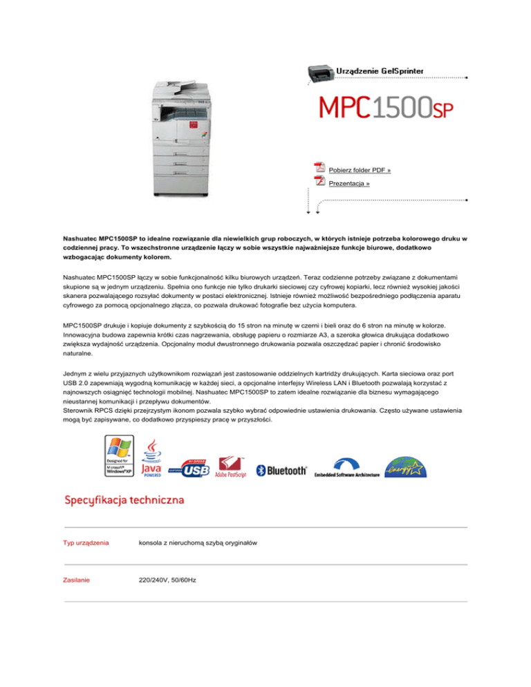 Pobierz folder PDF » Prezentacja » Nashuatec MPC1500SP to idealne rozwiązanie dla niewielkich grup roboczych, w których istnieje potrzeba kolorowego druku w codziennej pracy. To wszechstronne urządzenie łączy w sobie wszystkie najważniejsze funkcje biurowe, dodatkowo wzbogacając dokumenty kolorem. Nashuatec MPC1500SP łączy w sobie funkcjonalność kilku biurowych urządzeń. Teraz codzienne potrzeby związane z dokumentami skupione są w jednym urządzeniu. Spełnia ono funkcje nie tylko drukarki sieciowej czy cyfrowej kopiarki, lecz również wysokiej jakości skanera pozwalającego rozsyłać dokumenty w postaci elektronicznej. Istnieje również możliwość bezpośredniego podłączenia aparatu cyfrowego za pomocą opcjonalnego złącza, co pozwala drukować fotografie bez użycia komputera. MPC1500SP drukuje i kopiuje dokumenty z szybkością do 15 stron na minutę w czerni i bieli oraz do 6 stron na minutę w kolorze. Innowacyjna budowa zapewnia krótki czas nagrzewania, obsługę papieru o rozmiarze A3, a szeroka głowica drukująca dodatkowo zwiększa wydajność urządzenia. Opcjonalny moduł dwustronnego drukowania pozwala oszczędzać papier i chronić środowisko naturalne. Jednym z wielu przyjaznych użytkownikom rozwiązań jest zastosowanie oddzielnych kartridży drukujących. Karta sieciowa oraz port USB 2.0 zapewniają wygodną komunikację w każdej sieci, a opcjonalne interfejsy Wireless LAN i Bluetooth pozwalają korzystać z najnowszych osiągnięć technologii mobilnej. Nashuatec MPC1500SP to zatem idealne rozwiązanie dla biznesu wymagającego nieustannej komunikacji i przepływu dokumentów. Sterownik RPCS dzięki przejrzystym ikonom pozwala szybko wybrać odpowiednie ustawienia drukowania. Często używane ustawienia mogą być zapisywane, co dodatkowo przyspieszy pracę w przyszłości. Typ urządzenia konsola z nieruchomą szybą oryginałów Zasilanie 220/240V, 50/60Hz Pobór mocy poniżej 250W Waga poniżej 49,5kg Wymiary (szer. x głęb. x 550 x 728 x 485mm wys.) Gramatura papieru 60 - 105g/m2 (kasety) 60 - 162g/m2 (podajnik ręczny) 60 - 220g/m2 (podajnik ręczny na 1 arkusz) Podawanie papieru 250 arkuszy w kasecie oraz 100 w podajniku ręcznym 1 arkusz w dodatkowym podajniku ręcznym Całkowita pojemność 1351 arkuszy papieru Pojemność tacy odbiorczej maksymalnie 250 arkuszy Format papieru A6 - A3 Proces kopiowania system oparty na pigmentowym żelu, 4 oddzielne kolory Metoda skanowania skaner płaski 600dpi Pamięć kopiarki 384MB RAM (maks. 640MB oraz dysk twardy 40GB) Szybkość kopiowania mono: do 15 stron A4 na minutę kolor: do 6 stron A4 na minutę Czas nagrzewania mniej niż 20 sekund Pierwsza kopia mono: 9,7 sekund kolor: 24 sekundy Wielokrotność do 99 kopii Zoom 25% - 400% płynnie co 1% Szybkość druku mono: do 15 stron A4 na minutę kolor: do 6 stron A4 na minutę Rozdzielczość 600dpi Języki drukarki RPCS, PCL5c, PCL6, Adobe PostScript 3 (opcja) Czcionki 45 czcionek PCL, 136 PostScript (opcja) Interfejsy standardowe Ethernet 100/10BaseTX USB 2.0 Interfejsy opcjonalne port równoległy (IEEE1284) Wireless LAN (IEEE802.11b) Bluetooth FireWire (IEEE 1394) Host USB Protokoły sieciowe TCP/IP, IPX/SPX, NetBEUI, AppleTalk Systemy operacyjne Windows 95/98/Me/NT4.0/2000/XP/2003 Server Macintosh 8.6 - 9.2, 10.1 Unix/Linux IBM iSeries/ AS/400 z OS/400 Host Print Transform Novell Netware 3.12/3.2/4.1/4.11/5.0/5.1/6 Szybkość skanowania mono: 42 stron A4 na minutę kolor: 13 stron A4 na minutę Rozdzielczość 600dpi Format oryginałów A5 - A3 Format plików PDF, JPEG, TIFF Sterowniki sieciowy, TWAIN Funkcje skanowanie do e-maila, rozsyłka masowa (maks. 300 dla jednego zadania), książka adresowa, obsługa protokołu LDAP, skanowanie do folderu (SMB lub FTP z bezpiecznym logowaniem, maksymalnie 50 folderów w dla jednego skanowania), regulacja obrazu Linia telefoniczna PSTN, PBX Kompatybilność ITU-T G3, T.37 Internet faks, T.38 IP faks Rozdzielczość 200 x 200/100dpi Kompresja danych MH, MR, MMR, JBIG Szybkość transmisji dan 33,6Kbps ych Szybkość skanowania 1 sek. (200dpi, A4, SEF) Pamięć 4MB pamięci stron, 4MB pamięci SAF (320 stron) Inne cechy podwójny dostęp, dupleks (tylko z ARDF), książka numerów, numery szybkiego wybierania (150), transmisja książki, obracanie obrazu, kopia zapasowa, rozsyłka seryjna, faks sieciowy (opcja), przesyłanie faksów emailem (opcja), 50 kodów użytkownika SmartDevice Monitor Web SmartDevice Monitor WebImage Monitor DeskTop Binder V2 Lite Pokrywa oryginałów Automatyczny podajnik dokumentów na 30 arkuszy Automatyczny odwracający podajnik dokumentów na 50 arkuszy Kaseta na papier 1 x 500 arkuszy Kaseta na papier 2 x 500 arkuszy Dupleks Stoliki pod kopiarkę System bezpieczeństwa danych (DOS) Moduł zabezpieczający przed nieautoryzowanym kopiowaniem Wszystkie produkty Nashuatec spełniają normy jakości ISO 9001 oraz ochrony środowiska naturalnego ISO 14001. Zastrzegamy sobie prawo do wprowadzenia zmian w specyfikacji technicznej oraz wyglądzie produktów. Pełna gama produktów pokazana w tej publikacji może nie być zawsze dostępna. Wszystkie marki, nazwy i znaki towarowe należą do ich prawnych właścicieli.