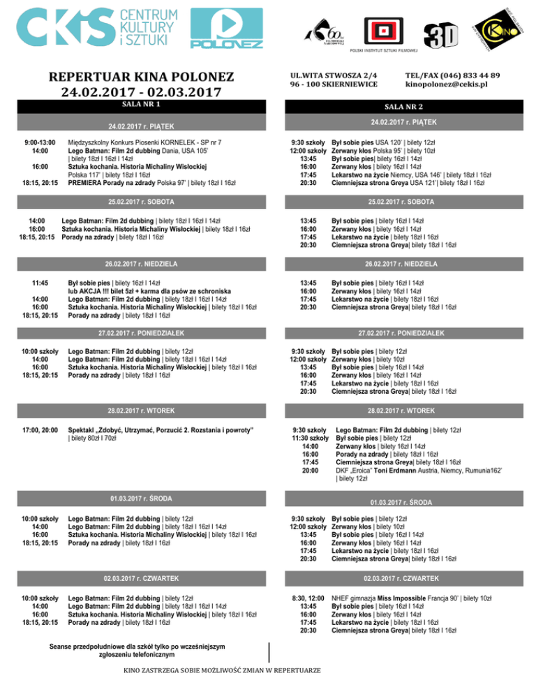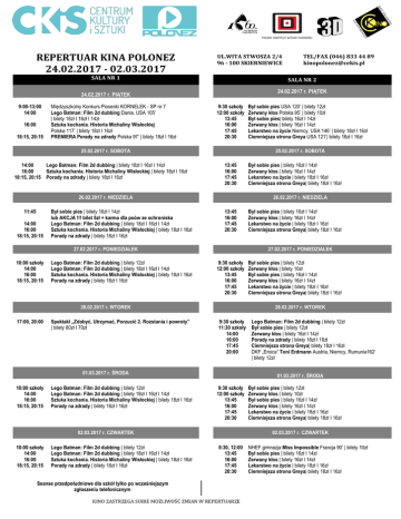 REPERTUAR KINA POLONEZ 24.02.2017 - 02.03.2017 UL.WITA STWOSZA 2/4 96 - 100 SKIERNIEWICE SALA NR 1 SALA NR 2 24.02.2017 r. PIĄTEK 24.02.2017 r. PIĄTEK 9:00-13:00 14:00 16:00 18:15, 20:15 Międzyszkolny Konkurs Piosenki KORNELEK - SP nr 7 Lego Batman: Film 2d dubbing Dania, USA 105’ | bilety 18zł I 16zł I 14zł Sztuka kochania. Historia Michaliny Wisłockiej Polska 117’ | bilety 18zł I 16zł PREMIERA Porady na zdrady Polska 97’ | bilety 18zł I 16zł 9:30 szkoły 12:00 szkoły 13:45 16:00 17:45 20:30 25.02.2017 r. SOBOTA 14:00 Lego Batman: Film 2d dubbing | bilety 18zł I 16zł I 14zł 16:00 Sztuka kochania. Historia Michaliny Wisłockiej | bilety 18zł I 16zł 18:15, 20:15 Porady na zdrady | bilety 18zł I 16zł 14:00 16:00 18:15, 20:15 Był sobie pies | bilety 16zł I 14zł lub AKCJA !!! bilet 5zł + karma dla psów ze schroniska Lego Batman: Film 2d dubbing | bilety 18zł I 16zł I 14zł Sztuka kochania. Historia Michaliny Wisłockiej | bilety 18zł I 16zł Porady na zdrady | bilety 18zł I 16zł 13:45 16:00 17:45 20:30 Lego Batman: Film 2d dubbing | bilety 12zł Lego Batman: Film 2d dubbing | bilety 18zł I 16zł I 14zł Sztuka kochania. Historia Michaliny Wisłockiej | bilety 18zł I 16zł Porady na zdrady | bilety 18zł I 16zł 13:45 16:00 17:45 20:30 Spektakl „Zdobyć, Utrzymać, Porzucić 2. Rozstania i powroty” | bilety 80zł I 70zł 9:30 szkoły 12:00 szkoły 13:45 16:00 17:45 20:30 Lego Batman: Film 2d dubbing | bilety 12zł Lego Batman: Film 2d dubbing | bilety 18zł I 16zł I 14zł Sztuka kochania. Historia Michaliny Wisłockiej | bilety 18zł I 16zł Porady na zdrady | bilety 18zł I 16zł 9:30 szkoły 11:30 szkoły 14:00 16:00 17:45 20:00 Lego Batman: Film 2d dubbing | bilety 12zł Lego Batman: Film 2d dubbing | bilety 18zł I 16zł I 14zł Sztuka kochania. Historia Michaliny Wisłockiej | bilety 18zł I 16zł Porady na zdrady | bilety 18zł I 16zł Lego Batman: Film 2d dubbing | bilety 12zł Był sobie pies | bilety 12zł Zerwany kłos | bilety 16zł I 14zł Porady na zdrady | bilety 18zł I 16zł Ciemniejsza strona Greya| bilety 18zł I 16zł DKF „Eroica” Toni Erdmann Austria, Niemcy, Rumunia162’ | bilety 12zł 01.03.2017 r. ŚRODA 9:30 szkoły 12:00 szkoły 13:45 16:00 17:45 20:30 02.03.2017 r. CZWARTEK 10:00 szkoły 14:00 16:00 18:15, 20:15 Był sobie pies | bilety 12zł Zerwany kłos | bilety 10zł Był sobie pies | bilety 16zł I 14zł Zerwany kłos | bilety 16zł I 14zł Lekarstwo na życie | bilety 18zł I 16zł Ciemniejsza strona Greya| bilety 18zł I 16zł 28.02.2017 r. WTOREK 01.03.2017 r. ŚRODA 10:00 szkoły 14:00 16:00 18:15, 20:15 Był sobie pies | bilety 16zł I 14zł Zerwany kłos | bilety 16zł I 14zł Lekarstwo na życie | bilety 18zł I 16zł Ciemniejsza strona Greya| bilety 18zł I 16zł 27.02.2017 r. PONIEDZIAŁEK 28.02.2017 r. WTOREK 17:00, 20:00 Był sobie pies | bilety 16zł I 14zł Zerwany kłos | bilety 16zł I 14zł Lekarstwo na życie | bilety 18zł I 16zł Ciemniejsza strona Greya| bilety 18zł I 16zł 26.02.2017 r. NIEDZIELA 27.02.2017 r. PONIEDZIAŁEK 10:00 szkoły 14:00 16:00 18:15, 20:15 Był sobie pies USA 120’ | bilety 12zł Zerwany kłos Polska 95’ | bilety 10zł Był sobie pies| bilety 16zł I 14zł Zerwany kłos | bilety 16zł I 14zł Lekarstwo na życie Niemcy, USA 146’ | bilety 18zł I 16zł Ciemniejsza strona Greya USA 121’| bilety 18zł I 16zł 25.02.2017 r. SOBOTA 26.02.2017 r. NIEDZIELA 11:45 TEL/FAX (046) 833 44 89 [email protected] Był sobie pies | bilety 12zł Zerwany kłos | bilety 10zł Był sobie pies | bilety 16zł I 14zł Zerwany kłos | bilety 16zł I 14zł Lekarstwo na życie | bilety 18zł I 16zł Ciemniejsza strona Greya| bilety 18zł I 16zł 02.03.2017 r. CZWARTEK 8:30, 12:00 13:45 16:00 17:45 20:30 Seanse przedpołudniowe dla szkół tylko po wcześniejszym zgłoszeniu telefonicznym KINO ZASTRZEGA SOBIE MOŻLIWOŚĆ ZMIAN W REPERTUARZE NHEF gimnazja Miss Impossible Francja 90’ | bilety 10zł Był sobie pies | bilety 16zł I 14zł Zerwany kłos | bilety 16zł I 14zł Lekarstwo na życie | bilety 18zł I 16zł Ciemniejsza strona Greya| bilety 18zł I 16zł