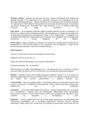 Wymiary boiska – długość linii bocznej musi być większa niż długość linii bramkowej: długość minimum 25 m, maksimum 42 m; szerokość minimum 15 m, maksimum 25 m. Na zawodach międzynarodowych – długość minimum 38 m, maksimum 42; szerokość minimum 18, maksimum 22. Dwie dłuższe linie graniczne są nazywane liniami bocznymi; dwie krótsze zaś liniami bramkowymi. Wszystkie linie mają szerokość 8 cm. Z punktu środkowego wyznacza się okrąg o promieniu 3 m. Pole karne – od zewnętrznej krawędzi słupków bramki zakreśla się łuki o promieniu 6 m łączące się z jednej strony pod kątem prostym z linią bramkową, a z drugiej strony połączone ze sobą linią równoległą do linii bramkowej o dług. 3,16 m. Punkt karny – w odległości 6 m od środka linii bramkowej. Drugi punkt karny wyznacza się w odległości 10 m od środka linii bramkowej w równej odległości od obu słupków. Strefy zmian – mają co najmniej 5 m długości i są oznaczone z każdej strony za pomocą linii prostopadłej do linii bocznej mającej 8 cm szerokości i 80 cm długości, z czego 40 cm narysowana jest wewnątrz, a 40 cm na zewnątrz pola gry. Piłka futsalowa Tworzywo: stworzona ze skóry lub materiałów syntetycznych Średnica: od 62 do 64 cm (tzw. 4) Waga: nie mniej niż 400 gramów, nie więcej niż 440 gramów Ciśnienie powietrza: 0.4 - 0.6 atmosfer Piłka futsalowa jest piłką "niskoodbijającą się" - po upuszczeniu jej z wysokości 2 metrów nie może odbić się niżej niż 50 cm a wyżej niż 65 cm od ziemi przy pierwszym odbiciu Bramki – odległość (licząc od wewnątrz) pomiędzy słupkami wynosi 3 m, a wysokość od dolnej krawędzi poprzeczki do powierzchni boiska wynosi 2 m. Bramki mogą być przenośne, ale muszą być pewnie zakotwiczone w podłożu podczas gry. Nawierzchnia – musi być gładka, płaska i nieścieralna. Zaleca się stosowanie drewna albo tworzyw sztucznych o podobnych właściwościach. Należy unikać stosowania nawierzchni betonowych lub im podobnych. Zawodnicy – w zawodach udział biorą dwie drużyny, z których każda składa się z nie więcej niż 5 zawodników, z których jeden jest bramkarzem. Maksymalna liczba zawodników rezerwowych wynosi 7. Liczba zmian podczas meczu jest nieograniczona. Bramkarz może zamienić się miejscami z zawodnikiem z pola. Sędziowie – zarówno sędzia (główny), jak i drugi sędzia mają prawo do napomnienia lub wykluczenia zawodników, ale w przypadku rozbieżności przeważa decyzja sędziego (głównego). Drugi sędzia jest wyznaczony do działania po przeciwnej stronie pola gry niż pierwszy. Ma prawo używania gwizdka. Ponadto drugi sędzia ma władzę do przerywania gry za naruszenie jej przepisów oraz zapewnia prawidłowe przeprowadzanie zmian zawodników. Poza sędzią i drugim sędzią na nowo definiuje się oficjalne funkcje trzeciego sędziego i sędziego czasowego. Sędzia czasowy m.in. włącza i zatrzymuje zegar, kontroluje 1-minutowe przerwy w grze i uzgadnia je z zespołem, kontroluje karę 2-minutową i uzgadnia, który z zawodników rezerwowych zajmie miejsce zawodnika usuniętego z boiska, notuje liczbę fauli, używa sygnału dźwiękowego. Trzeci sędzia notuje nazwiska i numery strzelców bramek, nazwiska i numery zawodników napomnianych i wykluczonych z gry oraz przyczyny zastosowania powyższych kar, wypełnia sprawozdanie, dostarcza istotnych informacji. W przypadku zastrzeżeń do pracy sędziego czasowego, sędzia ten ma prawo zwolnić go z jego funkcji i wyznaczyć zastępstwo składając w tej sprawie sprawozdanie odpowiednim władzom. W zawodach międzynarodowych wyznaczenie sędziego czasowego jest obowiązkowe. Czas trwania gry – mecz składa się z dwóch części po 20 minut każda. Czas trwania każdej połowy winien być przedłużony, aby umożliwić wykonanie ewentualnego rzutu karnego. Przerwa między częściami gry – Przerwa między pierwszą a drugą połową meczu nie może przekroczyć 15 minut. Czas dla drużyny – trenerzy każdej drużyny są upoważnieni do zgłaszania chęci uzyskania przerwy trwającej 1 minutę; przerwa taka może być udzielona w każdej chwili z zastrzeżeniem, że drużyna ubiegająca się o nią jest w posiadaniu piłki (np. rzut wolny, rzut rożny lub wrzut z autu); kiedy przerwa jest przyznana, zawodnicy muszą pozostać na polu gry; jeżeli chcą oni uzyskać instrukcję od trenera, to ich przekazanie może odbyć się przy linii bocznej na wysokości ławek rezerwowych; osoba udzielająca instrukcji nie może wchodzić na boisko; drużyna, która nie wykorzystała przysługującej 1 minuty przerwy w grze w pierwszej połowie, jest uprawniona tylko do jednej przerwy podczas drugiej połowy w meczu. Piłka poza grą – gdy całym obwodem przekroczy linię bramkową lub linię boczną zarówno na ziemi (podłożu) jak i w powietrzu; uderzy w sufit; gdy gra została przerwana przez sędziego. Zawodnik wykluczony nie może powrócić do gry, ani zajmować miejsca na ławce rezerwowych. Zawodnik rezerwowy może wejść do gry po upływie 2 minut od wykluczenia współpartnera, o ile wcześniej drużyna osłabiona nie straci bramki. W takim przypadku: jeżeli 4 zawodników gra przeciwko 5 i tracą bramkę, mogą uzupełnić skład; jeżeli obie drużyny mają po 4 zawodników i pada bramka – nie uzupełniają składu; jeżeli 3 zawodników gra przeciwko 4 lub 5 i traci bramkę – mogą uzupełnić skład tylko o 1 zawodnika; jeżeli obie drużyny mają po 3 zawodników i pada bramka – nie uzupełniają składu; jeżeli drużyna grająca w osłabieniu strzela bramkę, nie uzupełnia składu przed upływem 2 minut od chwili wykluczenia zawodnika. Uzupełnienie składu wymaga zgody sędziego czasowego, a w razie jego braku, drugiego sędziego. Faule akumulowane – pierwsze pięć fauli popełnionych przez daną drużynę podczas jednej połowy meczu karane jest rzutami wolnymi bezpośrednimi. Wykonanie 