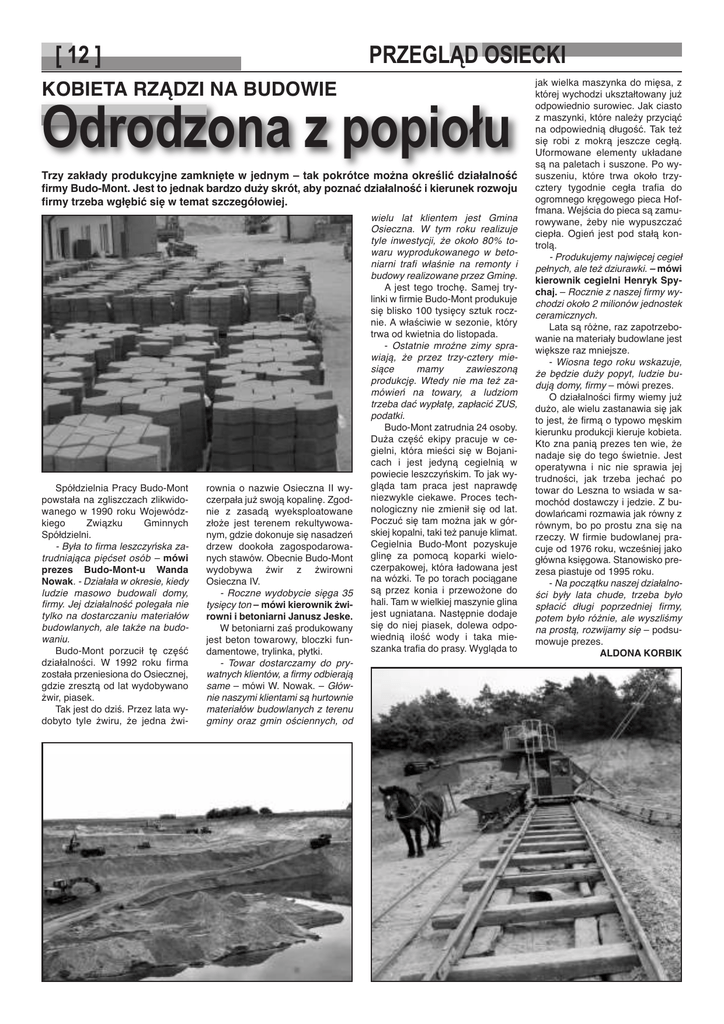 [ 12 ] PRZEGLĄD OSIECKI Odrodzona z popiołu KOBIETA RZĄDZI NA BUDOWIE Trzy zakłady produkcyjne zamknięte w jednym – tak pokrótce można określić działalność firmy Budo-Mont. Jest to jednak bardzo duży skrót, aby poznać działalność i kierunek rozwoju firmy trzeba wgłębić się w temat szczegółowiej. Spółdzielnia Pracy Budo-Mont powstała na zgliszczach zlikwidowanego w 1990 roku Wojewódzkiego Związku Gminnych Spółdzielni. - Była to firma leszczyńska zatrudniająca pięćset osób – mówi prezes Budo-Mont-u Wanda Nowak. - Działała w okresie, kiedy ludzie masowo budowali domy, firmy. Jej działalność polegała nie tylko na dostarczaniu materiałów budowlanych, ale także na budowaniu. Budo-Mont porzucił tę część działalności. W 1992 roku firma została przeniesiona do Osiecznej, gdzie zresztą od lat wydobywano żwir, piasek. Tak jest do dziś. Przez lata wydobyto tyle żwiru, że jedna żwi- rownia o nazwie Osieczna II wyczerpała już swoją kopalinę. Zgodnie z zasadą wyeksploatowane złoże jest terenem rekultywowanym, gdzie dokonuje się nasadzeń drzew dookoła zagospodarowanych stawów. Obecnie Budo-Mont wydobywa żwir z żwirowni Osieczna IV. - Roczne wydobycie sięga 35 tysięcy ton – mówi kierownik żwirowni i betoniarni Janusz Jeske. W betoniarni zaś produkowany jest beton towarowy, bloczki fundamentowe, trylinka, płytki. - Towar dostarczamy do prywatnych klientów, a firmy odbierają same – mówi W. Nowak. – Głównie naszymi klientami są hurtownie materiałów budowlanych z terenu gminy oraz gmin ościennych, od wielu lat klientem jest Gmina Osieczna. W tym roku realizuje tyle inwestycji, że około 80% towaru wyprodukowanego w betoniarni trafi właśnie na remonty i budowy realizowane przez Gminę. A jest tego trochę. Samej trylinki w firmie Budo-Mont produkuje się blisko 100 tysięcy sztuk rocznie. A właściwie w sezonie, który trwa od kwietnia do listopada. - Ostatnie mroźne zimy sprawiają, że przez trzy-cztery miesiące mamy zawieszoną produkcję. Wtedy nie ma też zamówień na towary, a ludziom trzeba dać wypłatę, zapłacić ZUS, podatki. Budo-Mont zatrudnia 24 osoby. Duża część ekipy pracuje w cegielni, która mieści się w Bojanicach i jest jedyną cegielnią w powiecie leszczyńskim. To jak wygląda tam praca jest naprawdę niezwykle ciekawe. Proces technologiczny nie zmienił się od lat. Poczuć się tam można jak w górskiej kopalni, taki też panuje klimat. Cegielnia Budo-Mont pozyskuje glinę za pomocą koparki wieloczerpakowej, która ładowana jest na wózki. Te po torach pociągane są przez konia i przewożone do hali. Tam w wielkiej maszynie glina jest ugniatana. Następnie dodaje się do niej piasek, dolewa odpowiednią ilość wody i taka mieszanka trafia do prasy. Wygląda to jak wielka maszynka do mięsa, z której wychodzi ukształtowany już odpowiednio surowiec. Jak ciasto z maszynki, które należy przyciąć na odpowiednią długość. Tak też się robi z mokrą jeszcze cegłą. Uformowane elementy układane są na paletach i suszone. Po wysuszeniu, które trwa około trzycztery tygodnie cegła trafia do ogromnego kręgowego pieca Hoffmana. Wejścia do pieca są zamurowywane, żeby nie wypuszczać ciepła. Ogień jest pod stałą kontrolą. - Produkujemy najwięcej cegieł pełnych, ale też dziurawki. – mówi kierownik cegielni Henryk Spychaj. – Rocznie z naszej firmy wychodzi około 2 milionów jednostek ceramicznych. Lata są różne, raz zapotrzebowanie na materiały budowlane jest większe raz mniejsze. - Wiosna tego roku wskazuje, że będzie duży popyt, ludzie budują domy, firmy – mówi prezes. O działalności firmy wiemy już dużo, ale wielu zastanawia się jak to jest, że firmą o typowo męskim kierunku produkcji kieruje kobieta. Kto zna panią prezes ten wie, że nadaje się do tego świetnie. Jest operatywna i nic nie sprawia jej trudności, jak trzeba jechać po towar do Leszna to wsiada w samochód dostawczy i jedzie. Z budowlańcami rozmawia jak równy z równym, bo po prostu zna się na rzeczy. W firmie budowlanej pracuje od 1976 roku, wcześniej jako główna księgowa. Stanowisko prezesa piastuje od 1995 roku. - Na początku naszej działalności były lata chude, trzeba było spłacić długi poprzedniej firmy, potem było różnie, ale wyszliśmy na prostą, rozwijamy się – podsumowuje prezes. ALDONA KORBIK