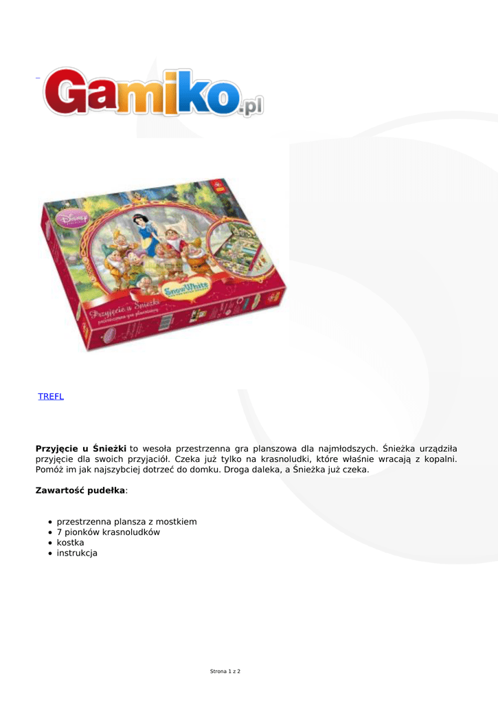 TREFL Przyjęcie u Śnieżki to wesoła przestrzenna gra planszowa dla najmłodszych. Śnieżka urządziła przyjęcie dla swoich przyjaciół. Czeka już tylko na krasnoludki, które właśnie wracają z kopalni. Pomóż im jak najszybciej dotrzeć do domku. Droga daleka, a Śnieżka już czeka. Zawartość pudełka: przestrzenna plansza z mostkiem 7 pionków krasnoludków kostka instrukcja Strona 1 z 2 Wiek od 5 lat Liczba graczy 2 - 6 graczy Czas gry 15 - 30 minut Instrukcja polska Wydanie polskie Producent Trefl Strona 2 z 2