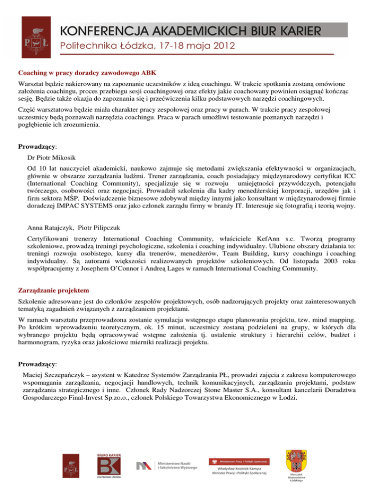 Coaching w pracy doradcy zawodowego ABK Warsztat bdzie nakierowany na zapoznanie uczestników z ide coachingu. W trakcie spotkania zostan omówione załoenia coachingu, proces przebiegu sesji coachingowej oraz efekty jakie coachowany powinien osign koczc sesj. Bdzie take okazja do zapoznania si i przewiczenia kilku podstawowych narzdzi coachingowych. Cz warsztatowa bdzie miała charakter pracy zespołowej oraz pracy w parach. W trakcie pracy zespołowej uczestnicy bd poznawali narzdzia coachingu. Praca w parach umoliwi testowanie poznanych narzdzi i pogłbienie ich zrozumienia. Prowadzcy: Dr Piotr Mikosik Od 10 lat nauczyciel akademicki, naukowo zajmuje si metodami zwikszania efektywnoci w organizacjach, głównie w obszarze zarzdzania ludmi. Trener zarzdzania, coach posiadajcy midzynarodowy certyfikat ICC (International Coaching Community), specjalizuje si w rozwoju umiejtnoci przywódczych, potencjału twórczego, osobowoci oraz negocjacji. Prowadził szkolenia dla kadry menederskiej korporacji, urzdów jak i firm sektora MP. Dowiadczenie biznesowe zdobywał midzy innymi jako konsultant w midzynarodowej firmie doradczej IMPAC SYSTEMS oraz jako członek zarzdu firmy w brany IT. Interesuje si fotografi i teori wojny. Anna Ratajczyk, Piotr Pilipczuk Certyfikowani trenerzy International Coaching Community, właciciele KefAnn s.c. Tworz programy szkoleniowe, prowadz treningi psychologiczne, szkolenia i coaching indywidualny. Ulubione obszary działania to: treningi rozwoju osobistego, kursy dla trenerów, menederów, Team Building, kursy coachingu i coaching indywidualny. S autorami wikszoci realizowanych projektów szkoleniowych. Od listopada 2003 roku współpracujemy z Josephem O’Connor i Andre Lages w ramach International Coaching Community. Zarzdzanie projektem Szkolenie adresowane jest do członków zespołów projektowych, osób nadzorujcych projekty oraz zainteresowanych tematyk zagadnie zwizanych z zarzdzaniem projektami. W ramach warsztatu przeprowadzona zostanie symulacja wstpnego etapu planowania projektu, tzw. mind mapping. Po krótkim wprowadzeniu teoretycznym, ok. 15 minut, uczestnicy zostan podzieleni na grupy, w których dla wybranego projektu bd opracowywa wstpne załoenia tj. ustalenie struktury i hierarchii celów, budet i harmonogram, ryzyka oraz jakociowe mierniki realizacji projektu. Prowadzcy: Maciej Szczepaczyk – asystent w Katedrze Systemów Zarzdzania PŁ, prowadzi zajcia z zakresu komputerowego wspomagania zarzdzania, negocjacji handlowych, technik komunikacyjnych, zarzdzania projektami, podstaw zarzdzania strategicznego i inne. Członek Rady Nadzorczej Stone Master S.A., konsultant kancelarii Doradztwa Gospodarczego Final-Invest Sp.zo.o., członek Polskiego Towarzystwa Ekonomicznego w Łodzi. Wypalenie zawodowe Szkolenie skierowane jest do doradców zawodowych oraz wszystkich osób wspierajcych osoby bezrobotne. Podczas szkolenia uczestnicy poznaj mechanizmy powstawania i rozwijania si syndromu wypalenia zawodowego. Naucz si identyfikowa problem oraz przeciwdziała jego wystpieniu. Celem szkolenia jest zapoznanie uczestników z charakterystyk zjawiska wypalenia zawodowego oraz przekazanie wiedzy dotyczcej głównych przyczyn wypalenia i objawów oraz nauczenia umiejtnoci przeciwdziałania WZ Na szkolenie składaj si dwa moduły. Pierwszy moduł prowadzony jest w formie dyskusji oraz case study podczas których uczestnicy poznaj charakterystyk syndromu wypalenia zawodowego oraz czynniki zmniejszajce i zwikszajce ryzyko jego pojawienia si. Drugi moduł powicony jest profilaktyce wypalenia zawodowego oraz technikom zaradczym i prowadzony jest w formie warsztatowej. Prowadzcy: Dr Paweł Rasmus, Zakład Psychologii Lekarskiej UM w Łodzi Dr n. med., psycholog, trener, doradca, pracownik naukowo dydaktyczny na Uniwersytecie Medycznym w Łodzi. Od 7 lat zajmuje si indywidualnym poradnictwem oraz prac z grupami w ramach szkole, warsztatów i wykładów. Współpracuj z licznymi instytucjami prowadzc konsultacje i szkolenia. Tworzy autorskie programy szkoleniowe. Promotor i recenzent prac dyplomowych, autor artykułów naukowych. Zainteresowania naukowe: stres, reakcje w sytuacjach kryzysowych, cyberuzalenienia. Assessment Centre Szkolenie Assessment Centre dedykowane jest głównie dla osób zarzdzajcych zespołami, specjalistów HR odpowiedzialnych za rekrutacje i selekcje kadr, menaderów HR, osób chccych naby kwalifikacje asesorskie oraz osób które w ramach rekrutacji bd przechodziły przez proces AC. Celem szkolenia jest m.in. poznanie i zrozumienie metodologii tworzenia procedury AC, poznanie specyfiki wybranych wicze, technik oraz kompetencji, które mog by nimi zmierzone, poznanie i zrozumienie perspektywy osób oceniajcych w AC, zapoznanie ze współczesnymi praktykami stosowania AC. Szkolenie składa si z mini oraz wicze w grupach. Prowadzcy: Dr Małgorzata Kałaska – psycholog, doradca zawodowy, trener umiejtnoci osobistych i komunikacji midzykulturowej. Przez 8 lat pracowała jak doradca zawodowy i opiekun pracodawców w Biurze Karier Politechniki Krakowskiej, obecnie wykładowca akademicki i trener-freelancer. Przeprowadziła wiele szkole i zaj akademickich z psychologii poradnictwa zawodowego dla doradców, psychologów i organizacji pomocowych oraz z zakresu komunikacji i adaptacji midzykulturowej dla studentów wyjedajcych na studia i do pracy za granic. Autorka artykułów popularnych na temat Assessment Center, publikacji „Poznawczy wymiar rónic kulturowych w zachowaniach społecznych”, współautorka „Poradnika Doradcy Zawodowego”. Absolwentka pierwszej Szkoły Trenerów Midzykulturowych (Wszechnica UJ).