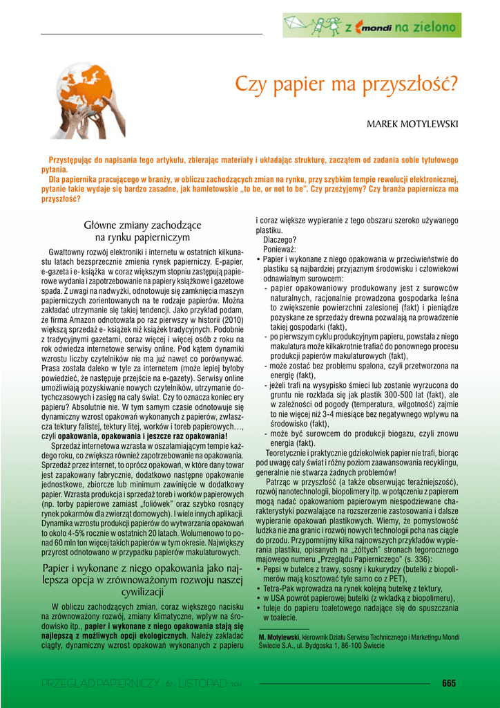 Czy papier ma przyszłość? MAREK MOTYLEWSKI Przystępując do napisania tego artykułu, zbierając materiały i układając strukturę, zacząłem od zadania sobie tytułowego pytania. Dla papiernika pracującego w branży, w obliczu zachodzących zmian na rynku, przy szybkim tempie rewolucji elektronicznej, pytanie takie wydaje się bardzo zasadne, jak hamletowskie „to be, or not to be”. Czy przeżyjemy? Czy branża papiernicza ma przyszłość? Główne zmiany zachodzące na rynku papierniczym Gwałtowny rozwój elektroniki i internetu w ostatnich kilkunastu latach bezsprzecznie zmienia rynek papierniczy. E-papier, e-gazeta i e- książka w coraz większym stopniu zastępują papierowe wydania i zapotrzebowanie na papiery książkowe i gazetowe spada. Z uwagi na nadwyżki, odnotowuje się zamknięcia maszyn papierniczych zorientowanych na te rodzaje papierów. Można zakładać utrzymanie się takiej tendencji. Jako przykład podam, że firma Amazon odnotowała po raz pierwszy w historii (2010) większą sprzedaż e- książek niż książek tradycyjnych. Podobnie z tradycyjnymi gazetami, coraz więcej i więcej osób z roku na rok odwiedza internetowe serwisy online. Pod kątem dynamiki wzrostu liczby czytelników nie ma już nawet co porównywać. Prasa została daleko w tyle za internetem (może lepiej byłoby powiedzieć, że następuje przejście na e-gazety). Serwisy online umożliwiają pozyskiwanie nowych czytelników, utrzymanie dotychczasowych i zasięg na cały świat. Czy to oznacza koniec ery papieru? Absolutnie nie. W tym samym czasie odnotowuje się dynamiczny wzrost opakowań wykonanych z papierów, zwłaszcza tektury falistej, tektury litej, worków i toreb papierowych…, czyli opakowania, opakowania i jeszcze raz opakowania! Sprzedaż internetowa wzrasta w oszałamiającym tempie każdego roku, co zwiększa również zapotrzebowanie na opakowania. Sprzedaż przez internet, to oprócz opakowań, w które dany towar jest zapakowany fabrycznie, dodatkowo następne opakowanie jednostkowe, zbiorcze lub minimum zawinięcie w dodatkowy papier. Wzrasta produkcja i sprzedaż toreb i worków papierowych (np. torby papierowe zamiast „foliówek” oraz szybko rosnący rynek pokarmów dla zwierząt domowych). I wiele innych aplikacji. Dynamika wzrostu produkcji papierów do wytwarzania opakowań to około 4-5% rocznie w ostatnich 20 latach. Wolumenowo to ponad 60 mln ton więcej takich papierów w tym okresie. Największy przyrost odnotowano w przypadku papierów makulaturowych. Papier i wykonane z niego opakowania jako najlepsza opcja w zrównoważonym rozwoju naszej cywilizacji W obliczu zachodzących zmian, coraz większego nacisku na zrównoważony rozwój, zmiany klimatyczne, wpływ na środowisko itp., papier i wykonane z niego opakowania stają się najlepszą z możliwych opcji ekologicznych. Należy zakładać ciągły, dynamiczny wzrost opakowań wykonanych z papieru PRZEGLĄD PAPIERNICZY · 67 · LISTOPAD 2011 i coraz większe wypieranie z tego obszaru szeroko używanego plastiku. Dlaczego? Ponieważ: • Papier i wykonane z niego opakowania w przeciwieństwie do plastiku są najbardziej przyjaznym środowisku i człowiekowi odnawialnym surowcem: - papier opakowaniowy produkowany jest z surowców naturalnych, racjonalnie prowadzona gospodarka leśna to zwiększenie powierzchni zalesionej (fakt) i pieniądze pozyskane ze sprzedaży drewna pozwalają na prowadzenie takiej gospodarki (fakt), - po pierwszym cyklu produkcyjnym papieru, powstała z niego makulatura może kilkakrotnie trafiać do ponownego procesu produkcji papierów makulaturowych (fakt), - może zostać bez problemu spalona, czyli przetworzona na energię (fakt), - jeżeli trafi na wysypisko śmieci lub zostanie wyrzucona do gruntu nie rozkłada się jak plastik 300-500 lat (fakt), ale w zależności od pogody (temperatura, wilgotność) zajmie to nie więcej niż 3-4 miesiące bez negatywnego wpływu na środowisko (fakt), - może być surowcem do produkcji biogazu, czyli znowu energia (fakt). Teoretycznie i praktycznie gdziekolwiek papier nie trafi, biorąc pod uwagę cały świat i różny poziom zaawansowania recyklingu, generalnie nie stwarza żadnych problemów! Patrząc w przyszłość (a także obserwując teraźniejszość), rozwój nanotechnologii, biopolimery itp. w połączeniu z papierem mogą nadać opakowaniom papierowym niespodziewane charakterystyki pozwalające na rozszerzenie zastosowania i dalsze wypieranie opakowań plastikowych. Wiemy, że pomysłowość ludzka nie zna granic i rozwój nowych technologii pcha nas ciągle do przodu. Przypomnijmy kilka najnowszych przykładów wypierania plastiku, opisanych na „żółtych” stronach tegorocznego majowego numeru „Przeglądu Papierniczego” (s. 336): • Pepsi w butelce z trawy, sosny i kukurydzy (butelki z biopolimerów mają kosztować tyle samo co z PET), • Tetra-Pak wprowadza na rynek kolejną butelkę z tektury, • w USA powrót papierowej butelki (z wkładką z biopolimeru), • tuleje do papieru toaletowego nadające się do spuszczania w toalecie. M. Motylewski, kierownik Działu Serwisu Technicznego i Marketingu Mondi Świecie S.A., ul. Bydgoska 1, 86-100 Świecie 665
