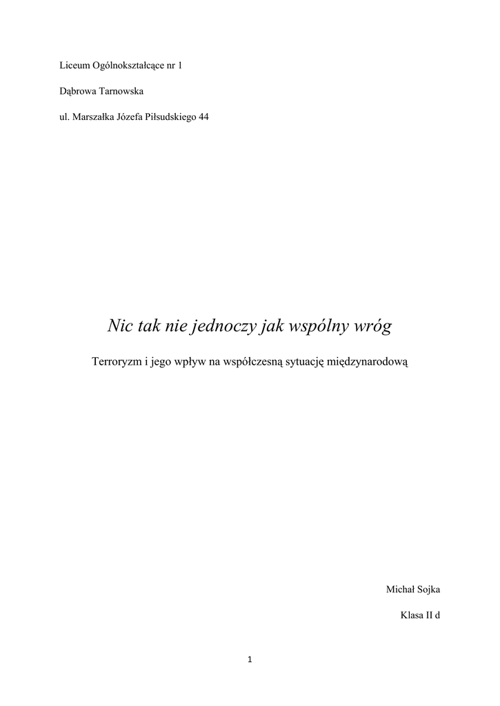 Liceum Ogólnokształcące nr 1 Dąbrowa Tarnowska ul. Marszałka Józefa Piłsudskiego 44 Nic tak nie jednoczy jak wspólny wróg Terroryzm i jego wpływ na współczesną sytuację międzynarodową Michał Sojka Klasa II d 1 Terroryzm to zjawisko stare jak świat towarzyszące człowiekowi od momentu, kiedy odkrył, że krzywdząc drugiego może osiągnąć korzyść. Przeplata się na kartach dziejów począwszy od Sumerów, na nas kończąc. Zamachy z 11 września nie stały się jego początkiem, uświadomiły tylko, że terroryzm dotyczy nas wszystkich, niezależnie od narodowości i czynów, których się dopuściliśmy oraz, że przez najbliższe lata czeka nas jedna z najdłuższych wojen w historii. Jean-Paul Sartre powiedział „Terroryzm to straszna broń, ale uciskani nie mają innej.”1 Dla mnie to stwierdzenie zbyt ogólne, zgadzam się, co do tego, że terroryzm jest najczęściej bronią tych, których nie stać na inną, ale musimy zadać sobie pytanie czy najbogatsze kraje świata nie wykorzystują potencjału terroryzmu tak, aby osiągnąć swoje cele incognito2? A jeśli nawet opinia publiczna się dowie o działaniach państwa, które delikatnie mówiąc nie są zbyt „honorowe” to czy ślepo uznamy je za „szerzenie demokracji”? Według polskiego politologa Bartosza Bolechowa „Terroryzm jest formą przemocy politycznej, polegającej na stosowaniu morderstw lub zniszczenia w celu wywołania szoku i ekstremalnego zastraszenia jednostek, grup, społeczeństw lub rządów”.3 Jednak każda ze stron stara się usprawiedliwić swoje czyny, na przykładzie wojny z terroryzmem zapoczątkowanej zamachami w Nowym Jorku: USA szerzy demokrację i walczy ze światowym terroryzmem, zaś terroryści na czele z Bin Ladenem walczą z niewiernymi, którzy naruszają ich terytorium. W takiej walce określenie, kto jest zły a kto dobry jest niemożliwe lub bardzo trudne, szczególnie wtedy, kiedy obydwie strony dopuszczają się zbrodni i jeśli jest to utrudnione ze względu na lepszy dostęp jednej ze stron do mediów. Bardzo ciekawą inicjatywą łamiącą dotychczasowe pojmowanie działań amerykańskich i koalicyjnych jest utworzony w 2007 r. Malezyjski Trybunał Zbrodni Wojennych, który będzie sądzić symbolicznie byłego prezydenta USA George'a W. Busha i byłego premiera Wielkiej Brytanii Tony'ego Blaira za zbrodnie wojenne popełnione w Iraku.4 Terroryzm nie jest domeną tylko ekstremistów wyznających islam, terrorystą jest każdy, kto po to, aby osiągnąć swoje cele sięga do mordu, dlatego do pocztu terrorystów zaliczamy Norwega Andersa Breivika5 czy Amerykanina Teodora „Unabombera” 1 W komentarzu po zamachu na izraelskich sportowców podczas olimpiady w Monachium w 1972. Określenie wyrażające sytuację, kiedy osoba, grupa osób lub jakikolwiek inny podmiot występuje nie ujawniając swojej tożsamości 3 A. Krawczyk, Wokół definicji terroryzmu, "histmag.org", 28.12.2008. 4 Bush i Blair wezwani przed Trybunał Zbrodni Wojennych, wprost.pl 2011-11-15 5 P. Drabik, Anders Behring Breivik. Kim jest norweski terrorysta? „wiadomosci24.pl” 23.07.2011 2 2 Kaczynskiego”6. Na przykładzie najsłynniejszego terrorysty współczesnych czasów widzimy, że status terrorysty nie jest stały. W latach 80 amerykańskie gazety donosiły o szlachetnej walce mudżahedinów z sowieckim najeźdźcą podczas wojny w Afganistanie. Wymieniały Osamę Bin Ladena, jako bohatera, który opiera się komunistom. Kilkanaście lat później „bohater” stał się terrorystą, kiedy zrewidował swoje poglądy i obrócił się przeciwko tym, którzy go wspierali. Tym, co najbardziej przeraziło świat jest to, że mała w skali globalnej grupa może zadać dotkliwy atak nawet największemu supermocarstwu. A co najgorsze z terroryzmem nie da się wygrać, można go ograniczać, ale nigdy całkiem go nie zwalczymy. Słusznie powiedział Tadeusz Mazowiecki „Terroryzm działa absolutnie niekonwencjonalnymi środkami, państwo swoją armią nigdy z nim nie wygra.”7 Więc jak z tym możemy walczyć? Nie jest to temat tej pracy i nikt dokładnie nie wie jak walczyć z czymś, z czym prawdopodobnie nie da się wygrać, teraz zajmijmy się tym jak terroryzm wpłynął na świat, a wpłynął bardzo. Nie ma sensu opisywać tego, jaki wpływ miał na relacje międzypaństwowe przed zamachami z 11 września, odgrywał tylko rolę broni, skrytobójczego ataku wymierzonego w politycznego lub ideologicznego wroga. Natomiast po runięciu „Twin Towers” wpłynął dwojako na stosunki międzynarodowe; jeśli dwa państwa walczą ze wspólnym wrogiem to stosunki ulegają zazwyczaj polepszeniu, jeśli jednak jedno z państw wspiera organizację terrorystyczną to wróg tej organizacji nie będzie łaskaw dla takiego państwa. To stosunek do organizacji terrorystycznych był czynnikiem, który zadecydował o tym, do jakiego „obozu” dane państwo przystąpi. I tak: państwa NATO oraz te, który liczyły na korzyści zjednoczyły się do walki z wspólnym wrogiem, te, które opowiedziały się za organizacjami terrorystycznymi mogły tylko oczekiwać sankcji a w najgorszym wypadku interwencji wojsk koalicji. Widok walących się WTC zdruzgotał, ale i zjednoczył wiele narodów, wszyscy czuli się wtedy „amerykanami” W sensie politycznym było to na korzyść USA, znalazł się casus belli8do inwazji na Afganistan i Irak, zawiązano potężną koalicje, skutkiem, czego doszło do wojny o zasięgu niemal globalnym(przez niektórych ekspertów określanej nowej wojny światowej), której idée fixe9 była walka ze światowym terroryzmem. Powstanie tej koalicji, największej od czasów alianckiej z II wojny światowej zmieniło świat. Wkroczenie sił „zachodnich” do Afganistanu i Iraku zdestabilizowało sytuację na Bliskim Wschodzie, było to na rękę najbliższemu w tamtym rejonie sojusznikowi USA-Izraelowi. Mianowicie państwo izraelskie powstawało w wielkich bólach, w