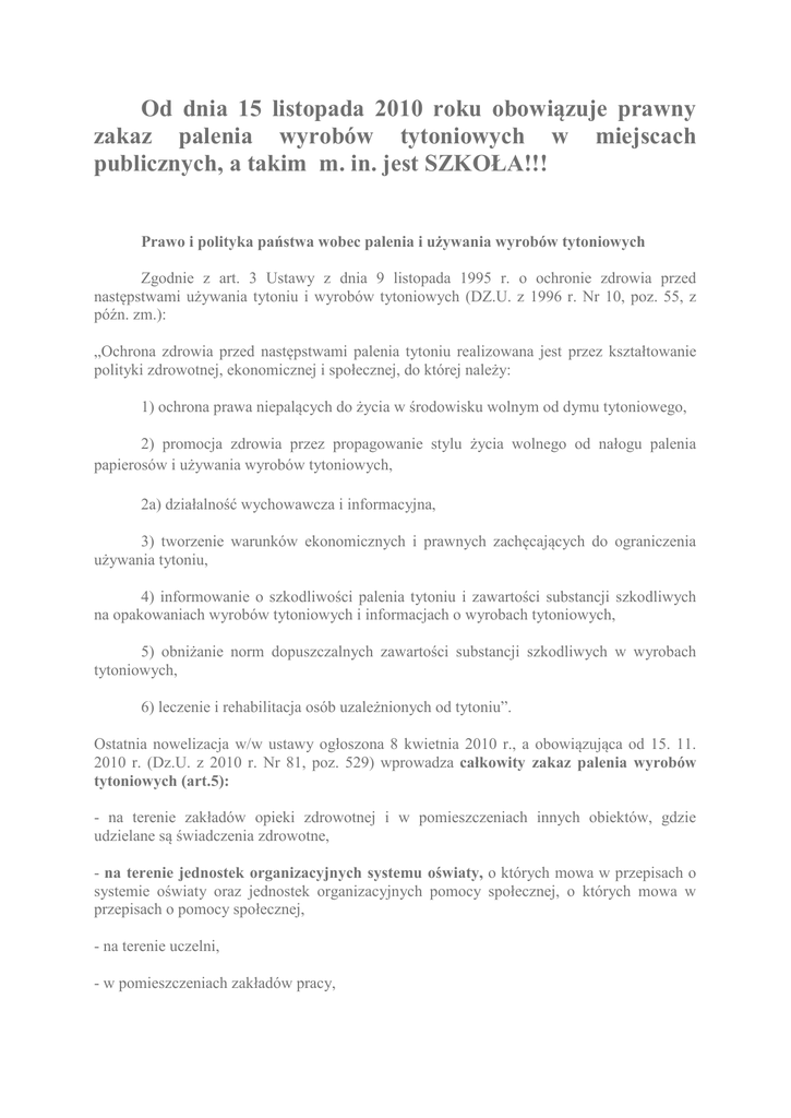 Od dnia 15 listopada 2010 roku obowiązuje prawny zakaz palenia wyrobów tytoniowych w miejscach publicznych, a takim m. in. jest SZKOŁA!!! Prawo i polityka państwa wobec palenia i używania wyrobów tytoniowych Zgodnie z art. 3 Ustawy z dnia 9 listopada 1995 r. o ochronie zdrowia przed następstwami używania tytoniu i wyrobów tytoniowych (DZ.U. z 1996 r. Nr 10, poz. 55, z późn. zm.): „Ochrona zdrowia przed następstwami palenia tytoniu realizowana jest przez kształtowanie polityki zdrowotnej, ekonomicznej i społecznej, do której należy: 1) ochrona prawa niepalących do życia w środowisku wolnym od dymu tytoniowego, 2) promocja zdrowia przez propagowanie stylu życia wolnego od nałogu palenia papierosów i używania wyrobów tytoniowych, 2a) działalność wychowawcza i informacyjna, 3) tworzenie warunków ekonomicznych i prawnych zachęcających do ograniczenia używania tytoniu, 4) informowanie o szkodliwości palenia tytoniu i zawartości substancji szkodliwych na opakowaniach wyrobów tytoniowych i informacjach o wyrobach tytoniowych, 5) obniżanie norm dopuszczalnych zawartości substancji szkodliwych w wyrobach tytoniowych, 6) leczenie i rehabilitacja osób uzależnionych od tytoniu”. Ostatnia nowelizacja w/w ustawy ogłoszona 8 kwietnia 2010 r., a obowiązująca od 15. 11. 2010 r. (Dz.U. z 2010 r. Nr 81, poz. 529) wprowadza całkowity zakaz palenia wyrobów tytoniowych (art.5): - na terenie zakładów opieki zdrowotnej i w pomieszczeniach innych obiektów, gdzie udzielane są świadczenia zdrowotne, - na terenie jednostek organizacyjnych systemu oświaty, o których mowa w przepisach o systemie oświaty oraz jednostek organizacyjnych pomocy społecznej, o których mowa w przepisach o pomocy społecznej, - na terenie uczelni, - w pomieszczeniach zakładów pracy, - w pomieszczeniach obiektów kultury i wypoczynku do użytku publicznego, - w lokalach gastronomiczno – rozrywkowych, - w środkach pasażerskiego transportu publicznego oraz w obiektach służących obsłudze podróżnych, - na przystankach komunikacji publicznej, - w pomieszczeniach obiektów sportowych, - w ogólnodostępnych miejscach przeznaczonych do zabaw dzieci, - w innych pomieszczeniach dostępnych do użytku publicznego. Kto pali wyroby tytoniowe w miejscach objętych zakazami określonymi w art. 5 podlega karze grzywny do 500 zł. (art.13, §2). Palenie papierosów jest chorobą! Palenie prowadzi do uzależnienia, które ma wymiar: - psychiczny – nawyk wykonywania pewnych czynności w określonych sytuacjach, - fizyczny – uzależnienie organizmu od substancji chemicznej (nikotyna) zawartej w papierosach. Mechanizm fizycznego i psychicznego uzależnienia od tytoniu przypomina analogiczne schematy uzależnienia od alkoholu i narkotyków. Zespół uzależnienia od tytoniu - objawy: - silna potrzeba używania tytoniu, - trudności kontrolowania tego zachowania, - uporczywe używanie tytoniu wbrew wiedzy o szkodliwych następstwach, - przedkładanie używania tytoniu ponad inne zajęcia i zobowiązania, - występowanie objawów zespołu abstynenckiego. Palenie tytoniu jest uleczalne! Zespół uzależnienia od tytoniu jest chorobą. Leczenie zespołu uzależnienia od tytoniu, jak każdej choroby przewlekłej, wymaga kompleksowego leczenia, w którym uczestniczą: lekarz, inni pracownicy ochrony zdrowia (psycholog, terapeuta, pielęgniarka) oraz pacjent. Nowoczesna farmakologia oferuje coraz więcej możliwości leczenia zespołu uzależnienia od tytoniu i łagodzenia objawów odstawienia papierosów. Dobór najbardziej skutecznej metody powinien być wspólną decyzją pacjenta i lekarza. Zgłoś swój problem dla lekarza rodzinnego, który udzieli Ci wsparcia i pomoże wyjść z nałogu! Życzę powodzenia każdemu palącemu, kto podejmie wyzwanie wyjścia z nałogu. Uwierz, że się uda, a wygrasz z nałogiem i wygrasz zdrowie! Pedagog szkolny Renata Pałejko