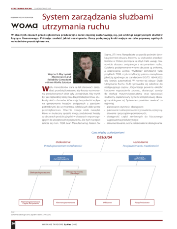 UTRZYMANIE RUCHU ZARZĄDZANIE SUR RUBRYKA POD PATRONATEM System zarządzania służbami utrzymania ruchu W obecnych czasach przedsiębiorstwa produkcyjne coraz częściej zastanawiają się, jak uniknąć negatywnych skutków kryzysu finansowego. Próbując znaleźć jakieś rozwiązanie, firmy podejmują kroki mające na celu poprawę ogólnych wskaźników przedsiębiorstwa. Wojciech Mączyński Maintenance and Reliability Consultant w firmie WoMa Solution W ielu menedżerów stara się tak sterować i zarządzać przedsiębiorstwem, aby koszty wytworzenia produkowanych dóbr były jak najniższe. Aby wynik był jak najbardziej korzystny dla przedsiębiorstwa, szuka się takich obszarów, które mają bezpośredni wpływ na generowanie kosztów związanych z zasobami potrzebnymi do wytworzenia właściwych dóbr przez przedsiębiorstwo. Obecnie istnieje wiele narzędzi, które w skuteczny sposób mogą zredukować koszty w obszarach produkcyjnych i w obszarach wspomagających do akceptowalnego poziomu. Do tych narzędzi zalicza się m.in.: TQM, Lean Manufacturing, Kaizen, Six Sigma, JIT i inne. Narzędzia te w sposób pośredni dotykają również obszaru, któremu w większości przedsiębiorstw w Polsce poświęca się zbyt mało uwagi, mianowicie obszaru związanego z utrzymaniem ruchu. Działania podejmowane w tym obszarze są znikome, a oczekiwania wielkie. Wystarczy przytoczyć tutaj przykład z TQM, czyli certyfikację systemu zarządzania jakością zgodnego ze standardem ISO/TS 16949:2002 (dla branży automotive). W normie tej obszar Służb Utrzymania Ruchu (SUR) sprowadza się zaledwie do następującego zapisu: „Organizacja powinna określić kluczowe wyposażenie procesu, dostarczyć zasoby do obsługi maszyn/wyposażenia oraz opracować skuteczny, zaplanowany system kompleksowej obsługi zapobiegawczej. System ten powinien zawierać co najmniej: • planowane czynności obsługowe; • pakowanie i zabezpieczanie wyposażenia, oprzyrządowania i przyrządów pomiarowych; • dostępność części zamiennych do kluczowego wyposażenia produkcyjnego; • dokumentowanie, ocenę i doskonalenie obsługiwania. Czas między uszkodzeniami OBSŁUGA Uszkodzenie Przed ujawnieniem niezdatności Uszkodzenie Po ujawnienieniu niezdatności OBSŁUGA NAPRAWCZA OBSŁUGA ZAPOBIEGAWCZA Obsługa diagnostyczna Harmonogramowana, Ciągła, Na życzenie Obsługa wg resursu czasowego Harmonogramowana RYS. 1 Schemat obsługiwania zgodnie z EN13306:2010 26 W Y D A N I E TA R G O W E S y M a s 2 0 1 2 Odłożona Natychmiastowa ZARZĄDZANIE SUR Organizacja powinna stosować metody obsługi przewidywanej, aby ciągle doskonalić skuteczność i efektywność wyposażenia produkcyjnego”. Zapis ten prowadzi niestety wyłącznie do pobieżnego sprawdzenia procedur, czy też do stwierdzenia, że wyżej opisany punkt jest realizowany zgodnie z normą. W rzeczywistości kontrola taka przebiega nie dłużej niż 10–15 minut podczas trzydniowego audytu, co stanowi około 1% czasu! Warto podkreślić, że obszar utrzymania ruchu jest obszarem ważnym dla całego przedsiębiorstwa produkcyjnego i w dużej mierze odpowiada za generowanie kosztów. Historia SUR nieodzownie związana jest z rozwojem zakładów przemysłowych. Na początku można było mówić o strategii utrzymania ruchu, jako o regule „od awarii do awarii”. Wraz z pojawieniem się urządzeń wykorzystywanych na przemysłową skalę pojawiła się nowa strategia utrzymania ruchu – polityka remontowa (shutdown maintenance). Maszyny przemysłowe odznaczały się dawniej wysoką zawodnością. Kiedy dochodziło do uszkodzenia, zatrzymywano dane urządzenie. Aby uniknąć takich przypadków, zaczęto produkować znacznie więcej niż rynek oczekiwał, tworząc tym samym zapasy wyrobów gotowych. Gdy zapasów było wystarczająco dużo, podejmowano decyzję o zatrzymaniu zakładu oraz o naprawie i przebudowie poszczególnych maszyn i urządzeń. Przerwa taka trwała czasami do dwóch miesięcy. Te postoje były pierwszymi przykładami prawdziwej strategii znanej obecnie jako planowana konserwacja/przegląd (planned maintenance). Od tamtych czasów niewiele się zmieniło, jeżeli chodzi o strategię utrzymania ruchu. W dalszym ciągu dominującą strategią jest ta „od awarii do awarii”, jak również szeroko stosowana polityka remontowa, oparta na kalendarzu przeglądów z różną częstotliwością (miesięcznych / kwartalnych / półrocznych / rocznych). Znaczenie działów UR w każdej firmie ulega ciągłym zmianom, a co za tym idzie – również wyzwaniom. Wyzwania te wymagają zastosowania odpowiednich narzędzi pozwalających stawić czoła zakładanym celom. W praktyce wdrożenie systemu doskonalącego działania obsługi technicznej stanowi strategiczne podejście mające na celu: UTRZYMANIE RUCHU WEJŚCIE PLANOWANIE W/O WYJŚCIE WYKONANIE WEJŚCIE EM ANALIZA NIEZAWODNOŚCI RYS. 2 Diagram przepływu procesów w SUR • zmianę modelu „funkcyjnego” służb UR w model procesowy obsługi technicznej, zintegrowany z procesami produkcyjnymi i technologicznymi; • połączenie aspektów jakościowych z systemami technicznymi, które zarządzane są przez pracowników; • wykorzystanie właściwych narzędzi w celu ciągłego doskonalenia efektywności maszyn i urządzeń poprzez niezawodność i obsługę techniczną; • obniżenie kosztów obsługi technicznej, jako składowej kosztów operacyjnych; • zwiększenie dostępności pracy środków produkcji. Chcąc sprostać coraz to większym wymaganiom, przedsiębiorstwa szukają najnowocześniejszych metod zarządzania poszczególnymi obszarami przedsiębiorstwa i sukcesywnie dostosowują te rozwiązania do swoich potrzeb. Tego typu podejście prowadzi do przyjrzenia się uważniej niezawodności wyposażenia technicznego przedsiębiorstw. Niezawodność w dużej liczbie przedsiębiorstw odgrywa coraz bardziej znaczącą rolę. Wielu menedżerów zdaje sobie sprawę z fakt