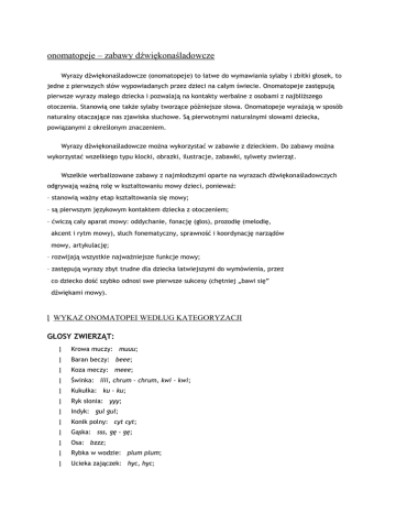 onomatopeje – zabawy dźwiękonaśladowcze Wyrazy dźwiękonaśladowcze (onomatopeje) to łatwe do wymawiania sylaby i zbitki głosek, to jedne z pierwszych słów wypowiadanych przez dzieci na całym świecie. Onomatopeje zastępują pierwsze wyrazy małego dziecka i pozwalają na kontakty werbalne z osobami z najbliższego otoczenia. Stanowią one także sylaby tworzące późniejsze słowa. Onomatopeje wyrażają w sposób naturalny otaczające nas zjawiska słuchowe. Są pierwotnymi naturalnymi słowami dziecka, powiązanymi z określonym znaczeniem. Wyrazy dźwiękonaśladowcze można wykorzystać w zabawie z dzieckiem. Do zabawy można wykorzystać wszelkiego typu klocki, obrazki, ilustracje, zabawki, sylwety zwierząt. Wszelkie werbalizowane zabawy z najmłodszymi oparte na wyrazach dźwiękonaśladowczych odgrywają ważną rolę w kształtowaniu mowy dzieci, ponieważ: – stanowią ważny etap kształtowania się mowy; – są pierwszym językowym kontaktem dziecka z otoczeniem; – ćwiczą cały aparat mowy: oddychanie, fonację (głos), prozodię (melodię, akcent i rytm mowy), słuch fonematyczny, sprawność i koordynację narządów mowy, artykulację; – rozwijają wszystkie najważniejsze funkcje mowy; – zastępują wyrazy zbyt trudne dla dziecka łatwiejszymi do wymówienia, przez co dziecko dość szybko odnosi swe pierwsze sukcesy (chętniej „bawi się” dźwiękami mowy). WYKAZ ONOMATOPEI WEDŁUG KATEGORYZACJI GŁOSY ZWIERZĄT: Krowa muczy: muuu; Baran beczy: beee; Koza meczy: meee; Świnka: iiii, chrum - chrum, kwi - kwi; Kukułka: ku - ku; Ryk słonia: yyy; Indyk: gul gul; Konik polny: cyt cyt; Gąska: sss, gę - gę; Osa: bzzz; Rybka w wodzie: plum plum; Ucieka zajączek: hyc, hyc; Mruczy miś: mmm; Leci trzmiel: www; Grucha gołąb: gruchu gruchu; Ryczy osiołek: i - ja; Wrona: kra - kra; Bocian: kle - kle; Gdacze kura: ko ko; Pieje kogut: kukuryku; Kaczka: kwa kwa; Kot miauczy: miau miau; Kot mruczy: mirr mirr; Galop konia: klap – klap; Koń rży: iha - ha; Koń parska: prr; Pies szczeka: hau hau; Pies warczy: wrr; Wilk wyje: a - uuu; Wilk kłapie zębami: kłap kłap; Żaba: kum - kum, uła - kła, kła; Skomli szczeniak: ńńń; Ćwierkają wróble: ćwir, cwir; Odlatuje ptaszek: frrr; Sowa: uhu, uhu; Lew: yhh; Kurczątko: pi pi; itp. ODGŁOSY POJAZDÓW: Jedzie samochód: brum, brum; Samochód trąbi: ti - tit, pi - bi, pi - pip; Odpalanie samochodu: trum, trum; Jedzie pociąg: fu - fu, czczcz; Zatrzymanie pociągu: czszszsz; Straż pożarna: e - u; Karetka pogotowia: i - u; Policja: e - o; Odgłosy lokomotywy: uch, buch, uf, puch; Lokomotywa gwiżdże: u - u - uuu; Jedzie lokomotywa: tuk, tuk; Tramwaj: deń, deń; Informacja o odjeździe autobusu: drn, drn; Otwieranie drzwi automatycznych w autobusie: psss; Leci samolot: żżż; Dzwonek roweru: dzeń, dzeń, dzeń; itd. GŁOSY LUDZI: Dzieci śpiewają: la la la; Dziecko płacze: e, e, e; Kichanie: a - psik; Kaszel: yhy, yhy; Śmiech mamy: ha - ha; Śmiech dziecka: hi - hi; Śmiech taty: he - he; Śmiech Św. Mikołaja: ho - ho; Podskoki: hop - hop; Okrzyki radości: hip - hip; itd. ODGŁOSY PRZEDMIOTÓW: Pukanie: puk, puk; Uderzanie: buch, buch; Stukot: pyk, pyk; Mały zegarek: cyk, cyk; Zegar ścienny: tik - tak; Dzwonek: dzyń, dzyń; Dzwoneczki: deń deń; Dzwon: bim - bam; Zegar ścienny: Pracuje wiertarka: dżdżdż; Pękł balon: trach - buch; Uchodzi powietrze z balonika: sss; Dzwoni budzik: dry, dry; Dzwoni telefon: dryń, dryń; Gwiżdże czajnik: iiii; W czajniku gotuje się woda: szszsz; Nożyce: ciach, ciach; itd. tik - tak; DZWIĘKI INSTRUMENTÓW: Bębenek: bum, bum; Skrzypce: li, li, li; Trąbka: tra-ta, ta, ta, ta; Gitara: plum, plum; Flet: fi, fi, fi; Cymbałki: bim, bim, bim; Tamburyno: sza, sza, sza; itd. DZWIĘKI SYTUACYJNE: Strzelanie: pif - paf; Zmarznięte ręce: chu, chu; Piłka w bramce: gol; Kapanie wody: kap, kap; Szorowanie podłogi: szuru, szuru; Pranie: chlupu, chlupu; Zimno: brrr; Rozmowa przez telefon: halo, halo; Stukanie do drzwi: puk, puk; Nawoływanie w lesie: hop, hop; Okrzyk radości: hip, hip; Usypianie dziecka: aaa; Uciszanie dziecka: ćśśś; Przepędzanie kurek: a - sio; Nawoływanie kurcząt: cip, cip; Wołanie kota: kici, kici; ci, ci. Nawoływanie gęsi: dzicia, dzicia; Poganianie konia: wio; Zatrzymywanie konia: prr; Rzucanie, uderzanie: bęc; Wiatr: szszsz; Szorowanie: szuru - buru; itd. Odgłosy zwierząt Kotek miauczy miau, miau, miau. Piesek szczeka hau, hau, hau. Żabka kumka kum, kum, kum. Rybka pluska plum, plum, plum. Świnka kwiczy kwi, kwi, kwi. A kurczaczek pi, pi, pi. Baran beczy be, be, be. Mała kózka me, me, me. Jeże tupią tup, tup, tup. Krecik słyszy łup, łup, łup. Gąska gęga gę, gę, gę. Bocian woła kle, kle, kle. Krowa muczy mu, mu, mu. Gdzie cielątko? Tu, tu, tu. Pszczoła robi bzzz, bzzz, bzzz. Ptak odleciał frr, frr, frr. Kaczka kwacze kwa, kwa, kwa. Konik rży iha, ha, ha. Kura gdacze ko, ko, ko. Dziadek na to ho, ho, ho. Małpka fika fik, fik, fik. Słoń Katarek ma a psik! Królik kica kic, kic, kic. Mała myszka nie ma nic. Zwierzęce gadanie Co mówi bocian, gdy żabkę zjeść chce? Kle, kle, kle. Co mówi żaba, gdy bocianów tłum? Kum, kum, kum. Co mówi kotek, gdy mleczka by chciał? Miau, miau, miau. Co mówi kura, gdy znosi jajko? Ko, ko, ko. Co mówi kogut, gdy budzi się w kurniku? Ku - ku- ryku. Co mówi koza, gdy jeść jej się chce? Me, me, me. Co mówi krowa, gdy brak jej tchu? Mu, mu, mu. Co mówi piesek, gdy kość zjeść chciał? Hau, hau, hau. Co mówi baran, gdy spać mu się chce? Be, be, be. Co mówi ryba, gdy powiedzieć chce? Mu, mu! Nic! Przecież ryby nie mają głosu. Ojej! Co słychać na wsi? Co słychać? Zależy - gdzie. Na łące słychać: Kle, kle! Na stawie: Kum, kum! Na polu: Ku - ku, ku - ku! Przed kurnikiem: Kukuryku! Ko - ko - ko - ko - ko - w kurniku. Koło budy słychać: Hau, hau! A na progu: Miau... A co słychać w domu, Nie powiem nikomu! W. Chotomska