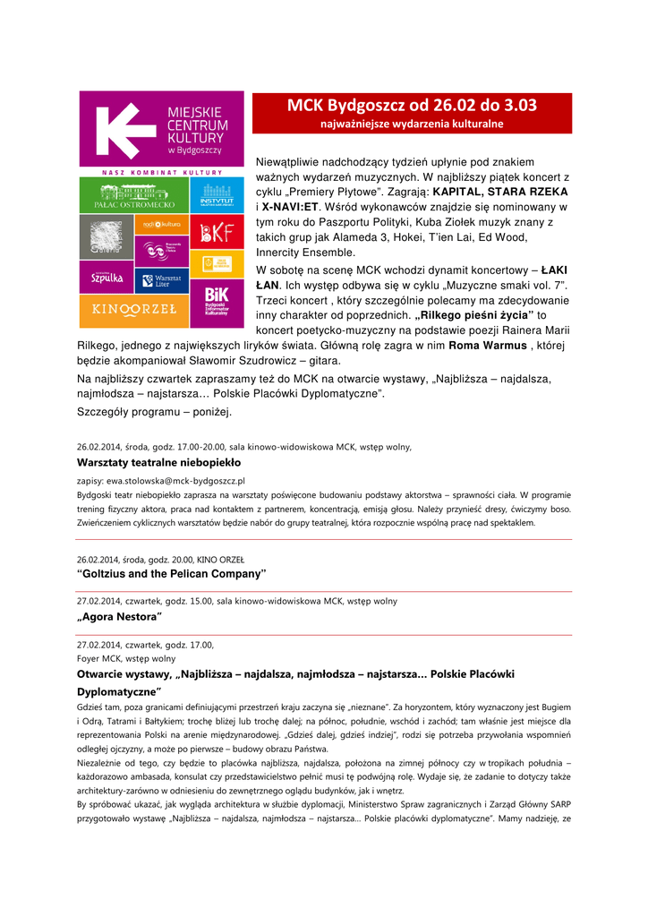 MCK Bydgoszcz od 26.02 do 3.03 najważniejsze wydarzenia kulturalne Niewątpliwie nadchodzący tydzień upłynie pod znakiem ważnych wydarzeń muzycznych. W najbliższy piątek koncert z cyklu „Premiery Płytowe”. Zagrają: KAPITAL, STARA RZEKA i X-NAVI:ET. Wśród wykonawców znajdzie się nominowany w tym roku do Paszportu Polityki, Kuba Ziołek muzyk znany z takich grup jak Alameda 3, Hokei, T’ien Lai, Ed Wood, Innercity Ensemble. W sobotę na scenę MCK wchodzi dynamit koncertowy – ŁAKI ŁAN. Ich występ odbywa się w cyklu „Muzyczne smaki vol. 7”. Trzeci koncert , który szczególnie polecamy ma zdecydowanie inny charakter od poprzednich. „Rilkego pieśni życia” to koncert poetycko-muzyczny na podstawie poezji Rainera Marii Rilkego, jednego z największych liryków świata. Główną rolę zagra w nim Roma Warmus , której będzie akompaniował Sławomir Szudrowicz – gitara. Na najbliższy czwartek zapraszamy też do MCK na otwarcie wystawy, „Najbliższa – najdalsza, najmłodsza – najstarsza… Polskie Placówki Dyplomatyczne”. Szczegóły programu – poniżej. 26.02.2014, środa, godz. 17.00-20.00, sala kinowo-widowiskowa MCK, wstęp wolny, Warsztaty teatralne niebopiekło zapisy: [email protected] Bydgoski teatr niebopiekło zaprasza na warsztaty poświęcone budowaniu podstawy aktorstwa – sprawności ciała. W programie trening fizyczny aktora, praca nad kontaktem z partnerem, koncentracją, emisją głosu. Należy przynieść dresy, ćwiczymy boso. Zwieńczeniem cyklicznych warsztatów będzie nabór do grupy teatralnej, która rozpocznie wspólną pracę nad spektaklem. 26.02.2014, środa, godz. 20.00, KINO ORZEŁ “Goltzius and the Pelican Company” 27.02.2014, czwartek, godz. 15.00, sala kinowo-widowiskowa MCK, wstęp wolny „Agora Nestora” 27.02.2014, czwartek, godz. 17.00, Foyer MCK, wstęp wolny Otwarcie wystawy, „Najbliższa – najdalsza, najmłodsza – najstarsza… Polskie Placówki Dyplomatyczne” Gdzieś tam, poza granicami definiującymi przestrzeń kraju zaczyna się „nieznane”. Za horyzontem, który wyznaczony jest Bugiem i Odrą, Tatrami i Bałtykiem; trochę bliżej lub trochę dalej; na północ, południe, wschód i zachód; tam właśnie jest miejsce dla reprezentowania Polski na arenie międzynarodowej. „Gdzieś dalej, gdzieś indziej”, rodzi się potrzeba przywołania wspomnień odległej ojczyzny, a może po pierwsze – budowy obrazu Państwa. Niezależnie od tego, czy będzie to placówka najbliższa, najdalsza, położona na zimnej północy czy w tropikach południa – każdorazowo ambasada, konsulat czy przedstawicielstwo pełnić musi tę podwójną rolę. Wydaje się, że zadanie to dotyczy także architektury-zarówno w odniesieniu do zewnętrznego oglądu budynków, jak i wnętrz. By spróbować ukazać, jak wygląda architektura w służbie dyplomacji, Ministerstwo Spraw zagranicznych i Zarząd Główny SARP przygotowało wystawę „Najbliższa – najdalsza, najmłodsza – najstarsza… Polskie placówki dyplomatyczne”. Mamy nadzieję, ze współpraca ZG SARP i MSZ pozwoli nie tylko ukazać aktualny obraz „architektonicznej dyplomacji”, ale także – i może po pierwsze – spojrzeć z nadzieją w przyszłość. 27.02.2014, czwartek, godz. 17.00-20.00, sala kinowo-widowiskowa MCK, wstęp wolny, Warsztaty teatralne niebopiekło zapisy: [email protected] 27.02.2014, środa, godz. 20.00, KINO ORZEŁ “Goltzius and the Pelican Company” 27.02.2014, czwartek, godz. 20.00, KINO JEREMI – Fordon „Wielkie piękno” 28.02.2014, piątek, godz. 9.00 i 10.45, sala kinowo-widowiskowa MCK, bilety 7 zł, Teatr Małych Form z Bydgoszczy oraz Artur Maćkowiak – spektakl – lekcja teatralna pt.: „Tajemnice pantomimy” rezerwacje: [email protected] Program składa się z trzech części: I – Pokaz etiud z akompaniamentem gitary; II – Wyjaśnienie i zobrazowanie podstawowych terminów z zakresu pantomimy: gest, ruch, mimika; III – Etiuda pantomimiczna z udziałem dzieci. WYKONAWCY: Aktor mim – Mieczysław Giedrojć. Muzyk – Artur Maćkowiak. Spektakl prezentowany był między innymi na festiwalach: w Anglii i we Francji. 28.02.2014, piątek, godz. 20.00, sala kinowo-widowiskowa MCK, wstęp wolny Premiery Płytowe: KAPITAL / STARA RZEKA / X-NAVI:ET KAPITAL. Spotkanie dwóch artystów na co dzień poruszających się w odmiennych stylistykach. Zderzenie dwóch muzycznych światów: psychoaktywnej elektroakustyki budowanej na brzmieniu instrumentów elektronicznych i dźwięków znalezionych oraz ekstremalnej psychodelii opartej na dźwiękach przetworzonej gitary. X-NAVI:ET. Rafał Iwański – współzałożyciel i muzyk grupy HATI, łączącej eksploracje na polu muzyki rytualno-medytacyjnej i improwizowanej. Zagrał setki koncertów w Europie i USA, także w kooperacji z innymi artystami. STARA RZEKA. Kuba Ziołek – muzyk znany z takich grup jak Alameda 3, Hokei, T’ien Lai, Ed Wood, Innercity Ensemble. Występuje solo jako Stara Rzeka, wykorzystuje przetworzone dźwięki gitary elektrycznej w duchu muzyki noise, ambient i psychodelicznej. Debiutancki album Starej Rzeki pt. „Cień chmury nad ukrytym polem” wydany wiosną 2013 r. w wersji kompaktowej (Instant Classic) i na kasecie (Few Quiet People), spotkał się z entuzjastycznym przyjęciem ze strony słuchaczy i mediów. 28.02.2014, piątek, godz. 20.00, KINO JEREMI – Fordon „Goltzius and the Pelican Company” 1.03.2014, sobota, godz. 19.00, start koncertu 20.00, sala kinowa-widowiskowa MCK, wstęp 35 zł (przedsprzedaż) i 40 zł (w dniu koncertu) bilety do kupienia w: Sklep Muzyka ul. Śniadeckich 50 i kasie MCK Muzyczne smaki vol. 7 – Łąki Łan – koncert Łąki Łan to zespół, który zrodził się na Jam Sessions w warszawskich klubach. Granie na żywo mają we krwi. Proces tworzenia zawsze zaczyna się na scenie a studio jest jego dopełnieniem. Słyną z niesamowicie energetycznych koncertów. Wypracowali s