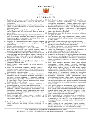 REGULAMIN 1. 2. 3. 4. 5. 6. 7. 8. 9. 10. 11. 12. 13. 14. 15. 16. 17. 18. 19. Regulamin obowiązuje wszystkie osoby przebywające na terenie Hotelu Hetmański***, Podlas 46, 96-200 Rawa Mazowiecka. Opiekunem Gościa jest recepcja hotelowa, tel. wew. 100. Opłata za pobyt pobierana jest od Gościa w dniu przyjazdu do hotelu (z góry). W przypadku rezygnacji Gościa z pobytu w hotelu w trakcie trwania doby, nie jest zwracana opłata za pobyt w danym dniu. W przypadku rezerwacji pokoju i niestawiennictwa się do godz. 18.00 w dniu rezerwacji, hotel zastrzega sobie prawo do pobrania opłaty za jedną dobę hotelową. Hotel może obciążyć opłatą kartę kredytową Gościa. Podstawą do zameldowania Gościa jest okazanie dowodu osobistego lub paszportu oraz podpisania Karty meldunkowej. Pokój w hotelu wynajmowany jest na doby. Doba hotelowa trwa od godz. 14.00 do godz. 12.00. Jeśli Gość nie określił czasu pobytu najmując pokój przyjmuje się, ze pokój został wynajęty na jedną dobę. Życzenie przedłużenia pobytu poza okres wskazany w dniu przybycia, Gość hotelowy powinien zgłosić w recepcji do godz. 10.00 dnia, w którym upływa termin najmu pokoju. Zatrzymanie pokoju po godz. 14.00 jest traktowane jako przedłużenie pobytu. Hotel uwzględnia życzenia przedłużenia pobytu w miarę dostępności wolnych pokoi. Hotel świadczy usługi zgodnie ze swoją kategorią i standardem. Hotel ma obowiązek zapewnić: warunki pełnego i nieskrępowanego wypoczynku Gościa, bezpieczeństwo pobytu, w tym zachowanie tajemnicy informacji o Gościu, profesjonalną i uprzejmą obsługę. Na życzenie Gościa hotel świadczy nieodpłatnie następujące usługi: udzielania informacji związanych z pobytem i podróżą, budzenie o wyznaczonej godzinie, przechowywanie pieniędzy i przedmiotów wartościowych w czasie pobytu Gościa w hotelu, przechowywanie bagażu Gości zameldowanych w hotelu. Gość powinien zawiadomić recepcję hotelową o wystąpieniu szkody niezwłocznie po jej stwierdzeniu. Odpowiedzialność hotelu z tytułu utraty lub uszkodzenia pieniędzy, papierów wartościowych, kosztowności albo przedmiotów mających wartość naukową lub artystyczną jest ograniczona, jeżeli przedmioty te nie zostaną oddane do depozytu hotelowego. Hotel zastrzega sobie prawo odmowy przyjęcia do depozytu hotelowego przedmiotów o dużej wartości lub dużych kwot pieniędzy. 20. Gość hotelowy ponosi odpowiedzialność materialną za wszelkiego rodzaju uszkodzenia lub zniszczenia przedmiotów wyposażenia i urządzeń technicznych hotelu powstałe z jego winy lub z winy odwiedzających Go osób. 21. Każdorazowo opuszczając pokój Gość powinien zamknąć okna, wyłączyć telewizor i radio, zgasić światło, zamknąć krany instalacji wodociągowej, sprawdzić zamknięcie drzwi, a kartę chip pozostawić w recepcji. 22. Za zagubienie karty chip do zamka hotelowego pobierana jest opłata 50 zł netto. 23. Gość hotelowy nie może przekazywać pokoju osobom trzecim, nawet jeśli nie upłynął okres, za który uiścił należną za pobyt opłatę. 24. Zabronione jest wprowadzanie zwierząt na teren hotelu. 25. Palenie tytoniu w pokojach hotelowych, korytarzu, klatce schodowej i holu recepcyjnym jest zabronione. 26. W pokoju zabronione jest przechowywanie ładunków niebezpiecznych oraz broni i amunicji. 27. Osoby nie zameldowane w hotelu mogą przebywać w pokoju hotelowym od godz. 7.00 do godz. 22.00. 28. W hotelu obowiązuje zachowanie ciszy w godz. 22 -7. 29. Ze względu na bezpieczeństwo przeciwpożarowe zabronione jest używanie w pokojach grzałek, żelazek elektrycznych i innych podobnych urządzeń nie stanowiących wyposażenia pokoju hotelowego. Nie dotyczy to ładowarek i zasilaczy komputerów. 30. Hotel może odmówić przyjęcia Gościa, który podczas poprzedniego pobytu rażąco naruszył Regulamin wyrządzając szkodę w mieniu hotelowym lub Gości albo szkodę innym osobom albo też w inny sposób zakłócił spokojny pobyt Gości lub funkcjonowanie hotelu. Osoba taka zobowiązana jest do niezwłocznego zastosowania się do żądań hotelu, w szczególności zapłaty za poczynione uszkodzenia i zniszczenia oraz opuszczenia terenu hotelu. 31. Przedmioty osobistego użytku pozostawione przez wyjeżdżającego Gościa w pokoju hotelowym będą odesłane na adres wskazany przez Gościa. W przypadku nie otrzymania takiej dyspozycji, hotel przechowa te przedmioty przez 3 miesiące. Po tym terminie przedmioty te przepadają na rzecz hotelu. 32. Gość wyraża zgodę na przetwarzanie danych osobowych do celów meldunku oraz umieszczenia danych Gościa w bazie danych hotelu zgodnie z ustawą z dnia 29.10.1997r. o ochronie danych osobowych. (Dz.U. Nr 133 z 1997 r., poz. 883 z późn. zm.). Gość ma prawo wglądu do swoich danych osobowych oraz do ich poprawiania. 33. Gość wyraża zgodę na wystawienie faktur vat bez podpisu. 34. Hotel Hetmański*** nieodpłatnie oddaje w prywatne użytkowanie na czas pobytu, a Gość wypożycza na czas pobytu, do własnego, osobistego użytku odbiornik radiowy i telewizyjny. Hotel nie ponosi odpowiedzialności za uszkodzenie lub 35. Sądem właściwym do rozstrzygania sporów pomiędzy utratę samochodu lub innego pojazdu należącego do Gościem hotelowym a Hotelem jest sąd właściwy dla Gościa. siedziby głównej firmy SALAM Sławomir Zalewski. Hotel Hetmański***, Podlas 46, 96-200 Rawa Mazowiecka, Poland tel. +48 46 814-42-32, fax +48 46 814-00-61, e-mail: [email protected], www.hetmanski.pl