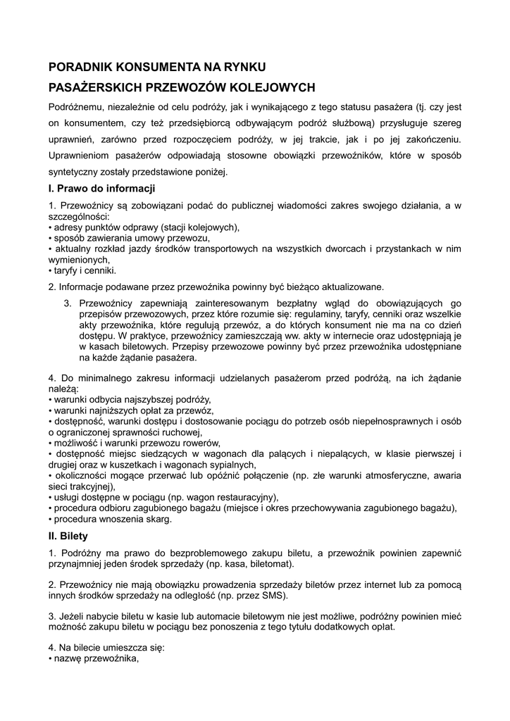 PORADNIK KONSUMENTA NA RYNKU PASAŻERSKICH PRZEWOZÓW KOLEJOWYCH Podróżnemu, niezależnie od celu podróży, jak i wynikającego z tego statusu pasażera (tj. czy jest on konsumentem, czy też przedsiębiorcą odbywającym podróż służbową) przysługuje szereg uprawnień, zarówno przed rozpoczęciem podróży, w jej trakcie, jak i po jej zakończeniu. Uprawnieniom pasażerów odpowiadają stosowne obowiązki przewoźników, które w sposób syntetyczny zostały przedstawione poniżej. I. Prawo do informacji 1. Przewoźnicy są zobowiązani podać do publicznej wiadomości zakres swojego działania, a w szczególności: • adresy punktów odprawy (stacji kolejowych), • sposób zawierania umowy przewozu, • aktualny rozkład jazdy środków transportowych na wszystkich dworcach i przystankach w nim wymienionych, • taryfy i cenniki. 2. Informacje podawane przez przewoźnika powinny być bieżąco aktualizowane. 3. Przewoźnicy zapewniają zainteresowanym bezpłatny wgląd do obowiązujących go przepisów przewozowych, przez które rozumie się: regulaminy, taryfy, cenniki oraz wszelkie akty przewoźnika, które regulują przewóz, a do których konsument nie ma na co dzień dostępu. W praktyce, przewoźnicy zamieszczają ww. akty w internecie oraz udostępniają je w kasach biletowych. Przepisy przewozowe powinny być przez przewoźnika udostępniane na każde żądanie pasażera. 4. Do minimalnego zakresu informacji udzielanych pasażerom przed podróżą, na ich żądanie należą: • warunki odbycia najszybszej podróży, • warunki najniższych opłat za przewóz, • dostępność, warunki dostępu i dostosowanie pociągu do potrzeb osób niepełnosprawnych i osób o ograniczonej sprawności ruchowej, • możliwość i warunki przewozu rowerów, • dostępność miejsc siedzących w wagonach dla palących i niepalących, w klasie pierwszej i drugiej oraz w kuszetkach i wagonach sypialnych, • okoliczności mogące przerwać lub opóźnić połączenie (np. złe warunki atmosferyczne, awaria sieci trakcyjnej), • usługi dostępne w pociągu (np. wagon restauracyjny), • procedura odbioru zagubionego bagażu (miejsce i okres przechowywania zagubionego bagażu), • procedura wnoszenia skarg. II. Bilety 1. Podróżny ma prawo do bezproblemowego zakupu biletu, a przewoźnik powinien zapewnić przynajmniej jeden środek sprzedaży (np. kasa, biletomat). 2. Przewoźnicy nie mają obowiązku prowadzenia sprzedaży biletów przez internet lub za pomocą innych środków sprzedaży na odległość (np. przez SMS). 3. Jeżeli nabycie biletu w kasie lub automacie biletowym nie jest możliwe, podróżny powinien mieć możność zakupu biletu w pociągu bez ponoszenia z tego tytułu dodatkowych opłat. 4. Na bilecie umieszcza się: • nazwę przewoźnika, • relacje lub strefę przejazdu, • wysokość należności za przejazd, • zakres uprawnień pasażera do ulgowego przejazdu. 5. Bilet może zawierać inne dane, w tym dane osobowe pasażera, jeżeli jest to niezbędne dla przewoźnika. III. Przewóz rzeczy 1. Podróżny może zabrać ze sobą do pociągu rzeczy, jak również oddać je do przewozu jako przesyłkę bagażową. 2. Zabronione jest przewożenie rzeczy niebezpiecznych lub mogących wyrządzić szkodę osobom lub mieniu, zwłok i szczątków zwłok ludzkich oraz innych przedmiotów zabronionych na podstawie odrębnych przepisów. 3. Przewoźnik może sprawdzić, czy zawartość przesyłek nie narusza powyższych zakazów. 4. Przewoźnik jest obowiązany ogłosić w rozkładach jazdy lub w inny odpowiedni sposób ograniczenia możliwości przewozu przesyłek bagażowych w poszczególnych kursach. 5. Przewoźnik może odmówić przyjęcia jako przesyłki: • rzeczy, które ze względu na ich stan lub właściwości mogą ulec w czasie przewozu uszkodzeniu lub zniszczeniu, jeżeli ich opakowanie jest niewystarczające, albo przy których brak jest wymaganego opakowania, • rzeczy, której załadowanie mogłoby opóźnić odjazd pociągu (np. z powodu gabarytów). 6. W razie zaistnienia, z przyczyn występujących po stronie przewoźnika, przeszkody w przewozie, osoba która nadała przesyłkę bagażową może żądać: • zwrotu do miejsca nadania lub wydania przesyłki w miejscu powstania przeszkody, • przewozu do miejsca przeznaczenia inną drogą bez uiszczania dodatkowych należności. 7. Za rzeczy, które pasażer przewozi ze sobą pod własnym nadzorem, przewoźnik kolejowy ponosi odpowiedzialność, jeżeli szkoda powstała z jego winy. 8. Przewoźnik na zasadzie ryzyka ponosi odpowiedzialność za przewożone przez pasażera rzeczy oraz za utratę, ubytek lub uszkodzenie przesyłki bagażowej, jeżeli pasażer lub osoba, która nadała przesyłkę umieści je, bez możliwości sprawowania nad nimi stałego nadzoru, w miejscu wskazanym przez przewoźnika lub na ten cel przeznaczonym. 9. Pasażer ma prawo przewieźć rower pod warunkiem, że jest on łatwy do przemieszczania, nie zakłóca to świadczenia danej usługi i umożliwia to tabor kolejowy. Należy pamiętać o tym, iż co do zasady, na przewóz roweru podróżny powinien nabyć odpowiedni bilet po cenie wskazanej w taryfie przewoźnika. IV. Bezpieczeństwo i higiena, wygoda i należyta obsługa 1. Przewoźnik jest obowiązany zapewnić podróżnemu odpowiednie warunki bezpieczeństwa i higieny oraz wygody i należytej obsługi. 2. Do minimalnych norm jakości podróży należą: • punktualność połączeń i ogólne zasady postępowania w przypadku przerwania połączeń, • czystość taboru kolejowego i pomieszczeń stacji, • obsługa skarg, • pomoc świadczona osobom niepełnosprawnym. 3. Przy ocenie wykonania powyższych obowiązków decydujące jest zachowanie przez przewoźnika należytej staranności. 4. Przewoźnik powinien podejmować działania ułatwiające podróżnym, w szczególności osobom o ograniczonej zdolności ruchowej oraz osobom niepełnosprawnym, korzysta