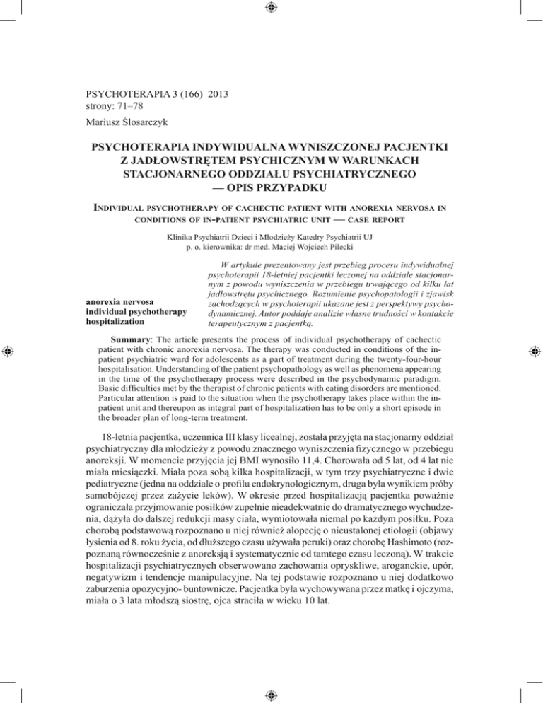 Psychoterapia 3 (166) 2013 strony: 71–78 Mariusz Ślosarczyk Psychoterapia indywidualna wyniszczonej pacjentki z jadłowstrętem psychicznym w warunkach stacjonarnego oddziału psychiatrycznego — opis przypadku Individual psychotherapy of cachectic patient with anorexia nervosa in conditions of in-patient psychiatric unit — case report Klinika Psychiatrii Dzieci i Młodzieży Katedry Psychiatrii UJ p. o. kierownika: dr med. Maciej Wojciech Pilecki anorexia nervosa individual psychotherapy hospitalization W artykule prezentowany jest przebieg procesu indywidualnej psychoterapii 18-letniej pacjentki leczonej na oddziale stacjonarnym z powodu wyniszczenia w przebiegu trwającego od kilku lat jadłowstrętu psychicznego. Rozumienie psychopatologii i zjawisk zachodzących w psychoterapii ukazane jest z perspektywy psychodynamicznej. Autor poddaje analizie własne trudności w kontakcie terapeutycznym z pacjentką. Summary: The article presents the process of individual psychotherapy of cachectic patient with chronic anorexia nervosa. The therapy was conducted in conditions of the inpatient psychiatric ward for adolescents as a part of treatment during the twenty-four-hour hospitalisation. Understanding of the patient psychopathology as well as phenomena appearing in the time of the psychotherapy process were described in the psychodynamic paradigm. Basic difficulties met by the therapist of chronic patients with eating disorders are mentioned. Particular attention is paid to the situation when the psychotherapy takes place within the inpatient unit and thereupon as integral part of hospitalization has to be only a short episode in the broader plan of long-term treatment. 18-letnia pacjentka, uczennica III klasy licealnej, została przyjęta na stacjonarny oddział psychiatryczny dla młodzieży z powodu znacznego wyniszczenia fizycznego w przebiegu anoreksji. W momencie przyjęcia jej BMI wynosiło 11,4. Chorowała od 5 lat, od 4 lat nie miała miesiączki. Miała poza sobą kilka hospitalizacji, w tym trzy psychiatryczne i dwie pediatryczne (jedna na oddziale o profilu endokrynologicznym, druga była wynikiem próby samobójczej przez zażycie leków). W okresie przed hospitalizacją pacjentka poważnie ograniczała przyjmowanie posiłków zupełnie nieadekwatnie do dramatycznego wychudzenia, dążyła do dalszej redukcji masy ciała, wymiotowała niemal po każdym posiłku. Poza chorobą podstawową rozpoznano u niej również alopecję o nieustalonej etiologii (objawy łysienia od 8. roku życia, od dłuższego czasu używała peruki) oraz chorobę Hashimoto (rozpoznaną równocześnie z anoreksją i systematycznie od tamtego czasu leczoną). W trakcie hospitalizacji psychiatrycznych obserwowano zachowania opryskliwe, aroganckie, upór, negatywizm i tendencje manipulacyjne. Na tej podstawie rozpoznano u niej dodatkowo zaburzenia opozycyjno- buntownicze. Pacjentka była wychowywana przez matkę i ojczyma, miała o 3 lata młodszą siostrę, ojca straciła w wieku 10 lat. 72 Mariusz Ślosarczyk Na początku hospitalizacji uwaga personelu skupiona była na stanie somatycznym pacjentki. Niedługo po przyjęciu została ona przekazana na Oddział Intensywnej Opieki Kardiologicznej (OIOK) z powodu hipotonii, bradykardii (częstość akcji serca momentami poniżej 40/min) oraz hipokaliemii (poziom potasu nawet 2,8) i leukopenii (niewiele ponad 2 tysiące/µl), gdzie przebywała kilka dni. Bardzo trudno było ustalić z nią zasady spożywania posiłków oraz przybierania na wadze (składające się na tzw. kontrakt dietetyczny), gdyż odrzucała propozycje personelu: odmawiała spożywania porcji w całości, kwestionowała odpowiedniość diety, negowała potrzebę nadzoru pielęgniarskiego oraz spoczynkowego trybu życia na tym etapie leczenia. Koncentracja zespołu na tych zagadnieniach sprawiła, że indywidualny kontakt psychoterapeutyczny z pacjentką rozpoczął się z pewnym opóźnieniem. Należy zaznaczyć, że leczenie odbywało się na oddziale ogólnopsychiatrycznym, gdzie grupa osób z zaburzeniami jedzenia stanowiła jedynie fragment całej populacji pacjentów. Dodatkowo oddział pełni dyżur dla młodzieży z regionu województwa małopolskiego, co przekłada się na istotny odsetek przyjęć nagłych, często powiązanych z ostrym obrazem klinicznym. Utrudnia to niejednokrotnie uporządkowanie procesu diagnostyczno-terapeutycznego i zmniejsza kontrolę nad nim. Psychoterapia indywidualna, kontrakt dietetyczny oraz leczenie powikłań somatycznych jadłowstrętu nie wyczerpują oczywiście listy metod oddziaływania stosowanych na oddziale wobec osób z anoreksją, w tym również wobec opisywanej pacjentki. Stosowano również farmakoterapię (z olanzapiną jako głównym lekiem psychotropowym) i psychoterapię grupową. Pacjentka uczestniczyła w zebraniach społeczności terapeutycznej, spotkaniach z rodziną i terapii zajęciowej [1]. Przebieg terapii Terapia indywidualna rozpoczęła się mniej więcej po dwóch tygodniach pobytu na oddziale, licząc od powrotu pacjentki z OIOK. Była prowadzona w nurcie psychodynamicznym. Trwała aż do wypisania pacjentki na żądanie, czyli 8 tygodni, z częstością dwóch sesji tygodniowo, po 45 min każda. W sumie odbyło się 15 sesji; jedną sesję pacjentka opuściła. Udało się zachować stałość dni spotkań. Godziny rozpoczęcia podlegały modyfikacjom dyktowanym innymi bieżącymi obowiązkami terapeuty — o tych zmianach pacjentka była uprzedzana rano w dniu sesji. Przed podjęciem leczenia terapeuta miał świadomość rozpoczynania pracy z osobą poważnie wyniszczoną fizycznie, przewlekle chorą i przez to wtórnie zaadaptowaną do choroby. Towarzyszyły mu uczucia pewnego pesymizmu, ale równocześnie ochota dokonania w tej terapii czegoś niezwykłego, metaforycznie ujmując „cudownego uzdrowienia”, tak jakby częściowo zaktywowała się w nim postawa dziecięcej omnipotencji. Odbiciem tych uczuć i cał