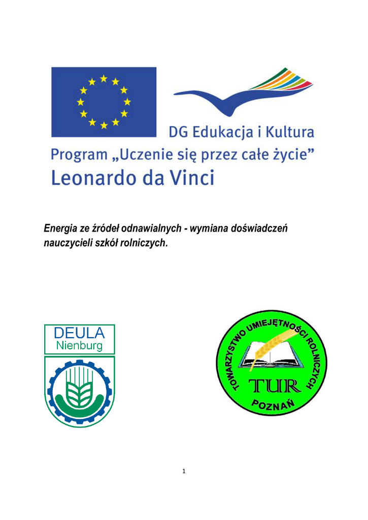 Energia ze źródeł odnawialnych - wymiana doświadczeń nauczycieli szkół rolniczych. 1 SPIS TREŚCI Wstęp 3 I. Wprowadzenie 5 II. Działalność organizacji przyjmującej - Deula w Nienburgu - ze szczególnym uwzględnieniem tematyki bioenergii. 10 III. Problematyka bioenergii i jej rozwój w Polsce i Niemczech. 12 1. Energia odnawialna i perspektywy jej rozwoju w Polsce. 2. Energia odnawialna i perspektywy jej rozwoju w Niemczech. IV. Odnawialne źródła energii, a kształcenie ustawiczne. 18 V. Budowa i działanie nowoczesnej wytwórni biogazu. 20 1. Czym jest biogaz? 2. Jak zbudowana jest biogazownia rolnicza? 3. W jakich warunkach powstaje biogaz? 4. Co przemawia za wytwarzaniem energii odnawialnej w biogazowni rolniczej? VI. Produkcja biogazu z różnych substratów. 1. 23 Produkcja biogazu z kiszonki kukurydzy 2. Produkcja biogazu z odpadów 3. Wiatrowa wytwórnia energii elektrycznej. 4. Słoneczna wytwórnia energii elektrycznej. VII. Alternatywne systemamy ogrzewania. 30 1. Ogrzewanie geotermalne 2. Kotłownia opalana zrębkami drewna oraz prasowanymi trocinami 3.Kotłownie opalane słomą. 4.Kotłownie opalane drewnem. VIII. Produkcja biopaliw na bazie oleju rzepakowego i alkoholu. 2 37 WSTĘP Towarzystwo Umiejętności Rolniczych w Poznaniu oraz Niemiecki Ośrodek Szkoleniowy dla Techniki Rolniczej DEULA w Nienburgu przygotowały i zrealizowały program wymiany doświadczeń pod nazwą „Energia ze źródeł odnawialnych - wymiana doświadczeń nauczycieli szkół rolniczych”. Został on sfinansowany w ramach Programu Leonardo da Vinci ze środków Unii Europejskiej – projekt nr 2010-1PL1-LEO03-10687. Realizacja projektu miała miejsce w okresie od dnia 17 – 29 października 2011 roku. Wyjazd grupy uczestników nastąpił dnia 16 października 2011 roku, a powrót w dniu 30 października 2011 roku. W projekcie wymiany doświadczeń ze strony polskiej uczestniczyła grupa 30-tu nauczycieli szkół rolniczych z kilku województw: wielkopolskiego, lubuskiego, kujawsko-pomorskiego, podlaskiego, lubelskiego, mazowieckiego, warmińsko-mazurskiego, pomorskiego. Są to osoby z wyższym wykształceniem rolniczym lub pedagogicznym, które w swej pracy zawodowej zajmują się problematyką energii ze źródeł odnawialnych oraz problematyka ochrony środowiska. Natomiast ze strony niemieckiej byli to pracownicy Niemieckiego Ośrodka Szkoleniowego dla Techniki Rolniczej DEULA w Nienburgu oraz właściciele i pracownicy różnych wytwórni energii ze źródeł odnawialnych. Podczas udziału w projekcie uczestnicy: - zapoznali się ze strukturą, zasadami działania oraz obiektami szkoleniowymi organizacji przyjmującej - Szkoły Deula w Nienburgu; - zwiedzili Centrum Kompetencyjne dla odnawialnych źródeł energii znajdujące się wśród obiektów organizacji przyjmującej; - zapoznali się i różnymi technologiami pozyskiwania energii cieplnej dla celów grzewczych (zrębki drewna, słoma, energia geotermalna i pompy ciepła, energia cieplna wytwarzana w trakcie produkcji energii elektrycznej); - zwiedzili obiekt i poznali zasady działania wiatrowej wytwórni energii elektrycznej; - zwiedzili wytwórnię oleju rzepakowego dla produkcji biopaliw i poznali zasady jej funkcjonowania;. - odbyli całodzienny wyjazd do wsi z bioenergią w Jühnde. Miejscowość, która wytwarza sama energię, korzysta z niej na własny użytek i jest niezależna pod tym względem. - zwiedzili wytwórnię biogazu działającą na bazie odpadów; 3 - zwiedzili wytwórnię biogazu działającą na bazie kiszonki z kukurydzy; - zwiedzili wytwórnię biogazu działającą na bazie suchej fermentacji. Wymiernym rezultatem projektu jest fakt, że: wiedza zdobyta w ramach realizacji projektu zostanie wykorzystana w pracy z młodzieżą szkół rolniczych; uczestnicy poszerzyli swoje wiadomości w zakresie produkcji energii na bazie odnawialnych źródeł; dzięki wyjazdom studyjnym do różnych wytwórni energii (działających na bazie kiszonki z kukurydzy, odpadów czy parku wiatrowego) uczestnicy projektu mieli możliwość bezpośrednio zapoznać się z funkcjonowaniem tych wytwórni; zgromadzone informacje będą stanowić bazę merytoryczną w realizacji unijnych projektów dotyczących tej tematyki; zdobyta wiedza i uzyskane doświadczenia zostaną przekazane innym nauczycielom, zainteresowanym rodzicom i instytucjom; uczestnictwo w projekcie było niezwykle cennym doświadczeniem i zaowocuje propagowaniem korzyści płynących z inwestowania w wytwórnie energii ze źródeł odnawialnych, ekologicznych dla środowiska. Podczas wizyt studyjnych oraz wykładów uczestnicy wymiany mieli możliwość zadawania pytań, a na zakończenie każdego ze spotkań mogli wymienić doświadczenia z pracownikami instytucji, które odwiedzali. Ze strony Towarzystwa Umiejętności Rolniczych projekt przygotowały i prowadziły osoby, które mają duże doświadczenie w tym zakresie, a poza tym od wielu lat zajmują się organizacją staży zawodowych w Niemczech, z których korzystają uczniowie szkół rolniczych. Uczestnicy wymiany doświadczeń postanowili, że wnioski wynikające z programu wymiany doświadczeń przedstawią instytucjom odpowiedzialnym w Polsce za rozwój systemu kształcenia zawodowego i dokształcania w zakresie odnawialnych źródeł energii. Dotyczy to szczególnie samorządów powiatowych odpowiedzialnych za szkoły rolnicze na swoim terenie, dyrekcji szkół rolniczych oraz samorządu rolniczego. 4 I. Wprowadzenie Unia Europejska podejmuje działania mające na celu zapobieganie zmianom klimatu zarówno na arenie międzynarodowej przyjmując zobowiązania prawa międzynarodowego w tym zakresie, jak i poprzez ustanowienie w prawie unijnym przepisów wiążących państwa członkowskie. 1. Międzynarodowe zobowiązania UE dotyczące zmian klimatu 2. Działania Unii Europejskiej na rzecz zapobiegania zmianom klimatu 1. Międzynarodowe zobowiązania UE dotyczące zmian klimatu Ramowa kon