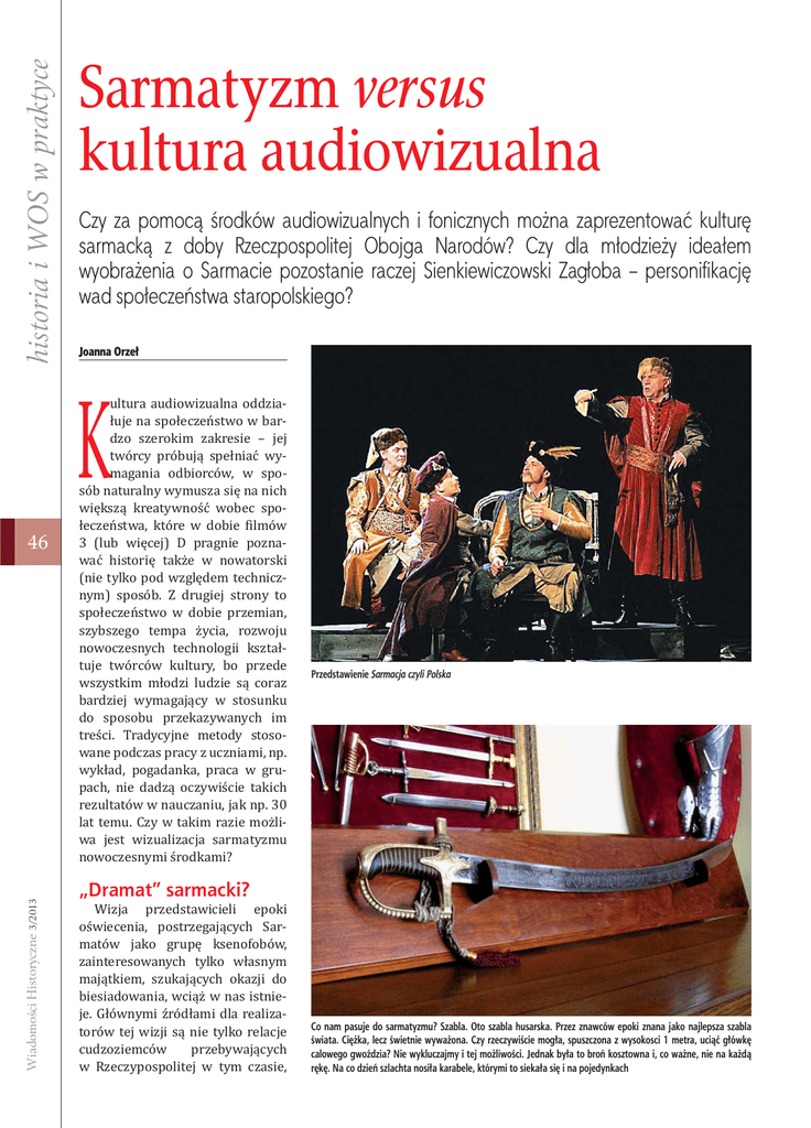 historia i WOS w praktyce Sarmatyzm versus kultura audiowizualna Czy za pomocą środków audiowizualnych i fonicznych można zaprezentować kulturę sarmacką z doby Rzeczpospolitej Obojga Narodów? Czy dla młodzieży ideałem wyobrażenia o Sarmacie pozostanie raczej Sienkiewiczowski Zagłoba – personifikację wad społeczeństwa staropolskiego? Joanna Orzeł ultura audiowizualna oddziałuje na społeczeństwo w bardzo szerokim zakresie – jej twórcy próbują spełniać wymagania odbiorców, w sposób naturalny wymusza się na nich większą kreatywność wobec społeczeństwa, które w dobie filmów 3 (lub więcej) D pragnie poznawać historię także w nowatorski (nie tylko pod względem technicznym) sposób. Z drugiej strony to społeczeństwo w dobie przemian, szybszego tempa życia, rozwoju nowoczesnych technologii kształtuje twórców kultury, bo przede wszystkim młodzi ludzie są coraz bardziej wymagający w stosunku do sposobu przekazywanych im treści. Tradycyjne metody stosowane podczas pracy z uczniami, np. wykład, pogadanka, praca w grupach, nie dadzą oczywiście takich rezultatów w nauczaniu, jak np. 30 lat temu. Czy w takim razie możliwa jest wizualizacja sarmatyzmu nowoczesnymi środkami? K Wiadomości Historyczne 3/2013 46 Przedstawienie Sarmacja czyli Polska „Dramat” sarmacki? Wizja przedstawicieli epoki oświecenia, postrzegających Sarmatów jako grupę ksenofobów, zainteresowanych tylko własnym majątkiem, szukających okazji do biesiadowania, wciąż w nas istnieje. Głównymi źródłami dla realizatorów tej wizji są nie tylko relacje cudzoziemców przebywających w Rzeczypospolitej w tym czasie, Co nam pasuje do sarmatyzmu? Szabla. Oto szabla husarska. Przez znawców epoki znana jako najlepsza szabla świata. Ciężka, lecz świetnie wyważona. Czy rzeczywiście mogła, spuszczona z wysokosci 1 metra, uciąć główkę calowego gwoździa? Nie wykluczajmy i tej możliwości. Jednak była to broń kosztowna i, co ważne, nie na każdą rękę. Na co dzień szlachta nosiła karabele, którymi to siekała się i na pojedynkach za przejaw szlacheckiego nieuctwa i prowincjonalnego warcholstwa, a następnie rozciągnięcie wniosków na całość kultury. A właśnie te cechy wcale nie są najistotniejsze dla odrębności sarmackiego obyczaju, gdyż są wspólne dla szlachty wielu krajów europejskich...4 W drugiej połowie XX wieku próbowano na nowo spojrzeć na sarmatyzm (m.in. praca Tadeusza Mańkowskiego czy eseje Tadeusza Chrzanowskiego). Naukowcy wciąż starają się bronić kultury sarmackiej jako swego rodzaju fenomenu (choć pojawiają się i tezy obalające tę teorię5), powstają prace nie tyle gloryfikujące, co starające się Przedstawienie Opis obyczajów II http://www.teatr-imka.pl/opis_obyczajow_iii,794269.html [dostęp:13.04.2013] http://filmpolski.pl/fp/index.php/52983 [dostęp:13.04.2013] 3 J. Kitowicz, Opis obyczajów za panowania Augusta III, oprac. R. Pollak, Wrocław 1970, s. 3. 4 S. Grzybowski, Sarmatyzm, Warszawa 1996, s. 7. 5 Por. tezy Paula Srodeckiego na temat istnienia mitu przedmurza chrześcijaństwa nie tylko w ówczesnej Rzeczypospolitej, ale także m.in. na Węgrzech. Zob. P. Srodecki, Validissima semper Christianitatis propugnacula. Zur Entstehung der Bollwerksrhetorik in Polen und Ungarn im Spätmittelalter und in der Frühen Neuzeit [w:] Sarmatismus versus Orientalismus in Mitteleuropa. Sarmatyzm versus orientalizm w Europie Środkowej, pod red. M. Długosz, P.O. Scholza we współpracy z M. Faberem, Berlin 2013, s. 131–168. 6 Cytat z filmu Sarmacja, czyli Polska w reżyserii Jacka Knoppa (1996), który szerzej omówiony zostanie w dalszej części artykułu. 7 http://www.tradycja.info.pl/index.php?option=com_content&view=article&id=56:krzysztof-bkaa-dom-sarmaty&catid=7:numer-6&Itemid =16 [dostęp: 13.04.2013] 2 47 Wiadomości Historyczne 3/2013 1 Rezyser Opisu obyczajów – Mikołaj Grabowski wskazać obiektywnie na istotne dla niej zagadnienia. Trafnie określił wyobrażenie współczesnych na temat staropolskiej szlachty Krzysztof Koehler w filmie dydaktycznym Sarmacja, czyli Polska. Sarmata to wiecznie pijany szlachciura z podgolonym łbem, który zrywa sejmiki, wierzy w zabobony i bełkocze coś niejasnego w dziwnym polsko-łacińskim narzeczu6. W podobnym tonie wypowiada się Krzysztof Bąkała: Współcześnie wielu z nas wpada w pułapkę postrzegania naszych przodków z uwspółcześnionej perspektywy autokarowej wycieczki zagranicznych emerytów, którzy – podróżując po Polsce – pokazują swoim wnukom rezerwat nietrzeźwiejących, wygolonych szlachciurów w rozchełstanych kontuszach, którzy w swoich porozbijanych opłotkach wymachują szablami, wiecznie wszczynając burdy. W dodatku są oni katolickimi dewotami, nieukami i ksenofobami. Jak jednak takie społeczeństwo mogło utrzymać swe państwo przez kilka wieków?!7 Do tej kwestii istniejący stereotyp się nie odnosi. historia i WOS w praktyce ale także literatura: tragedia Franciszka Zabłockiego Sarmatyzm, nieukończone dzieła ks. Jędrzeja Kitowicza czy teksty zaczerpnięte z „Monitora”. One to stanowią punkt wyjścia do realizacji kultury masowej. Na podstawie dzieła Kitowicza w 1990 roku został zrealizowany spektakl teatralny Opis obyczajów, czyli jak zwyczajnie wszędzie się miesza złe do dobrego w reżyserii Mikołaja Grabowskiego. Stanowił on także podstawę do stworzenia przedstawienia O północy przybyłem do Widawy, czyli opis obyczajów na bazie tekstów Kitowicza, Henryka Rzewuskiego i cudzoziemców odwiedzających Polskę w czasie panowania ostatniego króla Rzeczypospolitej, także w reżyserii Mikołaja Grabowskiego (przedstawienie wystawiane jest w warszawskim Teatrze IMKA1). Spektakl ten został pozytywnie odebrany przede wszystkim z uwagi na udany przekład, wydawałoby się, tekstu antyscenicznego2. Najważniejsze jednak, że Grabowskiemu udało się stworzyć dzieło ponadczasowe – bo to nie Sarm
