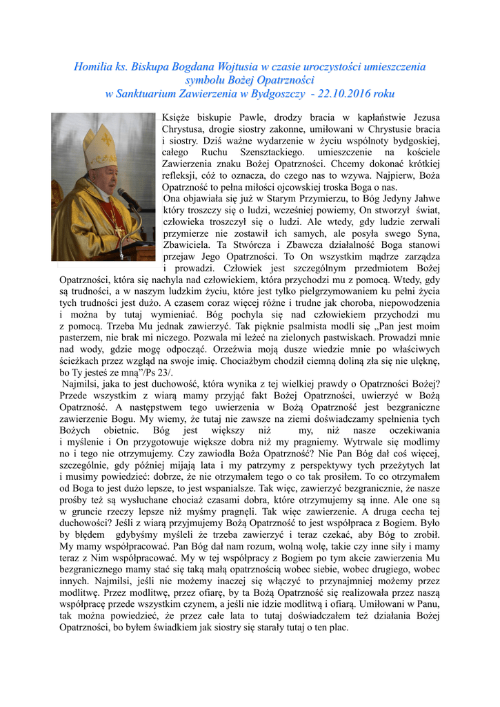 Homilia ks. Biskupa Bogdana Wojtusia w czasie uroczystości umieszczenia symbolu Bożej Opatrzności w Sanktuarium Zawierzenia w Bydgoszczy - 22.10.2016 roku Księże biskupie Pawle, drodzy bracia w kapłaństwie Jezusa Chrystusa, drogie siostry zakonne, umiłowani w Chrystusie bracia i siostry. Dziś ważne wydarzenie w życiu wspólnoty bydgoskiej, całego Ruchu Szensztackiego. umieszczenie na kościele Zawierzenia znaku Bożej Opatrzności. Chcemy dokonać krótkiej refleksji, cóż to oznacza, do czego nas to wzywa. Najpierw, Boża Opatrzność to pełna miłości ojcowskiej troska Boga o nas. Ona objawiała się już w Starym Przymierzu, to Bóg Jedyny Jahwe który troszczy się o ludzi, wcześniej powiemy, On stworzył świat, człowieka troszczył się o ludzi. Ale wtedy, gdy ludzie zerwali przymierze nie zostawił ich samych, ale posyła swego Syna, Zbawiciela. Ta Stwórcza i Zbawcza działalność Boga stanowi przejaw Jego Opatrzności. To On wszystkim mądrze zarządza i prowadzi. Człowiek jest szczególnym przedmiotem Bożej Opatrzności, która się nachyla nad człowiekiem, która przychodzi mu z pomocą. Wtedy, gdy są trudności, a w naszym ludzkim życiu, które jest tylko pielgrzymowaniem ku pełni życia tych trudności jest dużo. A czasem coraz więcej różne i trudne jak choroba, niepowodzenia i można by tutaj wymieniać. Bóg pochyla się nad człowiekiem przychodzi mu z pomocą. Trzeba Mu jednak zawierzyć. Tak pięknie psalmista modli się „Pan jest moim pasterzem, nie brak mi niczego. Pozwala mi leżeć na zielonych pastwiskach. Prowadzi mnie nad wody, gdzie mogę odpocząć. Orzeźwia moją dusze wiedzie mnie po właściwych ścieżkach przez wzgląd na swoje imię. Chociażbym chodził ciemną doliną zła się nie ulęknę, bo Ty jesteś ze mną”/Ps 23/. Najmilsi, jaka to jest duchowość, która wynika z tej wielkiej prawdy o Opatrzności Bożej? Przede wszystkim z wiarą mamy przyjąć fakt Bożej Opatrzności, uwierzyć w Bożą Opatrzność. A następstwem tego uwierzenia w Bożą Opatrzność jest bezgraniczne zawierzenie Bogu. My wiemy, że tutaj nie zawsze na ziemi doświadczamy spełnienia tych Bożych obietnic. Bóg jest większy niż my, niż nasze oczekiwania i myślenie i On przygotowuje większe dobra niż my pragniemy. Wytrwale się modlimy no i tego nie otrzymujemy. Czy zawiodła Boża Opatrzność? Nie Pan Bóg dał coś więcej, szczególnie, gdy później mijają lata i my patrzymy z perspektywy tych przeżytych lat i musimy powiedzieć: dobrze, że nie otrzymałem tego o co tak prosiłem. To co otrzymałem od Boga to jest dużo lepsze, to jest wspanialsze. Tak więc, zawierzyć bezgranicznie, że nasze prośby też są wysłuchane chociaż czasami dobra, które otrzymujemy są inne. Ale one są w gruncie rzeczy lepsze niż myśmy pragnęli. Tak więc zawierzenie. A druga cecha tej duchowości? Jeśli z wiarą przyjmujemy Bożą Opatrzność to jest współpraca z Bogiem. Było by błędem gdybyśmy myśleli że trzeba zawierzyć i teraz czekać, aby Bóg to zrobił. My mamy współpracować. Pan Bóg dał nam rozum, wolną wolę, takie czy inne siły i mamy teraz z Nim współpracować. My w tej współpracy z Bogiem po tym akcie zawierzenia Mu bezgranicznego mamy stać się taką małą opatrznością wobec siebie, wobec drugiego, wobec innych. Najmilsi, jeśli nie możemy inaczej się włączyć to przynajmniej możemy przez modlitwę. Przez modlitwę, przez ofiarę, by ta Bożą Opatrzność się realizowała przez naszą współpracę przede wszystkim czynem, a jeśli nie idzie modlitwą i ofiarą. Umiłowani w Panu, tak można powiedzieć, że przez całe lata to tutaj doświadczałem też działania Bożej Opatrzności, bo byłem świadkiem jak siostry się starały tutaj o ten plac. Po ludzku sądząc to było niemożliwe, to jest teren wyłączony, tu jest takie zabezpieczenie dla ujęć wodnych Bydgoszczy i to, co po ludzku wydawało się niemożliwe przez to zawierzenie Bogu sióstr, przez to włączenie się i współpracę z Bogiem, by ten teren otrzymać pod budowę całego tego ośrodka. To co po ludzku niemożliwe stało się rzeczywistością, bo my tu jesteśmy na tym placu. Dane mi było z Opatrzności Bożej, go święcić. Zawierzyć Bogu i podjąć działania to przynosi owoce. To był pusty plac. Potem nazwijmy dom pielgrzyma z tej blachy fałdowanej i trzeba było tutaj pilnować, bo teren był pusty, w nocy by zabrali. I podziwiałem jak tutaj Wy, najmilsi w Panu, mieliście dyżury w nocy, żeby tego nie rozkradziono i dom stoi. A potem klasztor. To wszystko, to owoc zawierzenia Bogu i tej współpracy z Bogiem, bo Opatrzność właśnie wymaga, by człowiek nie był bierny, ale na miarę swoich sił podejmował wszelkie dzieła. Dziś dziękujemy Panu Bogu, że tutaj możemy się, modlić, że będzie ten znak Bożej Opatrzności umieszczony na Świątyni Zawierzenia. Jest to Świątynia Zawierzenia. A więc ta pierwsza odpowiedź na Bożą Opatrzność. W dziejach świętych zawsze jest także, że oni są poddani wielkiej próbie zawierzenia. Ojciec Kentenich, tyle dobrego działał tworzył i naraz odsunięty i co buntuje się? Jak to nie którzy robią być nie posłusznym decyzji Kościoła? Nie! Zaraz, oto jestem i to zawierzenie przynosi wspaniałe zwycięstwo Stolica Apostolska wszystko mu przywraca. A nasz Ojciec Pio z Pietralciny, też nie rozumiano wszystkich charyzmatów, którymi był obdarzony, też był zawieszony, wyłącza się jak by znika z tego życia i po latach wszystko odwołane. Zawierzyć, bezgraniczne zawierzyć. I wreszcie Sługa Boży Stefan Kardynał Wyszyński tak by się wydawało potrzebny. Tak wspaniale w tych trudnych czasach tak bardzo trudnych prowadził Kościół wsadzony do więzienia. No mógłby się pytać? Gdzie jest Opatrzność Boża? A Ona była. Ale On zawierzył, bez reszty zawierzył. A potem takie wspaniałe zwycięstwo Pana Boga i Matki Bożej. To odnowienie 