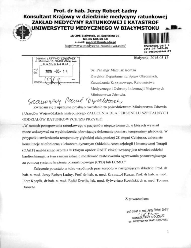Prof, dr hab. Jerzy Robert Ladny Konsultant Krajowy w dziedzinie medycyny ratunkowej ZAKLAD MEDYCYNY RATUNKOWEJ I KATASTROF UNIWERSYTETU MEDYCZNEGO W BIALYMSTOKU HI 15-295 Biatystok, ul. Szpitalna 37, tel. 85 686 50 18 e-mail: [email protected] http://\\AVAv.medvc\na-ratunko\va.com/ RPU/64595/2015 P Data:2015-05-15 10:00890200444122 Biatystok. 2015-05-13 ul Miodpwa 15. 00-952 Wartzawa dn. 2015 -05- 1 5 Sz. Pan mgr Mateusz Komza Dyrektor Departanientu Spraw Obronnych, Podpis..J Zarz^dzania Kryzysowego, Ratownictwa Medycznego i Ochrony Intbrmacji Niejavvnych Ministerstwa Zdrowia. Zwracam si^ z uprzejm^ prosb^ o rozeslanie za posrednictwem Ministerstwa Zdrowia i Urz^dow Wojewodzkich nast^puj^cego Z A L E C E N I A D L A PERSONELU S Z P I T A L N Y C H ODDZIALOW R.4TUNKOWYCH/IZB P R Z Y J ^ C : ,.W ramach post^powania ratunkowego u pacjenlow nieprzytomnych, u ktorych wywiad moze wskazywac na wychlodzenie. obowi^uje dokonanie pomiaru temperalury gt^bokiej. W przypadku stwierdzenia temperatury gl^bokiej ciala ponizej 28 stopni Celsjusza, zaleca si? konsultacj? teiefoniczn^ z lekarzem dyzumym Oddzialu Anestezjologii i Intensywnej Terapii (OAilT) najbiizszego szpitala w ktorym oprocz OAilT zlokalizowany jest rowniez oddzial kardiochirurgii, a tym samym istnieje mozliwosc zastosowania ogrzewania pozaustrqjowego za pomoc^ systemu kr^enia pozaustrojowego (CPS) lub E C M O . " Zalecenie powstato w^ toku wspolnych prac zespolu w nast^puj^cym skladzie: Prof, dr hab. n. med. Jerzy Robert Ladny. Prof, dr hab. n. med. Krzysztof Kusza, Prof, dr hab. n. med. Piotr Knapik, dr hab. n. med. Rafal Drwila, lek. med. Sylweriusz Kosiiiski, dr n. med. Tomasz Darocha Z powazaniem: ds-MEDYCYNY RATUNKOWEJ