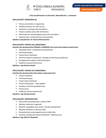 Lista przedmiotów na kierunku: Menedżersko – prawnym SPECJALNOŚĆ: MENEDŻER HR Proces personalny w organizacji Polityka państwa na rynku pracy Podstawy coachingu dla menedżera Prawne aspekty pracy dla menedżera Informatyczne wspomaganie pracy dla menedżera Systemy płac i motywowanie pracowników Opiekun specjalności: dr Joanna Nieżurawska SPECJALNOŚĆ: PRAWO DLA MENEDŻERA (ścieżka dla absolwentów PRAWA w BIZNESIE lub innych kierunków prawniczych Zabezpieczenie i windykacja wierzytelności Ład korporacyjny Prawo karne skarbowe Ochrona danych osobowych i dostęp do informacji publicznej Postępowanie sądowo administracyjne Publiczne prawo konkurencji Opiekun: mgr Renata Kozioł SPECJALNOŚĆ: PRAWO DLA MENEDŻERA (ścieżka dla absolwentów kierunków nieprawniczych Prawo handlowe Ład korporacyjny Prawo karne skarbowe Prawo zobowiązań - część ogólna Umowy w obrocie gospodarczym Prawo pracy Publiczne prawo konkurencji Opiekun: mgr Renata Kozioł SPECJALNOŚĆ: MENEDŻER BHP Ekonomika przedsięwzięć z zakresu BHP Metody zwalczania zagrożeń Badanie wypadków przy pracy i chorób zawodowych Metody szkolenia w obszarze bhp Komputerowe wspomaganie pracy służby bhp Systemy zarządzania bezpieczeństwem i higieną pracy Opiekun: mgr Marcin Wapiński SPECJALNOŚĆ: MENEDŻER BEZPIECZEŃSTWA WEWNĘTRZNEGO Ratownictwo w zarządzaniu kryzysowym Prywatny sektor ochrony w systemie bezpieczeństwa i porządku publicznego Inżynieria zarządzania kryzysowego Strategia bezpieczeństwa narodowego Zarządzanie logistyczne w sytuacjach kryzysowych Regionalizacja i instytucjonalizacja bezpieczeństwa Opiekun specjalności: dr Hubert Stys SPECJALNOŚĆ: MENEDŻER IT Systemy informatyczne zarządzania Zaawansowane narzędzia informatyczne do zarządzania projektami Architektura systemów IT Bezpieczeństwo systemów informatycznych Zarządzanie zasobami informatycznymi Prawne aspekty funkcjonowania działów IT Narzędzia pracy grupowej Opiekun specjalności: dr Jacek Kuras SPECJALNOŚĆ: MENEDŻER SPRZEDAŻY, MARKETINGU I PR Zachowania klienta Organizacja pracy w dziale marketingu, sprzedaży i PR Marketingowe działania organizacji Public relations Strategie komunikacji w procesie sprzedaży Nowoczesne techniki sprzedaży Opiekun specjalności: dr Barbara Bielicka SPECJALNOŚĆ: MENEDŻER TURYSTYKI UZDROWISKOWEJ I SPA Współczesne trendy w turystyce zdrowotnej Filozofia i styl życia - kierunki i trendy Usługi jako podstawa produktu turystyki zdrowotnej Produkty turystyki zdrowotnej Elementy zarządzania przedsiębiorstwem turystyki zdrowotnej Marketing turystyki zdrowotnej Opiekun specjalności: dr Renata Jaroszewska-Brudnicka SPECJALNOŚĆ: MENEDŻER W HOTELARSTWIE I GASTRONOMI Zarządzanie i konkurencyjność w turystyce Nowoczesne trendy w turystyce i hotelarstwie Badanie i analiza rynku turystycznego Kompetencje i role organizacyjne menedżera usług turystycznych i hotelarskich Kreowanie wizerunku hotelu Marketing i zarządzanie sprzedażą w turystyce Opiekun specjalności: dr Renata Jaroszewska-Brudnicka SPECJALNOŚĆ: PSYCHOLOGIA DLA MENEDŻERA Komunikacja społeczna w organizacji Osobowość lidera Psychologia zachowań konsumenckich i reklamy Psychologia motywacji Psychologia stresu i wypalenia zawodowego Psychologia konfliktów interpersonalnych w zespole pracowniczym Patologie w organizacji Opiekun specjalności: mgr Wojciech Ożarowski SPECJALNOŚĆ: MENEDŻER LOGISTYKI Logistyka w przedsiębiorstwie i łańcuchu dostaw Identyfikacja i ocena procesów logistycznych Zarządzanie kosztami logistyki Prawo celne i regulacje obrotu międzynarodowego w logistyce Prawo w procesach transportu i spedycji Systemy informatyczne w logistyce Opiekun specjalności: mgr Iwona Wasielewska-Marszałkowska SPECJALNOŚĆ: MENEDŻER W SŁUŻBIE ZDROWIA Zarządzanie placówkami służby zdrowia Komercyjne i publiczne systemy finansowania świadczeń zdrowotnych Marketing i public relations w służbie zdrowia Turystyka medyczna i unijna koordynacja świadczeń zdrowotnych Kontraktowanie i rozliczanie świadczeń zdrowotnych Zarządzenie jakością w ochronie zdrowia SPECJALNOŚĆ: COACHING I MENTORING W BIZNESIE Metodyka i proces coachingu Narzędzia i trening umiejętności miękkich Inteligencja emocjonalna Coaching i mentoring rozwoju osobistego Coaching i mentoring biznesowy Trening stymulowany (indywidualny i grupowy) SPECJALNOŚĆ: FINANCE AND MANAGEMENT International Managment International Organizations in the global economy Corporate banking Working Capital Management Behavioral Finance