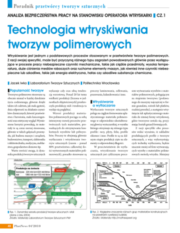 Poradnik przetwórcy tworzyw sztucznych Analiza bezpieczeństwa pracy na stanowisku operatora wtryskarki Cz.1 Technologia wtryskiwania tworzyw polimerowych Wtryskiwanie jest jednym z podstawowych procesów stosowanym w przetwórstwie tworzyw polimerowych. Z racji swojej specyfiki, może być przyczyną różnego typu zagrożeń powodowanych głównie przez występujące w procesie pracy niebezpieczne czynniki mechaniczne, takie jak ciężkie przedmioty, wysoka temperatura, duże ciśnienia mediów roboczych oraz ruchome elementy maszyn, jak również inne czynniki niebezpieczne lub szkodliwe, takie jak energia elektryczna, hałas czy szkodliwe substancje chemiczne. Jacek Iwko Laboratorium Tworzyw Sztucznych Politechnika Wrocławska Popularność tworzyw Tworzywa polimerowe stosowane są obecnie niemal w każdej dziedzinie życia codziennego, głównie dzięki takim ich zaletom, jak mała gęstość, duża odporność na działanie czynników chemicznych, łatwość przetwórstwa i barwienia, mała kancerogenność oraz estetyczny wygląd. Wymienione korzyści powodują, że materiały te są coraz szerzej stosowane, głównie w takich gałęziach przemysłu, jak budowa maszyn i urządzeń, budownictwo, transport, elektronika i elektrotechnika, medycyna, meblarstwo, gospodarstwo domowe itp. Warto zwrócić uwagę, iż dynamika produkcji tworzyw sztucznych wykazuje cały czas silną tendencję wzrostową. Ponad 20 lat temu wielkość produkcji (liczona w jednostkach objętościowych) przekroczyła produkcję stali i tendencja ta wydaje się pogłębiać. Wzrost produkcji materiałów polimerowych pociąga za sobą intensywny rozwój procesów przetwórczych tych materiałów, prowadzących do otrzymywania konkretnych wyrobów lub półwyrobów. Procesy te obejmują głównie wytłaczanie i wtryskiwanie tworzyw sztucznych (razem – ponad 80% przetwórstwa całkowitej ilości wytworzonych materiałów polimerowych), ponadto stosowane są Rys. 1. Dynamika wzrostu produkcji tworzyw sztucznych i stali (dane z roku 2004) Źródło: Materiały Laboratorium Tworzyw Sztucznych PWr 40 PlastNews 04’2010 procesy laminowania, odlewania, prasowania, kalandrowania i inne. Wtryskiwanie a wytłaczanie Wytłaczanie tworzyw sztucznych polega na ciągłym formowaniu uplastycznionego materiału polimerowego w odpowiednio ukształtowanej głowicy wytaczarskiej, w wyniku którego otrzymuje się różnego typu profile: rury, płyty, folie, profile okienne i inne. Profile te są na dalszym etapie produkcji cięte na elementy o odpowiedniej długości. W przeciwieństwie do wytłaczania, wtryskiwanie tworzyw sztucznych jest cyklicznym proce- sem wytwarzania wyrobów z materiałów polimerowych, polegającym na stopieniu tworzywa (podawanego do maszyny najczęściej w formie granulatu, wiórek lub płatków, rzadziej proszku), a następnie wtryśnięciu tak uplastycznionego materiału do zimnej formy wtryskowej, gdzie tworzywo zestala się, przyjmując kształt gniazd formujących. Z racji specyfiki obu procesów widać wyraźnie, iż zakładów produkujących profile z tworzyw sztucznych, a więc wykorzystujących technikę wytłaczania, będzie znacznie mniej od firm wytwarzających wyroby z materiałów polimerowych metodą wtrysku. Mniejszy Rys. 2. Względne znaczenie różnych grup materiałów konstrukcyjnych na przestrzeni cywilizacji ludzkiej Źródło: Materiały http://mathewpeet.org Poradnik przetwórcy tworzyw sztucznych jest bowiem zdecydowanie asortyment profili polimerowych od wyrobów wtryskowych. Wtryskiwanie jest bowiem podstawowym procesem wytwarzania z tworzyw sztucznych gotowych wyrobów o masie od 0,01g do 70 kg. Wykorzystując tą technikę przetwórstwa, wytwarza się tysiące różnego typu wyrobów, począwszy od bardzo małych elementów konstrukcyjnych, niedużych przedmiotów codziennego użytku, opakowań po wielkie, skomplikowane elementy typu części nadwozi samochodowych, skrzynie i inne. To wszystko sprawia, że tylko w Polsce istnieje setki firm przetwórczych zajmujących się produkcją tego typu wyrobów z materiałów polimerowych. Wtryskarki stosowane jako maszyny produkcyjne są urządzeniami niezwykle złożonymi i precyzyjnymi, co jest przyczyną ich wysokich cen. Koszt typowej wtryskarki to ok. 50 000 zł za maszynę używaną, natomiast nowa kosztuje w granicach 200 000 – 1 000 000 zł w zależności od wielkości płyt, siły zamykania, rodzaju napędu itd. Istotny jest również koszt narzędzia – formy wtryskowej montowanej na wtryskarce. Najtańsze formy to wydatek rzędu ok. 20 000 – 30 000 zł, natomiast dla dużych, skomplikowanych wyrobów i niestandardowych technik wtryskowych ich koszt może nawet przekroczyć 300 000 zł. Są również znane formy, których wytworzenie kosztowało ponad 1 000 000 zł, np. forma do wytwarzania jednorazowych maszynek do golenia firmy Gilette (koszt determinowany przede wszystkim przez takie czynniki, jak wtrysk dwukomponentowy, zamocowanie nożyków w formie i inne). Jest sprawą oczywistą, że aby proces produkcyjny był opłacalny, produkcja wyrobów musi być wielkonakładowa w celu szybkiej amortyzacji kosztów narzędzia oraz maszyny. Przedsiębiorstwa, szczególnie mikroprzedsiębiorstwa lub firmy produkujące wyroby wtryskowe w niewielkich ilościach w celu mini- malizacji kosztów wykorzystują niekiedy maszyny własnej produkcji lub kupują maszyny zamortyzowane. Skutkuje to często nie tylko mniejszą funkcjonalnością takiej wtryskarki, ale również mniejszymi kosztami poniesionymi na zapewnienie bezpieczeństwa operatorowi takiej maszyny, co w konsekwencji może prowadzić do różnego typu zdarzeń wypadkowych. Oczywiście zdarzenia wypadkowe występują również w dużych zakładach wytwórczych, wykorzystujących maszyny nowe. Są one wówczas związane przede wszystkim z nieprawidłowym zachowaniem się pracownika, jego nieuwagą, zaniedbaniem lub błędami konstrukcyjnymi maszyny. Technologia wtrysk