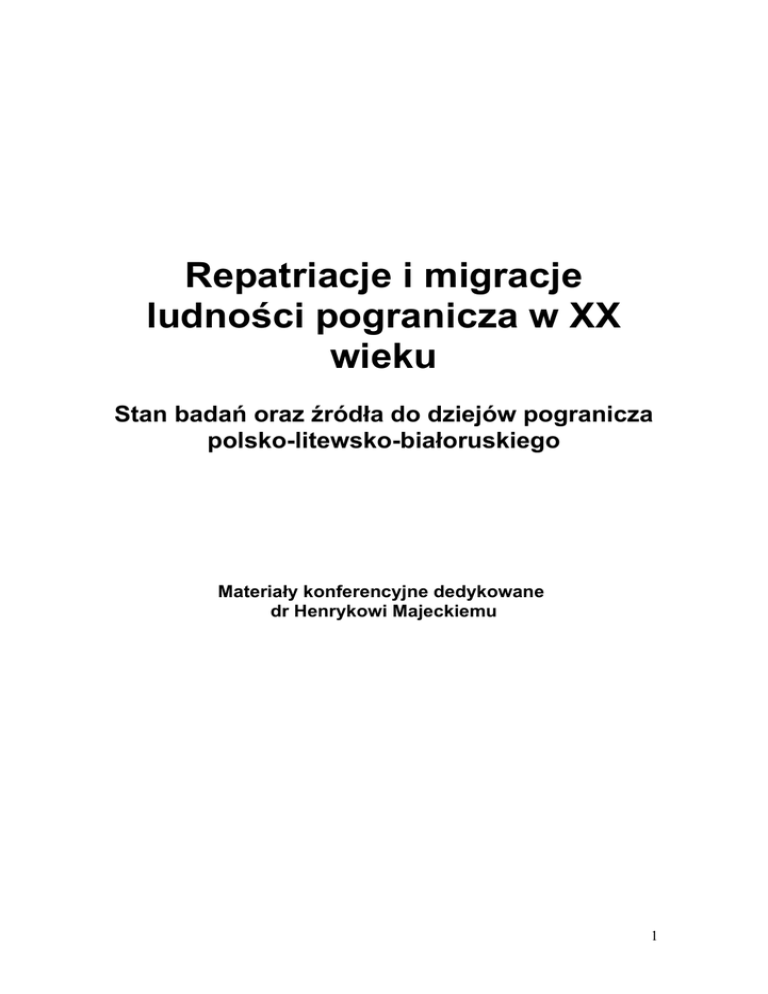 Repatriacje i migracje ludności pogranicza w XX wieku Stan badań oraz źródła do dziejów pogranicza polsko-litewsko-białoruskiego Materiały konferencyjne dedykowane dr Henrykowi Majeckiemu 1 2 Naczelna Dyrekcja Archiwów Państwowych w Warszawie Instytut Historii Uniwersytetu w Białymstoku Katedra Ekonomii i Nauk Społecznych Politechniki Białostockiej Archiwum Państwowe w Białymstoku Archiwum Państwowe w Suwałkach Archiwum Państwowe w Szczecinie Repatriacje i migracje ludności pogranicza w XX wieku Stan badań oraz źródła do dziejów pogranicza polsko-litewsko-białoruskiego Redakcja Marek Kietliński i Wojciech Śleszyński 3 Białystok 2004 4 Seria wydawnicza Wspólne dziedzictwo ziem północno-wschodnich dawnej Rzeczypospolitej Tom III Recenzenci: Prof. dr hab. Adam Dobroński Prof. dr hab. Zofia Tomczonek ISBN 83-920642-0-8 Okładka: Herb Białegostoku z 1919 r. (ze zbiorów Archiwum Państwowego w Białymstoku) Za sprawność językową artykułów odpowiadają Autorzy Skład i druk Wydawnictwo PRYMAT Białystok, ul. Zwycięstwa 26C lok. 7 tel. (85) 869 14 87, 0602 766 304 email: [email protected] 5 6 Spis treści Przedmowa ......................................................................................................................................................................................... 7 Zofia Tomczonek Henryk Majecki - Badacz i popularyzator dziejów najnowszych regionu białostockiego ......................................................................................................................................................................................... 9 Elżbieta Bagińska, Marek Kietliński Wykaz prac Henryka Majeckiego ......................................................................................................................................................................................... 11 Repatriacje i migracje ludności pogranicza w XX wieku Małgorzata Ocytko Białoruska społeczność w Pradze w okresie międzywojennym. Stan badań ......................................................................................................................................................................................... 19 Валентина Швайко Материалы государственного Aрхива брестской области как источник по истории русской эмиграции и русского национального меньшинства в Польше в 20-30-е гг. ......................................................................................................................................................................................... 25 Wojciech Śleszyński Projekty zmian struktury ludnościowej na obszarze województw północno-wschodnich II Rzeczypospolitej w drugiej połowie lat 30 ......................................................................................................................................................................................... 32 Algis Kasperavičius Ucieczka Litwinów i Żydów z kraju kłajpedzkiego w 1939 r. podczas zagarnięcia go przez Trzecią Rzeszę ......................................................................................................................................................................................... 40 Евгений Розенблат Между мифом и реальностью: еврейские беженцы в западной Беларуси. 1939-1941 гг. ......................................................................................................................................................................................... 48 Zoja Jaroszewicz-Pieresławcew, Griogrijus Potašenko Przesiedlenie staroobrzędowców z Suwalszczyzny na Litwę w 1941 r. ......................................................................................................................................................................................... 58 Daniel Boćkowski Źródła do problemu ruchów migracyjnych na ziemiach północno-wschodniej Polski w czasie II wojny światowej ......................................................................................................................................................................................... 69 Witold Mijal Akta osobowe cudzoziemskich robotników przymusowych w zespole Prezydium Policji w Szczecinie (Polizeipräsidium in Stettin) – Białorusini, Estończycy, Litwini, Łotysze, Polacy i Rosjanie na Pomorzu Zachodnim w latach 1939–1945. ......................................................................................................................................................................................... 76 7 Анатоль Вялікі Уплыў кіраўніцтва СССР на працэс перасялення паміж БССР і Польшчай 1944-1946 гг. ......................................................................................................................................................................................... 90 Jolanta Szczygieł-Rogowska Repatriacja ludności polskiej z obwodu pawłodarskiego do Polski w 1946 roku w świetle tzw. księgi pawłodarskiej znajdującej się w zbiorach Muzeum Historycznego w Białymstoku ......................................................................................................................................................................................... 96 Krzysztof Buchowski Uwagi o tak zwanych repatriacjach ludności polskiej z terenów Litwy etnicznej w latach 1945-1947 ......................................................................................................................................................................................... 102 Eugeniusz Mironowicz Przesiedlenia ludności polskiej z Białorusi w latach 1944-1946 ...............