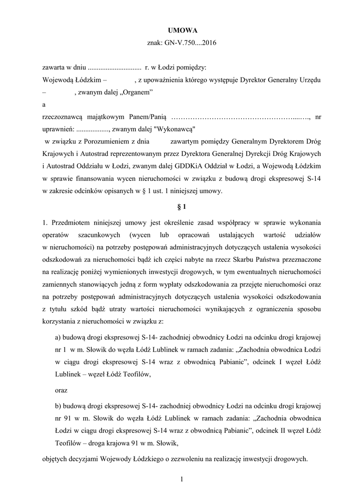 UMOWA znak: GN-V.750....2016 zawarta w dniu .............................. r. w Łodzi pomiędzy: Wojewodą Łódzkim – – , z upoważnienia którego występuje Dyrektor Generalny Urzędu , zwanym dalej „Organem” a rzeczoznawcą majątkowym Panem/Panią ……………………………………………....…., nr uprawnień: .................., zwanym dalej "Wykonawcą" w związku z Porozumieniem z dnia zawartym pomiędzy Generalnym Dyrektorem Dróg Krajowych i Autostrad reprezentowanym przez Dyrektora Generalnej Dyrekcji Dróg Krajowych i Autostrad Oddziału w Łodzi, zwanym dalej GDDKiA Oddział w Łodzi, a Wojewodą Łódzkim w sprawie finansowania wycen nieruchomości w związku z budową drogi ekspresowej S-14 w zakresie odcinków opisanych w § 1 ust. 1 niniejszej umowy. §1 1. Przedmiotem niniejszej umowy jest określenie zasad współpracy w sprawie wykonania operatów szacunkowych (wycen lub opracowań ustalających wartość udziałów w nieruchomości) na potrzeby postępowań administracyjnych dotyczących ustalenia wysokości odszkodowań za nieruchomości bądź ich części nabyte na rzecz Skarbu Państwa przeznaczone na realizację poniżej wymienionych inwestycji drogowych, w tym ewentualnych nieruchomości zamiennych stanowiących jedną z form wypłaty odszkodowania za przejęte nieruchomości oraz na potrzeby postępowań administracyjnych dotyczących ustalenia wysokości odszkodowania z tytułu szkód bądź utraty wartości nieruchomości wynikających z ograniczenia sposobu korzystania z nieruchomości w związku z: a) budową drogi ekspresowej S-14- zachodniej obwodnicy Łodzi na odcinku drogi krajowej nr 1 w m. Słowik do węzła Łódź Lublinek w ramach zadania: „Zachodnia obwodnica Łodzi w ciągu drogi ekspresowej S-14 wraz z obwodnicą Pabianic”, odcinek I węzeł Łódź Lublinek – węzeł Łódź Teofilów, oraz b) budową drogi ekspresowej S-14- zachodniej obwodnicy Łodzi na odcinku drogi krajowej nr 91 w m. Słowik do węzła Łódź Lublinek w ramach zadania: „Zachodnia obwodnica Łodzi w ciągu drogi ekspresowej S-14 wraz z obwodnicą Pabianic”, odcinek II węzeł Łódź Teofilów – droga krajowa 91 w m. Słowik, objętych decyzjami Wojewody Łódzkiego o zezwoleniu na realizację inwestycji drogowych. 1 2. Wykonanie operatów szacunkowych zlecane będzie sukcesywnie, w miarę bieżących potrzeb wynikających z działalności Organu, na podstawie postanowienia o powołaniu rzeczoznawcy majątkowego, jako biegłego w postępowaniu administracyjnym, w którym określony będzie przedmiot wyceny. Realizacja przedmiotu niniejszej umowy nastąpi po uzyskaniu, przez decyzje o zezwoleniu na realizację inwestycji drogowej opisanej wyżej, rygoru natychmiastowej wykonalności lub waloru ostateczności. 3. Wszystkie czynności podjęte przez Wykonawcę w celu wykonania zlecenia, dokonane po wydaniu postanowienia, o którym mowa w ust.2, są czynnościami biegłego w rozumieniu Kodeksu postępowania administracyjnego i podlegają przepisom tej ustawy. 4. Objęte zleceniami nieruchomości położone są na terenie województwa łódzkiego. 5. Organ zastrzega sobie prawo uzupełnienia wykonanego zlecenia o wycenę działek, które wchodzą w skład nieruchomości objętej wykonanym zleceniem w ramach otrzymanego wynagrodzenia. Prawo to przysługuje do dnia obowiązywania niniejszej umowy. 6. Na Wykonawcy ciąży obowiązek: 1) przeprowadzenia oględzin oraz powiadomienia stron wskazanych w zleceniu o miejscu i terminie przeprowadzenia oględzin. Strona ma prawo brać udział w oględzinach, może zadawać pytania oraz składać wyjaśnienia. Organ nie narzuca formy powiadomienia Stron o wskazaniu miejsca i terminu przeprowadzenia oględzin. 2) Przedstawienia na wezwanie Organu, w terminie 7 dni od dnia wezwania, dowodu wykonania obowiązku wynikającego z §1 ust. 8. 7. Protokół z oględzin sporządza Wykonawca w trzech jednobrzmiących egzemplarzach. Dwa egzemplarze będą stanowiły załączniki do Operatów. 8. Wykonawca w terminie 10 dni od daty otrzymania postanowienia, o którym mowa w ust. 2, poda w formie pisemnej Organowi ostateczny koszt wykonania Zlecenia przyjmując za podstawę ceny określone w § 3 oraz przedłoży jeden egzemplarz protokołu z oględzin. Organowi służy prawo wstrzymania wykonania Zlecenia w terminie 5 dni od daty otrzymania ostatecznych kosztów wykonania Zlecenia. 9. Sporządzenie wyceny nieruchomości zabudowanej wymagającej znacznego nakładu pracy w procesie wyceny – stawka roboczogodziny, pozycja 6 Cennika, jest możliwe po złożeniu przez Wykonawcę uzasadnionego wniosku z załączoną kalkulacją kosztów w terminie wskazanym w pkt. 8 oraz po wyrażeniu zgody na powyższy sposób kalkulacji wynagrodzenia zarówno przez Organ jak i przez GDDKiA Oddział w Łodzi. 10. Wykonawca zobowiązany jest do złożenia wykonanych Operatów w Sekretariacie Wydziału Gospodarki Nieruchomościami Łódzkiego Urzędu Wojewódzkiego w Łodzi, ul. Tuwima 28. 2 11. Wykonawca zobowiązuje się do wykonania każdego operatu w formie papierowej. 12. Wykonawca zobowiązany jest dołączyć do każdego operatu: 1) zestawienie transakcji nieruchomości podobnych stanowiących podstawę wyceny, z podaniem nazwy ulicy, powierzchni, obrębu, daty transakcji (w formacie: dd/mm/rrrr); na żądanie Organu wynikające z potrzeby oceny dowodu w postępowaniu administracyjnym, do którego sporządzony został operat szacunkowy, Wykonawca przekaże dodatkowe informacje, w pełni identyfikujące transakcje i nieruchomości porównawcze, w szczególności nr aktu notarialnego oraz nr ewidencyjny działki; 2) dokumentację fotograficzną nieruchomości. Jeśli nieruchomość składa się z więcej niż jednej działki wykonawca zobowiązany jest dołączyć do każdego operatu dokumentację fotograficzną każdej z nich. W przypadku, gdy operat dotyczy nieruchomości zabudowanej, dokumentacja fotograficzna powinna obejmować ka