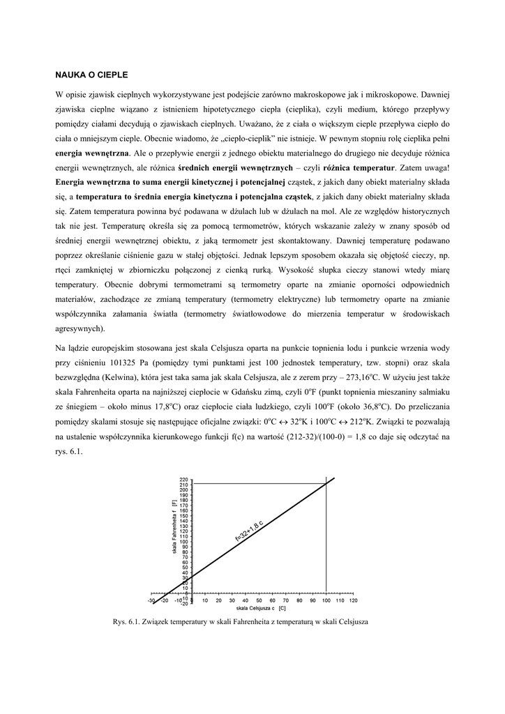 NAUKA O CIEPLE W opisie zjawisk cieplnych wykorzystywane jest podejście zarówno makroskopowe jak i mikroskopowe. Dawniej zjawiska cieplne wiązano z istnieniem hipotetycznego ciepła (cieplika), czyli medium, którego przepływy pomiędzy ciałami decydują o zjawiskach cieplnych. Uważano, że z ciała o większym cieple przepływa ciepło do ciała o mniejszym cieple. Obecnie wiadomo, że „ciepło-cieplik” nie istnieje. W pewnym stopniu rolę cieplika pełni energia wewnętrzna. Ale o przepływie energii z jednego obiektu materialnego do drugiego nie decyduje różnica energii wewnętrznych, ale różnica średnich energii wewnętrznych – czyli różnica temperatur. Zatem uwaga! Energia wewnętrzna to suma energii kinetycznej i potencjalnej cząstek, z jakich dany obiekt materialny składa się, a temperatura to średnia energia kinetyczna i potencjalna cząstek, z jakich dany obiekt materialny składa się. Zatem temperatura powinna być podawana w dżulach lub w dżulach na mol. Ale ze względów historycznych tak nie jest. Temperaturę określa się za pomocą termometrów, których wskazanie zależy w znany sposób od średniej energii wewnętrznej obiektu, z jaką termometr jest skontaktowany. Dawniej temperaturę podawano poprzez określanie ciśnienie gazu w stałej objętości. Jednak lepszym sposobem okazała się objętość cieczy, np. rtęci zamkniętej w zbiorniczku połączonej z cienką rurką. Wysokość słupka cieczy stanowi wtedy miarę temperatury. Obecnie dobrymi termometrami są termometry oparte na zmianie oporności odpowiednich materiałów, zachodzące ze zmianą temperatury (termometry elektryczne) lub termometry oparte na zmianie współczynnika załamania światła (termometry światłowodowe do mierzenia temperatur w środowiskach agresywnych). Na lądzie europejskim stosowana jest skala Celsjusza oparta na punkcie topnienia lodu i punkcie wrzenia wody przy ciśnieniu 101325 Pa (pomiędzy tymi punktami jest 100 jednostek temperatury, tzw. stopni) oraz skala bezwzględna (Kelwina), która jest taka sama jak skala Celsjusza, ale z zerem przy – 273,16oC. W użyciu jest także skala Fahrenheita oparta na najniższej ciepłocie w Gdańsku zimą, czyli 0oF (punkt topnienia mieszaniny salmiaku ze śniegiem – około minus 17,8oC) oraz ciepłocie ciała ludzkiego, czyli 100oF (około 36,8oC). Do przeliczania pomiędzy skalami stosuje się następujące oficjalne związki: 0oC ↔ 32oK i 100oC ↔ 212oK. Związki te pozwalają na ustalenie współczynnika kierunkowego funkcji f(c) na wartość (212-32)/(100-0) = 1,8 co daje się odczytać na rys. 6.1. Rys. 6.1. Związek temperatury w skali Fahrenheita z temperaturą w skali Celsjusza Formuły przeliczania temperatury w skali Celsjusza na temperaturę w skali Fahrenheita są do pobrania w formacie Excell (rys. 6.2) na stronie www: kepler.am.gdynia.pl/CelsFahr.xls. Rys. 6.2. Przeliczanie pomiędzy temperaturą w skali Fahrenheita a temperaturą w skali Celsjusza (www: kepler.am.gdynia.pl/CelsFahr.xls) 6.1. Równanie stanu gazu Jeżeli gaz znajduje się pod niezbyt wysokim ciśnieniem (porównywalnym do ciśnienia atmosferycznego), to pomiędzy jego ciśnieniem p (wyrażonym w paskalach [Pa]), objętością V (w metrach sześciennych [m3]), temperaturą T (w kelwinach [K]) i jego ilością n (w molach [mol]) istnieje relacja algebraiczna, czyli tzw. równanie Clapeyrona 6.1. p V =nR T gdzie: p V n R T (6.1) - ciśnienie gazu - objętość gazu - ilość gazu (w molach)1 - stała gazowa - temperatura gazu (w skali bezwzględnej) Jeżeli założymy, że ilość gazu jest stała (ze zbiornika nic się nie ulatnia, ani nic nie jest dopompowywane), to z równania Clapeyrona otrzymuje się funkcje opisujące proste przemiany gazowe. Są nimi: - przemiana izobaryczna - przemiana izochoryczna - przemiana izotermiczna 1 Jeden mol to ilość czegokolwiek w sytuacji, gdy tego „czegokolwiek” w sztukach jest tyle, ile wynosi stała Avogadra. Także pierwiastki i związki chemiczne ilościowo mierzy się w molach. Jeden mol substancji posiada masę wyrażona w gramach taką, ile wynosi liczba masowa pierwiastka lub związku chemicznego, z jakiego ta substancja się składa. Na świecie znajduje się około 8,3⋅10-15 moli ludzi. Gdyby ilość ludzi wynosiła 1 mol, wtedy na każdy metr kwadratowy suchego lądu przypadałoby 3 mld ludzi. Rys. 6.3. Proste przemiany gazowe – izobaryczna, izotermiczna i izochoryczna 6.2. Pierwsza zasada termodynamiki Pierwsza zasada termodynamiki to ogólne zbilansowanie transformacji energii w przemianach gazu. W bilansie tym uwzględnia się zmianę energii wewnętrznej, transport energii na sposób cieplny i wykonaną przez gaz pracę. Transport energii odbywa się poprzez bezpośredni kontakt (cząsteczki jednego gazu przekazują poprzez zderzenia energię kinetyczną cząsteczkom drugiego gazu) lub promieniście (cząsteczki jednego gazu, jako mikrooscylatory-drgające dipole elektryczne, emitują fale elektromagnetyczne, a cząsteczki drugiego gazu, jako mikrooscylatory-anteny odbiorcze, wychwytują te fale). Pierwszą zasadę termodynamiki wyraża się następująco: ∆Q = ∆U + W (6.2) gdzie: ∆Q - energia przechodząca do gazu ∆U - przyrost energii wewnętrznej gazu W - praca wykonana przez gaz Jeżeli energia przechodzi do gazu, wtedy ∆Q jest dodatnie, jeśli gaz oddaje energię, wtedy ∆Q jest ujemne. Jeżeli gaz wykonuje pracę (na przykład przesuwa tłok), wtedy praca jest dodatnia. Jeżeli praca jest wykonywana nad gazem (na przykład gaz jest sprężany), wtedy praca jest ujemna. W przemianie izotermicznej (temperatura nie zmienia się – średnia energia wewnętrzna nie zmienia się - energia wewnętrzna nie zmienia się) zasada termodynamiki przyjmuje następującą postać: -W = -∆Q (6.3) Równanie 6.3 odczytujemy następująco: „praca wykonana nad gazem jest równa energii oddanej do otoczenia”. Dawniej, ze względu na przekonanie że istnieje medium