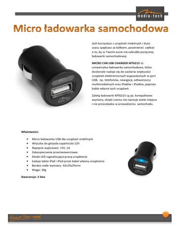 Jeśli korzystasz z urządzeń mobilnych i dużo czasu spędzasz za kółkiem, powinieneś zadbać o to, by w Twoim aucie nie zabrakło poręcznej ładowarki samochodowej. MICRO CAR USB CHARGER MT6215 to uniwersalna ładowarka samochodowa, która doskonale nadaje się do zasilania większości urządzeń elektronicznych wyposażonych w port USB, np. telefonów, nawigacji, odtwarzaczy multimedialnych oraz iPadów i iPodów, poprzez kable własne tych urządzeń. Zaletą ładowarki MT6215 są jej kompaktowe wymiary, dzięki czemu nie zajmuje wiele miejsca i nie przeszkadza w prowadzeniu samochodu. Właściwości: • • • • • • • • Micro ładowarka USB dla urządzeń mobilnych Wtyczka do gniazda zapalniczki 12V Napięcie wyjściowe: +5V, 1A Zabezpieczenie przeciwzwarciowe Dioda LED sygnalizująca pracę urządzenia Ładuje także iPad i iPod przez kabel własny urządzenia Bardzo małe wymiary: 32x25x25mm Waga: 10g Gwarancja: 2 lata