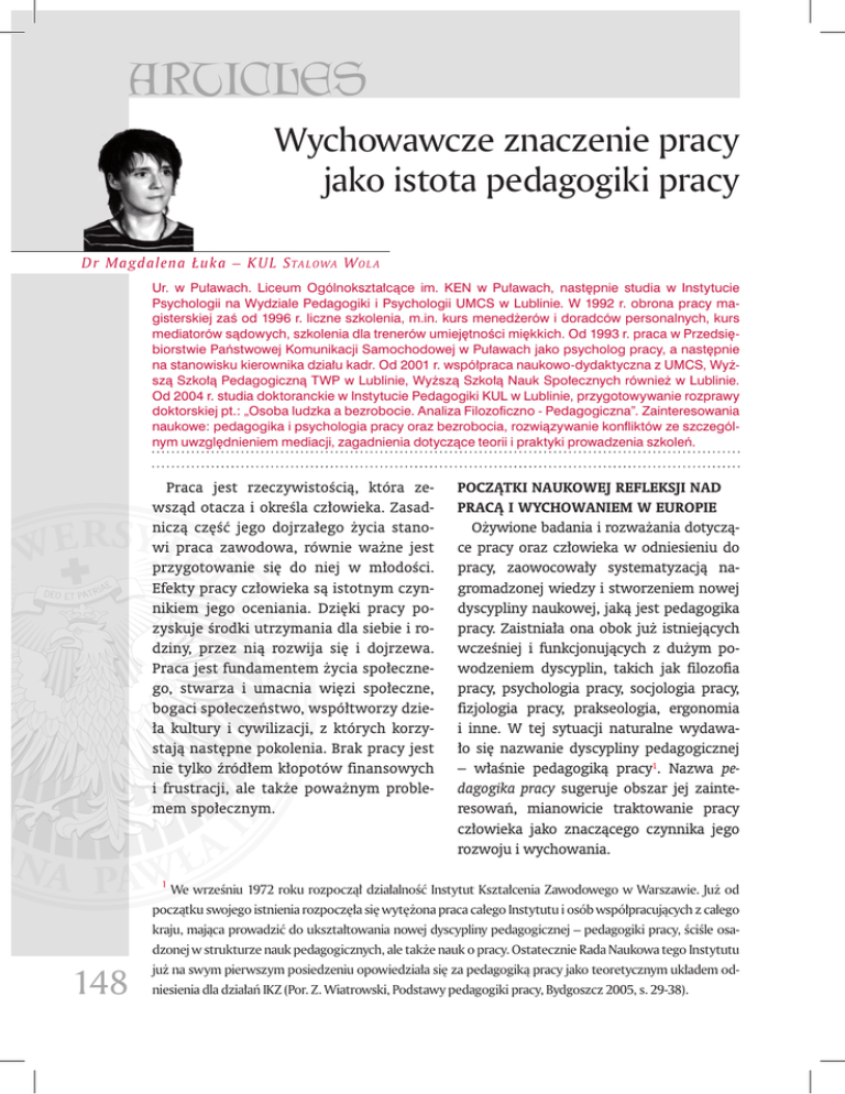 ARTICLES Wychowawcze znaczenie pracy jako istota pedagogiki pracy Dr Magdalena Ł uka – K UL S t a l o wa W o l a Ur. w Puławach. Liceum Ogólnokształcące im. KEN w Puławach, następnie studia w Instytucie Psychologii na Wydziale Pedagogiki i Psychologii UMCS w Lublinie. W 1992 r. obrona pracy magisterskiej zaś od 1996 r. liczne szkolenia, m.in. kurs menedżerów i doradców personalnych, kurs mediatorów sądowych, szkolenia dla trenerów umiejętności miękkich. Od 1993 r. praca w Przedsiębiorstwie Państwowej Komunikacji Samochodowej w Puławach jako psycholog pracy, a następnie na stanowisku kierownika działu kadr. Od 2001 r. współpraca naukowo-dydaktyczna z UMCS, Wyższą Szkołą Pedagogiczną TWP w Lublinie, Wyższą Szkołą Nauk Społecznych również w Lublinie. Od 2004 r. studia doktoranckie w Instytucie Pedagogiki KUL w Lublinie, przygotowywanie rozprawy doktorskiej pt.: „Osoba ludzka a bezrobocie. Analiza Filozoficzno - Pedagogiczna”. Zainteresowania naukowe: pedagogika i psychologia pracy oraz bezrobocia, rozwiązywanie konfliktów ze szczególnym uwzględnieniem mediacji, zagadnienia dotyczące teorii i praktyki prowadzenia szkoleń. Praca jest rzeczywistością, która zewsząd otacza i określa człowieka. Zasadniczą część jego dojrzałego życia stanowi praca zawodowa, równie ważne jest przygotowanie się do niej w młodości. Efekty pracy człowieka są istotnym czynnikiem jego oceniania. Dzięki pracy pozyskuje środki utrzymania dla siebie i rodziny, przez nią rozwija się i dojrzewa. Praca jest fundamentem życia społecznego, stwarza i umacnia więzi społeczne, bogaci społeczeństwo, współtworzy dzieła kultury i cywilizacji, z których korzystają następne pokolenia. Brak pracy jest nie tylko źródłem kłopotów finansowych i frustracji, ale także poważnym problemem społecznym. 1 Początki naukowej refleksji nad pracą i wychowaniem w Europie Ożywione badania i rozważania dotyczące pracy oraz człowieka w odniesieniu do pracy, zaowocowały systematyzacją nagromadzonej wiedzy i stworzeniem nowej dyscypliny naukowej, jaką jest pedagogika pracy. Zaistniała ona obok już istniejących wcześniej i funkcjonujących z dużym powodzeniem dyscyplin, takich jak filozofia pracy, psychologia pracy, socjologia pracy, fizjologia pracy, prakseologia, ergonomia i inne. W tej sytuacji naturalne wydawało się nazwanie dyscypliny pedagogicznej – właśnie pedagogiką pracy1. Nazwa pedagogika pracy sugeruje obszar jej zainteresowań, mianowicie traktowanie pracy człowieka jako znaczącego czynnika jego rozwoju i wychowania. We wrześniu 1972 roku rozpoczął działalność Instytut Kształcenia Zawodowego w Warszawie. Już od początku swojego istnienia rozpoczęła się wytężona praca całego Instytutu i osób współpracujących z całego kraju, mająca prowadzić do ukształtowania nowej dyscypliny pedagogicznej – pedagogiki pracy, ściśle osadzonej w strukturze nauk pedagogicznych, ale także nauk o pracy. Ostatecznie Rada Naukowa tego Instytutu 148 już na swym pierwszym posiedzeniu opowiedziała się za pedagogiką pracy jako teoretycznym układem odniesienia dla działań IKZ (Por. Z. Wiatrowski, Podstawy pedagogiki pracy, Bydgoszcz 2005, s. 29-38). ARTYKUŁY „Pedagogikę pracy przyjęło się określać jako subdyscyplinę naukową, której przedmiotem badań są pedagogiczne aspekty relacji: człowiek – wychowanie – praca”2. Pedagogika pracy, aczkolwiek wykrystalizowała się jako dyscyplina pedagogiczna dopiero w latach siedemdziesiątych XX wieku, ma jednak długi rodowód. Związana jest nierozłącznie z ruchami społecznymi, szczególnie z zagadnieniem stosunku człowieka do pracy. Do oficjalnego uznania tej nauki droga wiodła przez mniej lub bardziej rozbudowane etapy refleksji nad rolą pracy w życiu człowieka. W analizowaniu tych zagadnień można sięgnąć daleko w głąb historii. Po prostu – człowiek zawsze myślał o tym, jak żyć i co czynić, aby zagwarantować sobie i najbliższym godziwe warunki bycia i egzystencji. Jedną z pierwszych analiz na temat pracy i wychowania do pracy, była wypowiedź Tomasza Morusa (1478-1535). Około 1516 roku w dziele Utopia opisał on życie na wyspie, gdzie panuje szczęście. Przedstawił fikcyjne królestwo, w którym niektórzy współcześni uczeni dopatrują się wyidealizowanego przeciwieństwa Europy z czasów Morusa, podczas gdy inni uznają je za złośliwą satyrę na nią. Ustrojem Utopii była komuna drobnych producentów, rolników i rzemieślników. Rozwój przemysłu uważany było za zło. Określił jednak jasno, że wszyscy muszą pracować sześć godzin dziennie. Sformułował również postulat, aby cała młodzież pracowała w rolnictwie, a potem niektórzy z nich wybrali inne zawody. Pomimo tego, że człowiek cały czas potrzebuje „pogoni” za nierealnym oraz pomimo wszystkich błędów popełnianych przy próbach zmieniania świata na idealny, czego m.in. obrazem jest Utopia Morusa, autora tej koncepcji przyjęło się uważać za twórcę idei wychowania przez pracę3. Od tego czasu zagadnieniem pracy i wychowaniem przez pracę zajmowało się wielu myślicieli. Jednym z nich był Jan Amos Komeński, który żył na przełomie XVI i XVII wieku (15921679). Wychowanie planowe powinno się rozpoczynać, według Komeńskiego, tuż po urodzeniu się dziecka. Pierwszy okres wychowania, do końca szóstego roku życia, określanej mianem „szkoły macierzyńskiej”, ma zapewnić dziecku prawidłowy rozwój fizyczny, wyposażyć je w podstawowe pojęcia moralne oraz doprowadzić do pełnego rozwoju młodocianego intelektu, tak by dziecko po ukończeniu 6 lat mogło rozpocząć naukę w szkole elementarnej. Przede wszystkim w okresie tym należy dbać o to, by dziecko sprawnie posługiwało się językiem ojczystym i przyswoiło podstawy elementarnego wykształcenia. Szkoła powszechna, stanowiąca kolejny szczebel wychowania, miała char