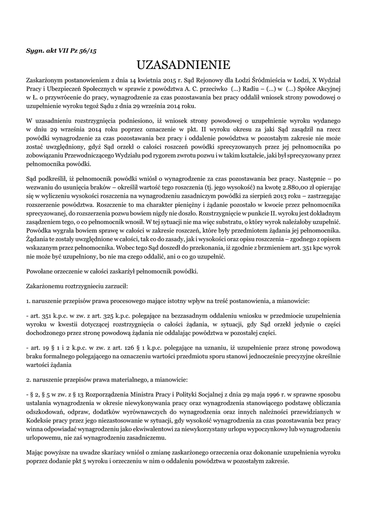 Sygn. akt VII Pz 56/15 UZASADNIENIE Zaskarżonym postanowieniem z dnia 14 kwietnia 2015 r. Sąd Rejonowy dla Łodzi Śródmieścia w Łodzi, X Wydział Pracy i Ubezpieczeń Społecznych w sprawie z powództwa A. C. przeciwko (...) Radiu – (...) w (...) Spółce Akcyjnej w Ł. o przywrócenie do pracy, wynagrodzenie za czas pozostawania bez pracy oddalił wniosek strony powodowej o uzupełnienie wyroku tegoż Sądu z dnia 29 września 2014 roku. W uzasadnieniu rozstrzygnięcia podniesiono, iż wniosek strony powodowej o uzupełnienie wyroku wydanego w dniu 29 września 2014 roku poprzez oznaczenie w pkt. II wyroku okresu za jaki Sąd zasądził na rzecz powódki wynagrodzenie za czas pozostawania bez pracy i oddalenie powództwa w pozostałym zakresie nie może zostać uwzględniony, gdyż Sąd orzekł o całości roszczeń powódki sprecyzowanych przez jej pełnomocnika po zobowiązaniu Przewodniczącego Wydziału pod rygorem zwrotu pozwu i w takim kształcie, jaki był sprecyzowany przez pełnomocnika powódki. Sąd podkreślił, iż pełnomocnik powódki wniósł o wynagrodzenie za czas pozostawania bez pracy. Następnie – po wezwaniu do usunięcia braków – określił wartość tego roszczenia (tj. jego wysokość) na kwotę 2.880,00 zł opierając się w wyliczeniu wysokości roszczenia na wynagrodzeniu zasadniczym powódki za sierpień 2013 roku – zastrzegając rozszerzenie powództwa. Roszczenie to ma charakter pieniężny i żądanie pozostało w kwocie przez pełnomocnika sprecyzowanej, do rozszerzenia pozwu bowiem nigdy nie doszło. Rozstrzygnięcie w punkcie II. wyroku jest dokładnym zasądzeniem tego, o co pełnomocnik wnosił. W tej sytuacji nie ma więc substratu, o który wyrok należałoby uzupełnić. Powódka wygrała bowiem sprawę w całości w zakresie roszczeń, które były przedmiotem żądania jej pełnomocnika. Żądania te zostały uwzględnione w całości, tak co do zasady, jak i wysokości oraz opisu roszczenia – zgodnego z opisem wskazanym przez pełnomocnika. Wobec tego Sąd doszedł do przekonania, iż zgodnie z brzmieniem art. 351 kpc wyrok nie może być uzupełniony, bo nie ma czego oddalić, ani o co go uzupełnić. Powołane orzeczenie w całości zaskarżył pełnomocnik powódki. Zakarżonemu roztrzygnieciu zarzucił: 1. naruszenie przepisów prawa procesowego mające istotny wpływ na treść postanowienia, a mianowicie: - art. 351 k.p.c. w zw. z art. 325 k.p.c. polegające na bezzasadnym oddaleniu wniosku w przedmiocie uzupełnienia wyroku w kwestii dotyczącej rozstrzygnięcia o całości żądania, w sytuacji, gdy Sąd orzekł jedynie o części dochodzonego przez stronę powodową żądania nie oddalając powództwa w pozostałej części. - art. 19 § 1 i 2 k.p.c. w zw. z art. 126 § 1 k.p.c. polegające na uznaniu, iż uzupełnienie przez stronę powodową braku formalnego polegającego na oznaczeniu wartości przedmiotu sporu stanowi jednocześnie precyzyjne określnie wartości żądania 2. naruszenie przepisów prawa materialnego, a mianowicie: - § 2, § 5 w zw. z § 13 Rozporządzenia Ministra Pracy i Polityki Socjalnej z dnia 29 maja 1996 r. w sprawne sposobu ustalania wynagrodzenia w okresie niewykonywania pracy oraz wynagrodzenia stanowiącego podstawę obliczania odszkodowań, odpraw, dodatków wyrównawczych do wynagrodzenia oraz innych należności przewidzianych w Kodeksie pracy przez jego niezastosowanie w sytuacji, gdy wysokość wynagrodzenia za czas pozostawania bez pracy winna odpowiadać wynagrodzeniu jako ekwiwalentowi za niewykorzystany urlopu wypoczynkowy lub wynagrodzeniu urlopowemu, nie zaś wynagrodzeniu zasadniczemu. Mając powyższe na uwadze skarżacy wniósł o zmianę zaskarżonego orzeczenia oraz dokonanie uzupełnienia wyroku poprzez dodanie pkt 5 wyroku i orzeczeniu w nim o oddaleniu powództwa w pozostałym zakresie. W odpowiedzi na powyższe pełnomocnik strony pozwanej wniósł o oddalenie zażalenia w całości i zasadzenie od powódki na rzecz pozwanej kosztów postepowania w tym kosztów zastępstwa procesowego wdług norm przepisanych. Sąd Okręgowy w Łodzi zważył co następuje: Zażalenie nie zasługuje na uwzględnienie. W myśl art. 325 kpc sentencja wyroku powinna zawierać wymienienie sądu, sędziów, protokolanta oraz prokuratora, jeżeli brał udział w sprawie, datę i miejsce rozpoznania sprawy i wydania wyroku, wymienienie stron i oznaczenie przedmiotu sprawy oraz rozstrzygnięcie sądu o żądaniach stron. Zgodnie zaś z art. 351 § 1 kpc strona może w ciągu dwóch tygodni od ogłoszenia wyroku, a gdy doręczenie wyroku następuje z urzędu - od jego doręczenia, zgłosić wniosek o uzupełnienie wyroku, jeżeli sąd nie orzekł o całości żądania, o natychmiastowej wykonalności albo nie zamieścił w wyroku dodatkowego orzeczenia, które według przepisów ustawy powinien był zamieścić z urzędu. Podkreślić należy, iż uzupełnienie wyroku możliwe jest, gdy nie wydano rozstrzygnięcia merytorycznego co do wszystkich roszczeń przedstawionych przez powoda albo nie uwzględniono roszczenia w całości, a jednocześnie nie oddalono powództwa w pozostałej części, nadto, gdy sąd pominął inne wnioski powoda. Ocena, czy sąd orzekł o całości żądania, powinna być dokonywana poprzez porównanie zakresu rozstrzygnięcia zawartego w wyroku z zakresem żądania istniejącego w chwili zamknięcia rozprawy (art. 316 § 1 KPC). Innymi słowy niekompletność wyroku zachodzi wówczas, gdy sąd nie rozstrzygnął o części żądania (uwzględniając powództwo w tym zakresie bądź je oddalając), nie rozstrzygnął o wszystkich skumulowanych żądaniach (art. 191 i 193 KPC), bądź nie rozstrzygnął sprawy wobec wszystkich występujących w sprawie współuczestników (por. F. Rosengarten, Sprostowanie, uzupełnienie i wykładnia orzeczeń w postępowaniu cywilnym, NP 1971, Nr 6, s. 877). Na gruncie przedmiotowej sprawy bezsporne jest, iż w toku postępowania rozp