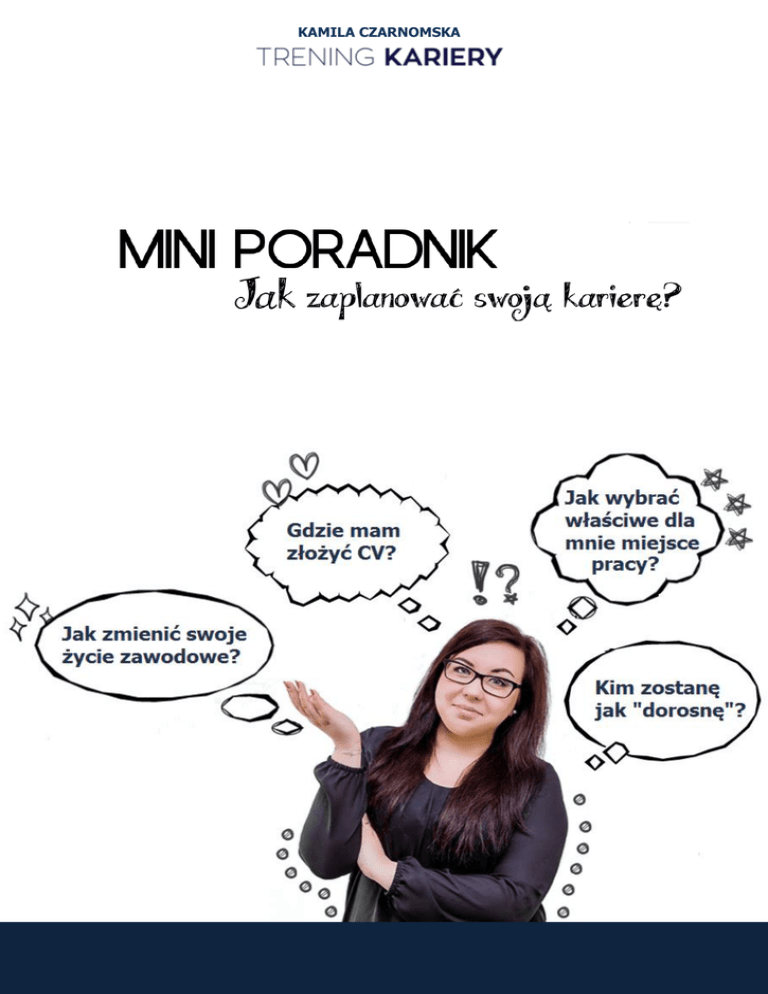 KAMILA CZARNOMSKA Witaj. Mam KAMILA CZARNOMSKA Witaj. Mam na imię Kamila, jestem Doradcą Kariery. Mam szczęście do cudownych klientów, którzy przychodzą do mnie, by zmienić swoje życie zawodowe. Spotykamy się na różnych etapach ich drogi na szczyt. Raz jest to zupełny początek, kiedy każdy krok stawia się niepewnie i z ogromnym lękiem. Bywa, że pomagam podnieść się z długotrwałego bezrobocia lub urlopu macierzyńskiego. Czasem zwalczam wypalenie zawodowe oraz wskazuję inne możliwości rozwoju. Jak widzisz każda historia jest inna i wymaga odmiennej strategii działania. Jest jednak jeden wspólny mianownik - z każdym klientem opracowuję indywidualny plan kariery. Dziś zrobię to również z Tobą. Zapraszam do wspólnej podróży na szczyt! WAŻNE Aby w pełni skorzystać z przygotowanego materiału, musisz przygotować: Przestrzeń, w której nikt nie będzie Ci przeszkadzać Czas i „wolną głowę” Kilka czystych kartek Kolorowe mazaki 5 przyjaciół („pod telefonem”) KROK 1: Postawa Pierwszym i najważniejszym składnikiem sukcesu jest wiara we własne siły. To od niej zależy wiele Twoich decyzji. To ona zmniejsza strach i sprawia, że nawet trudne zadania wydają się łatwe do zrealizowania. Czując w sobie moc sprawczą, możesz zrobić więcej i osiągać zdumiewające efekty, dlatego tak ważne jest, by dbać o poczucie własnej wartości. Co pomaga w tworzeniu silnej koncepcji siebie? Świadomość, że „poruszamy się do przodu”. Możesz stworzyć najlepszą na świecie strategię działania, która będzie całkowicie bezużyteczna, jeśli nie zaczniesz jej realizować. Pewne jest, że napotkasz trudności, dopadnie Cię zmęczenie oraz poczucie beznadziejności, dlatego mam dla Ciebie ćwiczenie, które pomoże przetrwać chwile słabości. ZADANIE: Wypisz 100 swoich sukcesów. Mam nadzieję, że w Twojej głowie pojawiła się myśl „to absolutnie niemożliwe”. Jeśli obleciał Cię strach, to jeszcze lepiej. Dzięki temu wiem, że nie będzie to dla Ciebie łatwe zadanie. I takie właśnie ma być. Dlaczego? Zastanówmy się co Twój mały hejter teraz mówi? - to bez sensu i tak się nie uda tego nie da się zrobić a po co mi to nie będę tego robić i tak nikt tego nie sprawdzi to jest głupie nie chce mi się w sumie to nie muszę tego pisać KAMILA CZARNOMSKA Przypomina Ci to coś? Większość osób, które znam, nie realizują swoich strategii, ponieważ poddali się tym głosom. Uwierzyli w to, co „usłyszeli”. Zastanów się, kiedy najczęściej pojawia się mały hejter? Właśnie wtedy, gdy trzeba podjąć trudną decyzję lub konkretne działanie. Wiesz dlaczego? Bo taki mamy system obronny. Nie lubimy tego, czego nie znamy, a każde ryzyko czy zmianę traktujemy jak potencjalne zagrożenie. Czas jednak z tym skończyć. Usiądź wygodnie, zrób swoją ulubioną kawę lub herbatę. Znajdź dla siebie miejsce i czas, który będzie przeznaczony tylko dla Ciebie. Masz 2 godziny. TAK! Dokładnie 120 minut. Jeśli znowu pojawiły się te same wątpliwości co na początku, zignoruj je. To jest do zrobienia. Sprawdziłam. Po prostu nie analizuj, czy coś „możesz” nazwać sukcesem. Pamiętaj, że tylko Ty o tym decydujesz. Nikt inny nie ma prawa tego ocenić. Cokolwiek się stanie - pisz Cokolwiek usłyszysz w swojej głowie - pisz dalej Cokolwiek będzie chciało Cię zatrzymać - nie przestawaj pisać! Wiem, że Ci się uda Ty też musisz w to uwierzyć! Do dzieła! ………………………………………………………………………………………………………………………………………………… ………………………………………………………………………………………………………………………………………………… ………………………………………………………………………………………………………………………………………………… ………………………………………………………………………………………………………………………………………………… ………………………………………………………………………………………………………………………………………………… ………………………………………………………………………………………………………………………………………………… ………………………………………………………………………………………………………………………………………………… ………………………………………………………………………………………………………………………………………………… ………………………………………………………………………………………………………………………………………………… ………………………………………………………………………………………………………………………………………………… ………………………………………………………………………………………………………………………………………………… ………………………………………………………………………………………………………………………………………………… ………………………………………………………………………………………………………………………………………………… ………………………………………………………………………………………………………………………………………………… ………………………………………………………………………………………………………………………………………………… 