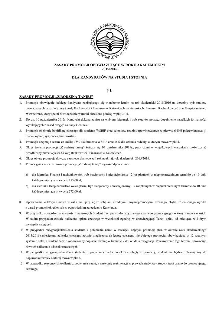 ZASADY PROMOCJI OBOWIĄZUJĄCE W ROKU AKADEMICKIM 2015/2016 DLA KANDYDATÓW NA STUDIA I STOPNIA § 1. ZASADY PROMOCJI „Z RODZINĄ TANIEJ” 1. Promocja obowiązuje każdego kandydata zapisującego się w naborze letnim na rok akademicki 2015/2016 na dowolny tryb studiów prowadzonych przez Wyższą Szkołę Bankowości i Finansów w Katowicach na kierunkach: Finanse i Rachunkowość oraz Bezpieczeństwo Wewnętrzne, który spełni równocześnie warunki określone poniżej w pkt. 3 i 4. 2. Do dn. 10 października 2015r. Kandydat dokona zapisu na wybrany kierunek i tryb studiów poprzez dopełnienie wszelkich formalności wynikających z zasad przyjęć na dany kierunek. 3. Promocja obejmuje bonifikatę czesnego dla studenta WSBiF oraz członków rodziny (powinowactwo w pierwszej linii pokrewieństwa tj. matka, ojciec, syn, córka, brat, siostra). 4. Promocja obejmuje czesne ze zniżką 15% dla Studenta WSBiF oraz 15% dla członka rodziny, o którym mowa w pkt.4. 5. Okres trwania promocji „Z rodziną taniej” kończy się 10 października 2015r., przy czym w wyjątkowych warunkach może zostać przedłużony przez Wyższą Szkołę Bankowości i Finansów w Katowicach. 6. Okres objęty promocją dotyczy czesnego płatnego za I rok nauki, tj. rok akademicki 2015/2016. 7. Promocyjne czesne w ramach promocji „Z rodziną taniej” wynosi odpowiednio: a) dla kierunku Finanse i rachunkowość, tryb stacjonarny i niestacjonarny: 12 rat płatnych w nieprzekraczalnym terminie do 10 dnia każdego miesiąca w kwocie 255,00 zł; b) dla kierunku Bezpieczeństwo wewnętrzne, tryb stacjonarny i niestacjonarny: 12 rat płatnych w nieprzekraczalnym terminie do 10 dnia każdego miesiąca w kwocie 272,00 zł. 8. Uprawnienia, o których mowa w ust.7 nie łączą się ze sobą ani z żadnymi innymi promocjami czesnego, chyba, że co innego wynika z zasad promocji określonych w odpowiednim zarządzeniu Kanclerza. 9. W przypadku stwierdzenia zaległości finansowych Student traci prawo do przyznanego czesnego promocyjnego, o którym mowa w ust.7. W takim przypadku zostaje naliczona opłata czesnego w wysokości zgodnej w obowiązującej Tabeli opłat, od miesiąca, w którym wystąpiła zaległość. 10. W przypadku rezygnacji/skreślenia studenta z pobierania nauki w miesiącu objętym promocją (tzn. w okresie roku akademickiego 2015/2016) miesięczna zaliczka czesnego zostaje przeliczona na kwotę czesnego nie objętego promocją, obowiązującą w 12 ratalnym systemie opłat, a student będzie zobowiązany dopłacić różnicę w terminie 7 dni od dnia rezygnacji. Przekroczenie tego terminu spowoduje również naliczenie odsetek ustawowych. 11. W przypadku rezygnacji/skreślenia studenta z pobierania nauki po okresie objętym promocją, student nie będzie zobowiązany do dopłacania różnicy o której mowa w pkt 7. 12. W przypadku rezygnacji/skreślenia z pobierania nauki, a następnie reaktywacji w prawach studenta – student traci prawo do promocyjnego czesnego. § 2. ZASADY PROMOCJI „STUDENCIE NIE PŁAĆ CZESNEGO” 1. Promocja przeznaczona jest dla Studentów WSBiF, którzy w okresie rekrutacji na rok akademicki 2015/2016 polecą Uczelnię kandydatowi na studia prowadzone w Wyższej Szkole Bankowości i Finansów w Katowicach na kierunkach: Finanse i Rachunkowość oraz Bezpieczeństwo Wewnętrzne. Kandydat przyjmujący się na studia ma obowiązek dostarczyć do Biura Rekrutacji (wraz z dokumentami niezbędnymi przy rekrutacji) oświadczenie zawierające dane studenta WSBiF (imię nazwisko + nr albumu) polecającego Uczelnię. 2. Warunkiem uzyskania promocji przez Studenta WSBiF jest opłacenie przez kandydata pierwszego semestru studiów. W przypadku studentów ostatniego roku studiów, których promocja obejmuje ostatni miesiąc opłat (tj. wrzesień), promocja jest realizowana przez zwrot opłaty za ostatni miesiąc studiów w momencie ukończenia przez polecanego kandydata pierwszego semestru. 3. W przypadku opłat ratalnych promocja udzielana jest w ostatnim miesiącu semestru. 4. Promocja obejmuje anulowanie wpłaty za jeden miesiąc czesnego dla Studenta WSBiF, zgodnie z „Tabelą opłat” odpowiednio dla danego semestru Studiów oraz pkt. 2 i 3. 5. Uprawnienia, o których mowa w ust.4 nie łączą się ze sobą ani z żadnymi innymi promocjami czesnego, chyba, że co innego wynika z zasad promocji określonych w odpowiednim zarządzeniu Kanclerza. 6. W przypadku stwierdzenia zaległości finansowych Student traci prawo do przyznanego czesnego promocyjnego, o którym mowa w ust.4. W takim przypadku zostaje naliczona opłata czesnego w wysokości zgodnej w obowiązującej Tabeli opłat również za miesiąc, w którym miało nastąpić anulowanie opłaty za czesne. 7. Promocja dotyczy jedynie kandydatów, którzy nie rekrutowali się wcześniej na WSBiF np. za pośrednictwem e-rekrutacji. § 3. ZASADY PROMOCJI „KANDYDACIE, NIE PŁAĆ CZESNEGO” 1. Promocja obowiązuje Kandydatów na studia WSBiF, którzy w okresie rekrutacji na rok akademicki 2015/2016 złożyli komplet dokumentów i polecą Uczelnię innemu kandydatowi na studia prowadzone w Wyższej Szkole Bankowości i Finansów w Katowicach na kierunkach: Finanse i Rachunkowość oraz Bezpieczeństwo Wewnętrzne. Kandydat przyjmujący się na studia ma obowiązek dostarczyć do Biura Rekrutacji (wraz z kompletem dokumentów niezbędnych przy rekrutacji) oświadczenie zawierające dane osoby polecającej (imię nazwisko + zdeklarowany kierunek studiów). 2. Warunkiem skorzystania z promocji przez osobę polecającą jest opłacenie przez obu kandydatów pierwszego semestru studiów. Rezygnacja poleconego kandydata jest równoważna z anulowaniem promocji, a tym samym obowiązku płacenia czesnego zgodnie z tabelą opłat na pierwszy rok studiów roku akademickiego 2015/2016. 3. W przypadku opłat ratalnych promocja udzielana jest w ostatnim miesiącu semestru. 4. Promocja obejmuje anulowanie wpłaty za jeden miesiąc czesnego