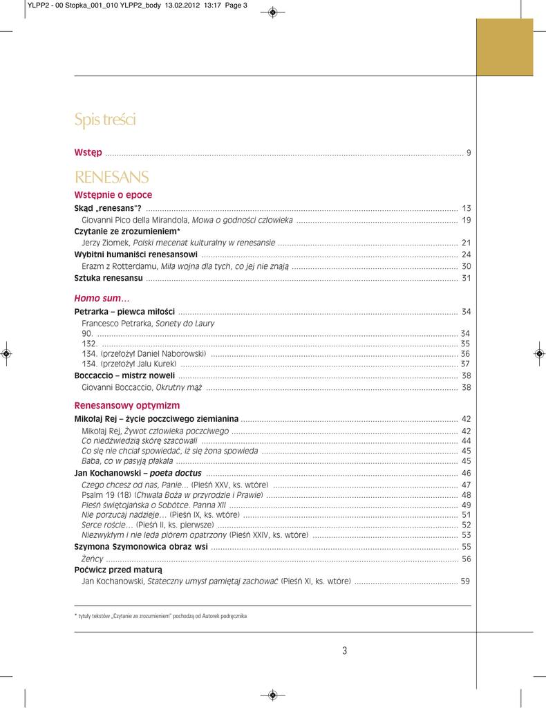 YLPP2 - 00 Stopka_001_010 YLPP2_body 13.02.2012 13:17 Page 3 Spis treści Wstęp ........................................................................................................................................................... 9 RENESANS Wstępnie o epoce Skąd „renesans”? ....................................................................................................................................... Giovanni Pico della Mirandola, Mowa o godności człowieka ...................................................................... Czytanie ze zrozumieniem* Jerzy Ziomek, Polski mecenat kulturalny w renesansie .............................................................................. Wybitni humaniści renesansowi ............................................................................................................... Erazm z Rotterdamu, Miła wojna dla tych, co jej nie znają ........................................................................ Sztuka renesansu ....................................................................................................................................... 13 19 21 24 30 31 Homo sum… Petrarka – piewca miłości ......................................................................................................................... 34 Francesco Petrarka, Sonety do Laury 90. ............................................................................................................................................................ 34 132. .......................................................................................................................................................... 35 134. (przełożył Daniel Naborowski) ........................................................................................................... 36 134. (przełożył Jalu Kurek) ........................................................................................................................ 37 Boccaccio – mistrz noweli ......................................................................................................................... 38 Giovanni Boccaccio, Okrutny mąż ............................................................................................................. 38 Renesansowy optymizm Mikołaj Rej – życie poczciwego ziemianina .............................................................................................. 42 Mikołaj Rej, Żywot człowieka poczciwego .................................................................................................. 42 Co niedźwiedzią skórę szacowali ............................................................................................................... 44 Co się nie chciał spowiedać, iż się żona spowieda ..................................................................................... 45 Baba, co w pasyją płakała .......................................................................................................................... 45 Jan Kochanowski – poeta doctus ............................................................................................................. 46 Czego chcesz od nas, Panie... (Pieśń XXV, ks. wtóre) ................................................................................ 47 Psalm 19 (18) (Chwała Boża w przyrodzie i Prawie) ................................................................................... 48 Pieśń świętojańska o Sobótce. Panna XII ................................................................................................... 49 Nie porzucaj nadzieje… (Pieśń IX, ks. wtóre) ............................................................................................. 51 Serce roście… (Pieśń II, ks. pierwsze) ........................................................................................................ 52 Niezwykłym i nie leda piórem opatrzony (Pieśń XXIV, ks. wtóre) ............................................................... 53 Szymona Szymonowica obraz wsi .......................................................................................................... 55 Żeńcy ........................................................................................................................................................ 56 Poćwicz przed maturą Jan Kochanowski, Stateczny umysł pamiętaj zachować (Pieśń XI, ks. wtóre) ............................................. 59 * tytuły tekstów „Czytanie ze zrozumieniem” pochodzą od Autorek podręcznika 3 YLPP2 - 00 Stopka_001_010 YLPP2_body 13.02.2012 13:17 Page 4 Spis treści W służbie ojczyźnie Patriotyczna i obywatelska troska mistrza z Czarnolasu ....................................................................... Jan Kochanowski, Pieśń o spustoszeniu Podola (Pieśń V, ks. wtóre) ......................................................... Wy, którzy pospolitą rzeczą władacie... (Pieśń XIV, ks. wtóre) ................................................................... Pieśń o dobrej sławie (Pieśń XIX, ks. wtóre) ............................................................................................... Profetyczny styl księdza Skargi ................................................................................................................ Kazanie wtóre. O miłości ku ojczyźnie i o pierwszej chorobie Rzeczypospolitej, która jest z nieżyczliwości ku ojczyźnie ...................................................................................................... Jak poprawić Rzeczpospolitą? .................................................................................................................. Andrzej Frycz Modrzewski, O poprawie Rzeczypospolitej .......................................................................... Tomasz Morus, Utopia ......................................................................................
