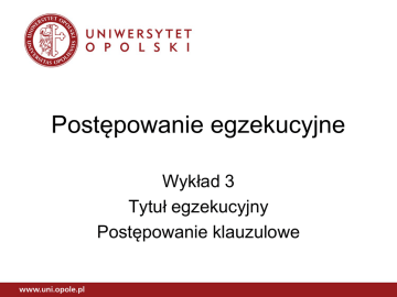 Postępowanie egzekucyjne Wykład 3 Tytuł egzekucyjny Postępowanie klauzulowe Tytuł egzekucyjny - pojęcie • Dokument urzędowy • Wskazujący roszczenie wierzyciela i obowiązek dłużnika • Zawierający stwierdzenie, że dany obowiązek nadaje się do wykonania w drodze egzekucji • Zawierający zrozumiałą treść Rodzaje tytułów egzekucyjnych (art. 777 KPC) • Sądowe tytuły egzekucyjne – Prawomocne lub natychmiastowo wykonalne orzeczenie sądu lub ugoda – Orzeczenie referendarza • Pozasądowe tytuły egzekucyjne – Wyroki sądów polubownych – Akt notarialny – Inne ugody, akty orzeczenia Rodzaje tytułów egzekucyjnych II • Krajowe tytuły egzekucyjne – Sądowe – Pozasądowe • Zagraniczne tytuły egzekucyjne 1145’ – Orzeczenia sądów państw członków UE – Ugody przed takimi sądami – Dokumenty opatrzone zaświadczeniem europejskiego tytułu wykonawczego Orzeczenia • Sądu – Prawomocne – Natychmiastowo wykonalne (492 par 3, art. 578, 333) – W postępowaniu grupowym – wyciąg z wyroku wskazujący wysokość świadczeń • Referendarza – Nakazy zapłaty w upominawczym – Postanowienia w przedmiocie kosztów Sąd polubowny – orzeczenia i ugody • Odmowa nadania klauzuli(PL) – Naruszenie praw osób trzecich – Porządek publiczny • Orzeczenie zagraniczne: – Brak lub wadliwość zapisu arbitrażowego – Sąd orzekł poza zakresem kognicji – Brak możliwości obrony praw – Sprzecznosć z prawem – Wyrok jeszcze nie wiąże stron Tytuły pozasądowe I • Wyciągi z listy wierzytelności w postępowaniu upadłościowym i naprawczym • Ugody przed komisją pojednawczą ds. załatwiania sporów ze stosunku pracy • Ugody zawarte przed geodetą • Zatwierdzony plan podziału funduszu ograniczenia odpowiedzialności za roszczenia morskie Tytuły pozasądowe II • • • • Adminstracyjny tytuł wykonawczy Orzeczenia Komisji Majątkowej Notarialny tytuł egzekucyjny Ugody bankowe (restrukturyzacja finansowa przedsiebiorstw i banków hist.) • Bankowy tytuł egzekucyjny Postępowanie klauzulowe • Postępowanie klauzulowe = postępowanie umożliwiające wszczęcie i przeprowadzenie egzekucji. • Klauzula wykonalności: formalny wyraz dokonanej przez sąd oceny, czy dany tytuł egzekucyjny określający przysługujące wierzycielowi roszczenie nadaje się do przymusowego wykonania Wszczęcie postępowania • Wniosek wierzyciela – Istnienie przesłanek – Warunki umożliwiające nadanie klauzuli wykonalności • Przejście uprawnień – Wskazanie okoliczności we wniosku – Wskazanie dowodów – Przejście obowiązków także w wypadku ustanowienia kuratora spadku/wykonawcy Wszczęcie postępowania z urzędu • Jeżeli postępowanie zostało wszczęte (mogło być wszczęte) z urzędu 782 – Sąd opiekuńczy 570 – Zabezpieczenie spadku 635 par 1 • Obowiązek nadania klauzuli wykonalności z urzędu art. 447(6), 1082, 782 par. 2, 743 par 3 • Na wniosek 492 par. 3 Właściwość • Klauzulę wykonalności może nadać – Sąd – Referendarz (wyjątki: ugody przed mediatorem, arbitraż, 778’, 787, 787’, 788, 789 • Właściwość rzeczowa 781 par. 1 • Właściwość miejscowa: ogólna dłużnika • Termin: niezwłocznie (3 dni) Rodzaje rozstrzygnięć • Pozytywne – Uwzględnia wniosek w całości – Uwzględnia wniosek w części • Negatywne – Odrzucenie wniosku – Oddalenie wniosku – Umorzenie postępowania • Cofnięcie wniosku • Przesłanki negatywne ujawnione w toku post. Dalszy i ponowny tytuł wykonawczy • Dalszy tytuł – Na wniosek wierzyciela – W celu prowadzenia egzekucji wobec • Kilku dłużników • Różnych składników majątkowych • Ponowny tytuł 794 – W miejsce zaginionego, utraconego, zniszczonego – Bada się tylko fakt utraty tytułu Zagraniczne tytuły wykonawcze • Rozporządzenia Rady WE – jurysdykcja, uznawalność i wykonalność • w sprawach cywilnych i handlowych • W sprawach małżeńskich – Europejski Tytuł Egzekucyjny dla roszczeń bezspornych • KPC (1145 – 1153(2)) KPC • Exequatur sądu polskiego 1150 • Właściwość: sąd okręgowy miejsca zamieszkania dłużnika • Dowód wykonalności w państwie wydania • Przekłady • 1153’ kpc – ETE nie wymaga exequatur. Orzeka SR FINIS