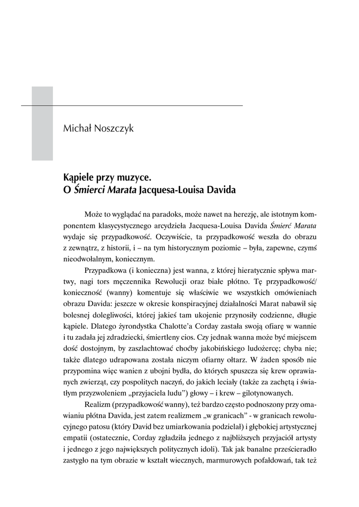 Michał Noszczyk Kąpiele przy muzyce. O Śmierci Marata Jacquesa-Louisa Davida Może to wyglądać na paradoks, może nawet na herezję, ale istotnym komponentem klasycystycznego arcydzieła Jacquesa-Louisa Davida Śmierć Marata wydaje się przypadkowość. Oczywiście, ta przypadkowość weszła do obrazu z zewnątrz, z historii, i – na tym historycznym poziomie – była, zapewne, czymś nieodwołalnym, koniecznym. Przypadkowa (i konieczna) jest wanna, z której hieratycznie spływa martwy, nagi tors męczennika Rewolucji oraz białe płótno. Tę przypadkowość/ konieczność (wanny) komentuje się właściwie we wszystkich omówieniach obrazu Davida: jeszcze w okresie konspiracyjnej działalności Marat nabawił się bolesnej dolegliwości, której jakieś tam ukojenie przynosiły codzienne, długie kąpiele. Dlatego żyrondystka Chalotte’a Corday zastała swoją ofiarę w wannie i tu zadała jej zdradziecki, śmiertleny cios. Czy jednak wanna może być miejscem dość dostojnym, by zaszlachtować choćby jakobińskiego ludożercę; chyba nie; także dlatego udrapowana została niczym ofiarny ołtarz. W żaden sposób nie przypomina więc wanien z ubojni bydła, do których spuszcza się krew oprawianych zwierząt, czy pospolitych naczyń, do jakich leciały (także za zachętą i światłym przyzwoleniem „przyjaciela ludu”) głowy – i krew – gilotynowanych. Realizm (przypadkowość wanny), też bardzo często podnoszony przy omawianiu płótna Davida, jest zatem realizmem „w granicach” - w granicach rewolucyjnego patosu (który David bez umiarkowania podzielał) i głębokiej artystycznej empatii (ostatecznie, Corday zgładziła jednego z najbliższych przyjaciół artysty i jednego z jego największych politycznych idoli). Tak jak banalne prześcieradło zastygło na tym obrazie w kształt wiecznych, marmurowych pofałdowań, tak też Kąpiele przy muzyce. O śmierci Marata... 127 – zgodnie z potrzebami „realizmu w granicach” – nawet po śmierci dłoń Marata ściska gęsie pióro (prawdziwy oręż ideologicznej walki), a dłoń druga dzierży list, dzięki któremu morderczyni udało się podejść czujność rewolucjonisty, wymowny dowód nikczemności skazanego na historyczną klęskę reakcyjnego świata. Przypadkowe (i konieczne) wydaje się także to, że połowę – więcej niż połowę – płótna, wypełnia brunatne, prawie jednolite tło, o które „opiera się” malarska scena. Zapewne (i to znów byłaby, często podnoszona, kwestia realizmu tego klasycznie prostego przedstawienia) tak mogło naprawdę wyglądać miejsce, w którym Marat zażywał codziennych kąpieli. Gigantyczna brązowa plama (płótno jest dość sporych rozmiarów – 165 x 128,3 cm), niezrównoważona, niezwykle „nowoczesna” (w mojej opinii; nie mam pojęcia jak przyglądała się jej późnooświeceniowa publiczność) jest także potrzebna dla rozegrania bardzo dramatycznego kontrastu – to pod nią, pod tą ciężką ciemnością, umiera, a nawet umarło, rewolucyjne światło. Całe światło skupia się na Maracie (albo z niego bije; jakaś odbita odrobina rozproszy się nieznacznie w górnym prawym narożniku obrazu); wszystko, co z Maratem związane, jest świetliste, jasne albo białe: białe prześcieradło, na którym spoczywają zwłoki, białe pióro, bardzo jasny puplit do pisania z prawej strony obrazu, biała nawet kartka papieru (ów nieszczęsny list), którą ciągle trzyma w lewej dłoni, białe, płócienne hachimaki, turban czy zawój, którym owinięta jest głowa Marata. O rozmiarach – fizycznych – Śmierci Marata wspomniałem nie bez przyczyny. Konwent z pewnością zapłacił mu wynienić na: za ten, ponad metr kwadratowy mierzący, kawał brązowej farby. Do Termidora – momentu, w którym na długich lat pięć David popadnie w publiczną niełaskę – musi minąć jeszcze kilka miesięcy. Wtedy [o]dsuwa się od życia publicznego i w odosobnieniu maluje kolosalne płótno „Porwanie Sabinek”, wystawione w 1800 r. Udostępnia je publiczności we własnej pracowni za opłatą, co przyniosło mu 72 000 liwrów, sumę ogromną na owe czasy. (Interesujący jest jego proces z władzami skarbowymi, które uważały to za zarobek niedozwolony. W odwołaniu od ich decyzji pisze: „Sztuka musi się teraz karmić sama z siebie” - a więc nie może liczyć na mecenasów. Przytacza na swą obronę fakt, że muzykujący czerpią dochody z biletów na swe koncerty. Proces wygrywa.)1 Oczywiście, są w tym obrazie również elementy nie-przypadkowe (więcej: bezwzględnie konieczne); także takie, które – z realizmem nie mając nic wspólnego – ustanawiają fundament pod retoryczną siłę klasycystycznego przedstawienia. Przede wszystkim zwłoki Marata układają się w figurę, którą europejskie malarstwo zna na pamięć i bezbłędnie rozpoznaje: zwisające bezwładnie ramię, 1 K. Piwocki, Dzieje sztuki w zarysie. Tom 2. Od wieków średnich do końca XVIII w. Warszawa 1977, s. 335. 128 W KRĘGU KULTURY SPEKTAKLU oparta nań martwa głowa, drugie ramię przytulone – czy obejmujące – własny nagi tors (jakby w próbie jeszcze jednej, beznadziejnej i już całkiem zbytecznej, obrony przed bólem i poniżeniem): Chrystus zdjęty z krzyża (i przelewający się przez kolana Marii Magdaleny). To jeszcze może być przypadkowe, jeszcze nie rozsadza ram realizmu „fotografii z miejsca zbrodni”. Tym bardziej, że Maratowi-Chrystusowi brakuje bardzo istotnego elementu tej dobrze utrwalonej ikonografii: cierniowej korony. Choć w jakimś sensie, na pierwszy rzut oka, taką (przynajmniej malarską) rolę spełnia biały zawój na glowie Marata, białe hachimaki. W upozowaniu zwłok na zdjęte z krzyża ciało Chrystusa nie musi być nic bluźnierczego, czyniono to po wielekroć kierując się jak najbardziej zbożnymi przesłankami: tego rodzaju religijna teatralizacja śmierci miała wskazywać (często nie bez racji), iż zabi
