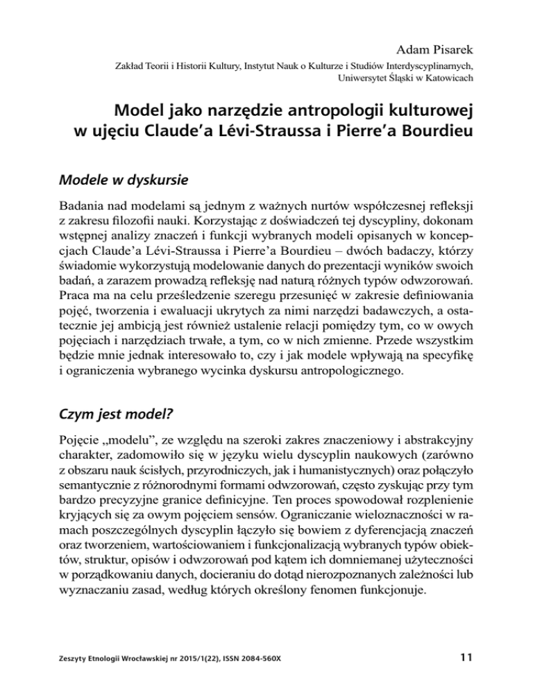 Adam Pisarek Zakład Teorii i Historii Kultury, Instytut Nauk o Kulturze i Studiów Interdyscyplinarnych, Uniwersytet Śląski w Katowicach Model jako narzędzie antropologii kulturowej w ujęciu Claude’a Lévi-Straussa i Pierre’a Bourdieu Modele w dyskursie Badania nad modelami są jednym z ważnych nurtów współczesnej refleksji z zakresu filozofii nauki. Korzystając z doświadczeń tej dyscypliny, dokonam wstępnej analizy znaczeń i funkcji wybranych modeli opisanych w koncepcjach Claude’a Lévi-Straussa i Pierre’a Bourdieu – dwóch badaczy, którzy świadomie wykorzystują modelowanie danych do prezentacji wyników swoich badań, a zarazem prowadzą refleksję nad naturą różnych typów odwzorowań. Praca ma na celu prześledzenie szeregu przesunięć w zakresie definiowania pojęć, tworzenia i ewaluacji ukrytych za nimi narzędzi badawczych, a ostatecznie jej ambicją jest również ustalenie relacji pomiędzy tym, co w owych pojęciach i narzędziach trwałe, a tym, co w nich zmienne. Przede wszystkim będzie mnie jednak interesowało to, czy i jak modele wpływają na specyfikę i ograniczenia wybranego wycinka dyskursu antropologicznego. Czym jest model? Pojęcie „modelu”, ze względu na szeroki zakres znaczeniowy i abstrakcyjny charakter, zadomowiło się w języku wielu dyscyplin naukowych (zarówno z obszaru nauk ścisłych, przyrodniczych, jak i humanistycznych) oraz połączyło semantycznie z różnorodnymi formami odwzorowań, często zyskując przy tym bardzo precyzyjne granice definicyjne. Ten proces spowodował rozplenienie kryjących się za owym pojęciem sensów. Ograniczanie wieloznaczności w ramach poszczególnych dyscyplin łączyło się bowiem z dyferencjacją znaczeń oraz tworzeniem, wartościowaniem i funkcjonalizacją wybranych typów obiektów, struktur, opisów i odwzorowań pod kątem ich domniemanej użyteczności w porządkowaniu danych, docieraniu do dotąd nierozpoznanych zależności lub wyznaczaniu zasad, według których określony fenomen funkcjonuje. Zeszyty Etnologii Wrocławskiej nr 2015/1(22), ISSN 2084-560X 11 Adam Pisarek Filozofowie nauki są zgodni, że badania nad rolą modeli w praktyce naukowej powinny być jednym z centralnych obszarów ich dociekań1, jednak problemy pojawiają się już w momencie, gdy mają jednoznacznie określić, co modelem jest, a co już nie. Wynika to przede wszystkim z opisanej wyżej heterogeniczności – jak zestawić ze sobą modele rozwojowe z modelami próbnymi, fenomenologicznymi, wyjaśniającymi, heurystycznymi, testowymi, idealizującymi, teoretycznymi, matematycznymi, ikonicznymi lub formalnymi?2 Jak mają się do nich takie formy jak diagramy, tabele synoptyczne, równania, programy komputerowe, organizmy a nawet laboratoryjne populacje?3 Roman Frigg i Stephan Hartmann sugerują przejrzyste rozwiązanie – by uniknąć chaosu, należy zadać kilka porządkujący pytań: 1) Co i jak dane modele przedstawiają? 2) Czym są owe modele? 3) O czym dany model mówi? Co tłumaczy, a co przemilcza? 4) Jak model ma się do teorii? Co charakteryzuje naukę, która opiera swoje dociekania na modelach?4 Według tego krótkiego zestawu zagadnień związanych z semantyką, ontologią, epistemologią i filozofią nauki, można dokonać wstępnych typologizacji, które ułatwiają zrozumienie wpływu wybranych atrybutów modelu na inne elementy konstrukcji naukowych. I tak, ze względu na obiekt, który jest reprezentowany, możemy wyróżnić modele fenomenu (odnoszące się zwykle do obserwowalnych zjawisk, np. model atomu Bohra, model DNA i RNA, model mostu, model atmosfery Lorenza), modele danych (często w formie poprawionej, skorygowanej, zorganizowanej i wyidealizowanej wersji faktów, które zostały zebrane w czasie obserwacji, np. modele big data) i modele teorii (przedstawiające to, o czym mówi teoria w często uproszczonej lub zmienionej formie; np. modele powstające z uwzględnieniem aksjomatów geome- 1 2 3 4 12 R. Frigg, S. Hartmann, Models in Science, [w:] The Stanford Encyclopedia of Philosophy, red. E. Zalta, Stanford 2012. Ibidem. Por. także R. Frigg, Models and Fiction, „Synthese” 2010, nr 172 (2). T. Knuuttila, Models, Representation, and Mediation, „Philosophy of Science Assoc. 19th Biennial Meeting – PSA2004: Contributed Papers (Austin, TX; 2004) > PSA 2004 Contributed Papers”, http://philsci-archive.pitt.edu/view/confandvol/91.html (data dostępu: 10.10.2013). R. Frigg, S. Hartmann, Models… Model jako narzędzie antropologii kulturowej w ujęciu Claude’a Lévi-Straussa i Pierre’a Bourdieu trii Euklidesowej)5. Ze względu na sposób odwzorowania Frigg i Hartmann proponują podział na: modele izomorficzne, modele oparte na podobieństwie i na różnicy skali, modele idealizacyjne („Arystotelesowskie” lub „Galileuszowe”6) lub analogiczne. Ze względu zaś na ich status ontyczny7: obiekty fizyczne (np. Cricksa i Watsona metalowy model DNA, hydrauliczny model ekonomii Phillipsa), obiekty fikcyjne (w tym „fikcje” w rozumieniu filozofii nauki8, np. przywoływany już model atomu Bohra, beztarciowe wahadło), struktury wywiedzione z teorii zbiorów (nazywane też modelami matematycznymi), opisy, równania. Według tego samego kryterium można dokonać rozróżnienia na modele rozumiane jako reprezentacje, mediatory i niejęzykowe byty – tzw. artefakty9, choć w tym przypadku różnicowanie jest dokonywane na poziomie metadyskursu i dotyczy statusu ontycznego modeli w ogóle. Przywołuję te podziały, bo choć wywołują wiele pytań, chciałem właśnie przez ich pryzmat scharakteryzować, w jaki sposób modele są konceptualizowane i używane w teorii strukturalnej Claude’a Lévi-Straussa oraz teorii praktyki Pierre’a Bourdieu. Traktuję to przedsięwzięcie jako punkt wyjścia dla badań dyskursu antropologicznego przez pryzmat różnorodnych modeli stworzonych i zaadaptowanych w jego ramach. Modeli, które bardzo często stają się