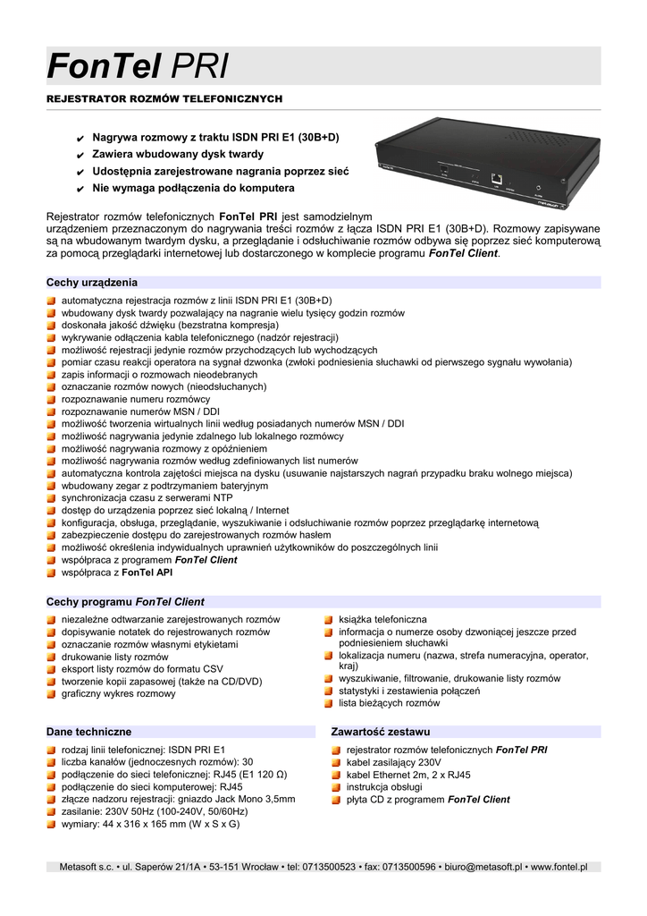 FonTel PRI REJESTRATOR ROZMÓW TELEFONICZNYCH ✔ Nagrywa rozmowy z traktu ISDN PRI E1 (30B+D) ✔ Zawiera wbudowany dysk twardy ✔ Udostępnia zarejestrowane nagrania poprzez sieć ✔ Nie wymaga podłączenia do komputera Rejestrator rozmów telefonicznych FonTel PRI jest samodzielnym urządzeniem przeznaczonym do nagrywania treści rozmów z łącza ISDN PRI E1 (30B+D). Rozmowy zapisywane są na wbudowanym twardym dysku, a przeglądanie i odsłuchiwanie rozmów odbywa się poprzez sieć komputerową za pomocą przeglądarki internetowej lub dostarczonego w komplecie programu FonTel Client. Cechy urządzenia automatyczna rejestracja rozmów z linii ISDN PRI E1 (30B+D) wbudowany dysk twardy pozwalający na nagranie wielu tysięcy godzin rozmów doskonała jakość dźwięku (bezstratna kompresja) wykrywanie odłączenia kabla telefonicznego (nadzór rejestracji) możliwość rejestracji jedynie rozmów przychodzących lub wychodzących pomiar czasu reakcji operatora na sygnał dzwonka (zwłoki podniesienia słuchawki od pierwszego sygnału wywołania) zapis informacji o rozmowach nieodebranych oznaczanie rozmów nowych (nieodsłuchanych) rozpoznawanie numeru rozmówcy rozpoznawanie numerów MSN / DDI możliwość tworzenia wirtualnych linii według posiadanych numerów MSN / DDI możliwość nagrywania jedynie zdalnego lub lokalnego rozmówcy możliwość nagrywania rozmowy z opóźnieniem możliwość nagrywania rozmów według zdefiniowanych list numerów automatyczna kontrola zajętości miejsca na dysku (usuwanie najstarszych nagrań przypadku braku wolnego miejsca) wbudowany zegar z podtrzymaniem bateryjnym synchronizacja czasu z serwerami NTP dostęp do urządzenia poprzez sieć lokalną / Internet konfiguracja, obsługa, przeglądanie, wyszukiwanie i odsłuchiwanie rozmów poprzez przeglądarkę internetową zabezpieczenie dostępu do zarejestrowanych rozmów hasłem możliwość określenia indywidualnych uprawnień użytkowników do poszczególnych linii współpraca z programem FonTel Client współpraca z FonTel API Cechy programu FonTel Client niezależne odtwarzanie zarejestrowanych rozmów dopisywanie notatek do rejestrowanych rozmów oznaczanie rozmów własnymi etykietami drukowanie listy rozmów eksport listy rozmów do formatu CSV tworzenie kopii zapasowej (także na CD/DVD) graficzny wykres rozmowy Dane techniczne rodzaj linii telefonicznej: ISDN PRI E1 liczba kanałów (jednoczesnych rozmów): 30 podłączenie do sieci telefonicznej: RJ45 (E1 120 Ω) podłączenie do sieci komputerowej: RJ45 złącze nadzoru rejestracji: gniazdo Jack Mono 3,5mm zasilanie: 230V 50Hz (100-240V, 50/60Hz) wymiary: 44 x 316 x 165 mm (W x S x G) książka telefoniczna informacja o numerze osoby dzwoniącej jeszcze przed podniesieniem słuchawki lokalizacja numeru (nazwa, strefa numeracyjna, operator, kraj) wyszukiwanie, filtrowanie, drukowanie listy rozmów statystyki i zestawienia połączeń lista bieżących rozmów Zawartość zestawu rejestrator rozmów telefonicznych FonTel PRI kabel zasilający 230V kabel Ethernet 2m, 2 x RJ45 instrukcja obsługi płyta CD z programem FonTel Client Metasoft s.c. • ul. Saperów 21/1A • 53-151 Wrocław • tel: 0713500523 • fax: 0713500596 • [email protected] • www.fontel.pl