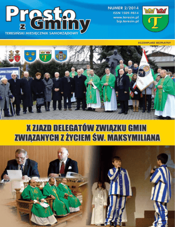 X Zjazd Gmin Kolbiańskich W niedzielę 16 lutego Niepokalanów gościł delegacje władz Zduńskiej Woli, Pabianic, Oświęcimia i Gminy Teresin. W roku 120 urodzin i w związku z 73. rocznicą aresztowania o. Kolbe odbył się tu X Zjazd Delegatów Związku Gmin Związanych z Życiem św. Maksymiliana. Gospodarzem Zjazdu były władze samorządowe gminy Teresin na czele z wójtem Markiem Olechowskim oraz Klasztor OO. Franciszkanów w Niepokalanowie. W części roboczej Zjazdu delegaci zdecydowali o wdrożeniu działań mających na celu rozszerzenie kręgu członków Związku Gmin Kolbiańskich. W tym celu do samorządów trzech miast – Nieszawy, Krakowa i Zakopanego zostanie wysłany list intencyjny z zaproszeniem do wstąpienia w struktury Związku. Są to kolejne gmin i miasta, których historia wiąże się z postacią św. Maksymiliana. Związek udzieli też wsparcia finansowego w celu wydania Albumu o Niepokalanowie. Delegaci podjęli uchwałę o organizacji tegorocznego biegu MAKSYMILA w Zduńskiej Woli. Zarząd Związku podjął także uchwałę o przyznaniu dwóch nagród im. św. Maksymiliana. „Nagrody te tradycyjnie otrzymują osoby i instytucję, które niestrudzenie podtrzymują pamięć i popularyzują postać o. Maksymiliana Kolbe, patrona naszych czasów” – wyjaśnił gospodarz Zjazdu wójt gminy Teresin Marek Olechowski. W tym roku otrzymali je o. Mirosław Bartos, gwardian Niepokalanowa oraz Radio Niepokalanów. Uhonorowanie nagrodzonych miało miejsce podczas uroczystej Mszy świętej w Bazylice Mniejszej. Przewodniczył jej o. Wiesław Pyzio, prowincjał Franciszkańskiej Warszawskiej Prowincji Matki Bożej Niepokalanej. Liturgię uświetnił zespół muzyczno-wokalny „Miriam” pod kierownictwem o. Karola Olborskiego. Po zakończeniu Mszy św. delegacje władz samorządowych, duchownych, Honorowi Obywatele Gminy Teresin, dyrektorzy i uczniowie szkół uroczyście złożyli kwiaty przy pomniku św. Maksymiliana. Zjazd zakończył się w sali św. Bonawentury, gdzie uczniowie pod opieką swych nauczycieli ze Szkoły Podstawowej im. św. M. Kolbego w Teresinie wystawili spektakl zatytułowany „Sceny z życia św. Maksymiliana”. Młodych aktorów nagrodzono gromkimi brawami, a także słodyczami, które przygotował dla nich wicewójt Marek Jaworski. Przypomnijmy, iż Związek założony został w 2005 roku. Tworzą go Miasta – Zduńska Wola, Pabianice, Oświęcim, a także Gmina Teresin. Przewodniczącym Zarządu Związku jest Zbigniew Dychto, prezydent Pabianic. red TERESIŃSKI MIESIĘCZNIK SAMORZĄDOWY Muzycznie uczcili pamięć bł. Jana Pawła II Pod honorowym patronatem starosty sochaczewskiego Tadeusza Korysia oraz wójta gminy Teresin Marka Olechowskiego w dniu 3 lutego odbył się w Szymanowie koncert zatytułowany „Niechaj zstąpi Duch Twój…”. Organizatorem koncertu była Fundacja „Ave Patria”. W Sanktuarium Najświęt- szej Maryi Panny Jazłowieckiej w Szymanowie wystąpili: Anna Pioterczak (sopran), Patrycja Baczewska (organy) oraz Aleksander Kamedulski (baryton). Ponadgodzinny koncert poświęcony był pamięci błogosławionego Jana Pawła II i miał przypomnieć o dacie kanonizacji w dniu 27 kwietnia br. W repertuarze tego wyjątkowego zespołu znalazły się pieśni religijne oraz kolędy wykonane w duecie. Nie zabrakło też wspólnie odśpiewanej „Barki”, ulubionej pieśni błogosławionego Jana Pawła II. red fot. Starostwo Powiatowe Sochaczew 4 PROSTO Z GMINY TERESIŃSKI MIESIĘCZNIK SAMORZĄDOWY Partnerzy Karty 3+ Lista firm, które wspierają Rodziny 3+ na terenie gminy Teresin: • Sklepy EFEKT PLUS –ul. o. Maksymiliana Kolbego w Paprotni, ul. Kaska i ul. Zielona w Teresinie, ul. Szkolna w Szymanowie; 5% zniżki na wszystkie towary oprócz wyrobów alkoholowych i tytoniowych, kart telefonicznych, cukru oraz artykułów promocyjnych. • Sklep ABRAKADABRA Robert Króliczak – ul. Szymanowska 7 w Teresinie, 5% zniżki na cały asortyment. • Sklep odzieżowy HOKUS Agnieszka Króliczak – ul. Szymanowska 7 w Teresinie, 5% zniżki na cały asortyment. • Sklep BIELIZNA Paweł Liberadzki – ul. Szymanowska 8 w Teresinie, 5% zniżki na cały asortyment. • Sklep KACPER Kamil Króliczak – ul. Szymanowska 19 w Teresinie, 10% zniżki na obuwie z wyjątkiem skórzanego, 5% zniżki na obuwie skórzane. Rabat nie dotyczy artykułów objętych promocją. • Pizzeria PIERROT – ul. Lipowa w Teresinie, zniżka 10% oprócz wyrobów alkoholowych i tytoniowych. • Nadzory i projekty budowlane Józef Górzyński – Elżbietów 15, zniżka 10%. • Ośrodek Kształcenia Kierowców MAKO Leszek Ćwikliński (nauka jazdy, jazdy doszkalające, płyta poślizgowa) – ul. 1 Maja 27a, zniżka 5% na lekcje nauki jazdy + 2 godziny gratis. • Sklep odzieżowo-obuwniczy RedStar – ul. Szymanowska 1 w Teresinie, zniżka 8% na cały asortyment, • Sklep wielobranżowy Hanna Guzik – ul. Szymanowska 2 w Teresinie, zniżka 5% na podręczniki i artykuły szkolne, oraz lektury • Firma ITSERV.PL Paweł Rudnicki – ul. Brata Cherubina Pawłowicza 10 w Teresinie, zniżka 10% na serwis oraz 3% na zakup sprzętu komputerowego, • Firma PIGUŁKA – ul. Szymanowska 29 w Teresinie, zniżka 20% na wstęp do Fitness Club „SLIMKA”, 10% zniżki na wypożyczenie sprzętu sportowego oraz 5% na zakup suplementów dla sportowców. • Poprawki krawieckie „U KASI” – ul. Perłowa 22 w Paprotni, zniżka 10% na wykonywane usługi krawieckie. • Stomatologia, lekarz dentysta Mariusz Cierech – ul. Szymanowska, budynek TER-MED, 20% zniżki na usługi dentystyczne, • Kwiaciarnia ALICJA – ul. Cmentarna w Paprotni, 10% zniżki na wszystkie artykuły • Nauka języka angielskiego Honorata Mrowińska – ul. Południowa 47, Granice, 30% zniżki na zajęcia indywidualne dla dorosłych • Niepubliczne Przedszkole LEŚNA AKADEMIA – Aleja XX-lecia 3 w Teresi- nie, 15% zniżki na czesne • Usługi fryzjerskie damsko-męskie Edyta Kosińska