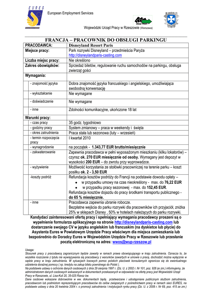 European Employment Services Wojewódzki Urząd Pracy w Rzeszowie (Warszawa) FRANCJA – PRACOWNIK DO OBSŁUGI PARKINGU PRACODAWCA: Miejsce pracy: Liczba miejsc pracy: Zakres obowiązków: Disneyland Resort Paris Park rozrywki Disneyland – przedmieścia Paryża http://disneylandparis-casting.com Nie określono Sprzedaż biletów, regulowanie ruchu samochodów na parkingu, obsługa zwierząt gości Wymagania: - wykształcenie Dobra znajomość języka francuskiego i angielskiego, umożliwiająca swobodną konwersację Nie wymagane - doświadczenie Nie wymagane - inne Zdolności komunikacyjne, ukończone 18 lat - znajomość języka Warunki pracy: - czas pracy - godziny pracy - okres zatrudnienia - termin rozpoczęcia pracy - wynagrodzenie - zakwaterowanie 35 godz. tygodniowo System zmianowy – praca w weekendy i święta Praca stała lub sezonowa (luty – wrzesień) I kwartał 2010 na początek - 1.343,77 EUR brutto/miesięcznie Zapewnia pracodawca w pełni wyposażonym mieszkaniu (kilku lokatorów) – czynsz ok. 270 EUR miesięcznie od osoby. Wymagany jest depozyt w wysokości 200 EUR – do zwrotu przy wyprowadzce. - wyżywienie Możliwość korzystania ze stołówki pracowniczej na terenie parku – koszt posiłku ok. 2 - 3,50 EUR -koszty podróż Refundacja kosztów podróży do Francji na podstawie dowodu opłaty – w przypadku umowy na czas nieokreślony - max. do 76,22 EUR w przypadku pracy sezonowej - max. do 152,45 EUR. Refundacja kosztów dojazdu do pracy środkami transportu publicznego do 65 % miesięcznie. - inne Pracodawca zapewnia ubranie robocze. Bezpłatne wejścia do parku rozrywki dla pracowników ich przyjaciół, zniżka 25% w sklepach Disney , 50% w hotelach należących do parku rozrywki. Kandydaci zainteresowani ofertą pracy i spełniający wymagania pracodawcy proszeni są o wypełnienie formularza aplikacyjnego na stronie http://disneylandparis-casting.com lub dostarczenie swojego CV w języku angielskim lub francuskim (na dyskietce lub płycie) do Asystenta Eures w Powiatowym Urzędzie Pracy właściwym dla miejsca zamieszkania lub bezpośrednio do Doradcy Eures w Wojewódzkim Urzędzie Pracy w Rzeszowie lub przesłanie pocztą elektroniczną na adres: [email protected] Uwaga: Stosunek pracy z pracodawcą zagranicznym będzie zawarty w ramach prawa obowiązującego w kraju zatrudnienia. Oznacza to, że wszelkie roszczenie z tytułu nie wywiązywania się pracodawcy z warunków zawartych w umowie o pracę, dochodzić można wyłącznie w sądzie pracy w kraju zatrudnienia. W sytuacjach losowych pomoc polskich placówek konsularnych ogranicza się do ewentualnego udzielenia doraźnej pomocy ( np. kredytu na zakup biletu powrotnego do Polski ). Na podstawie ustawy o ochronie danych osobowych z dnia 29 sierpnia 1997 r. (Dz. U. z 2002 r. Nr 101, poz. 926 ze zm.) informujemy, że administratorem danych osobowych wskazanych w dokumentach przekazanych w odpowiedzi na ofertę pracy jest Wojewódzki Urząd Pracy w Rzeszowie, ul. Lisa-Kuli 20, 35-025 Rzesz ów. Dane osobowe wskazane dobrowolnie w ww. dokumentach będą przetwarzane i udostępniane publicznym służbom zatrudnienia, pracodawcom lub podmiotom reprezentującym pracodawców do celów związanych z pośrednictwem pracy w ramach sieci EURES, na podstawie ustawy z dnia 20 kwietnia 2004 r. o promocji zatrudnienia i instytucjach rynku pracy (Dz. U. z 2008 r. Nr 69, poz. 415 ze zm.) przez okres konieczny do osiągnięcia celu określonego w przedmiotowej ustawie..Osobie, której dane osobowe dotyczą przysługuje prawo dostępu do ich treści i prawo ich poprawiania. OFERTA WAŻNA DO ODWOŁANIA www.eures.europa.eu www.wup-rzeszow.pl